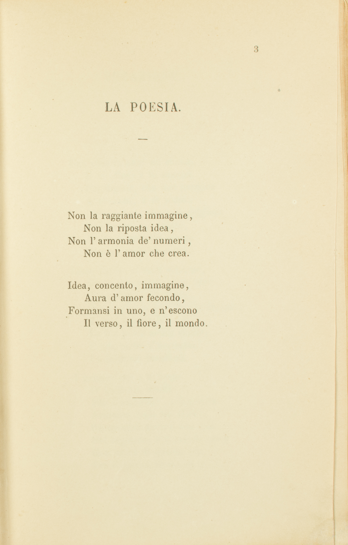 Non la raggiante immagine,Non la riposta idea,Non l’armonia de’ numeri,Non è l’amor che crea.Idea, concento, immagine,Aura d’amor fecondo,Formansi in uno, e n’esconoIl verso, il fiore, il mondo.