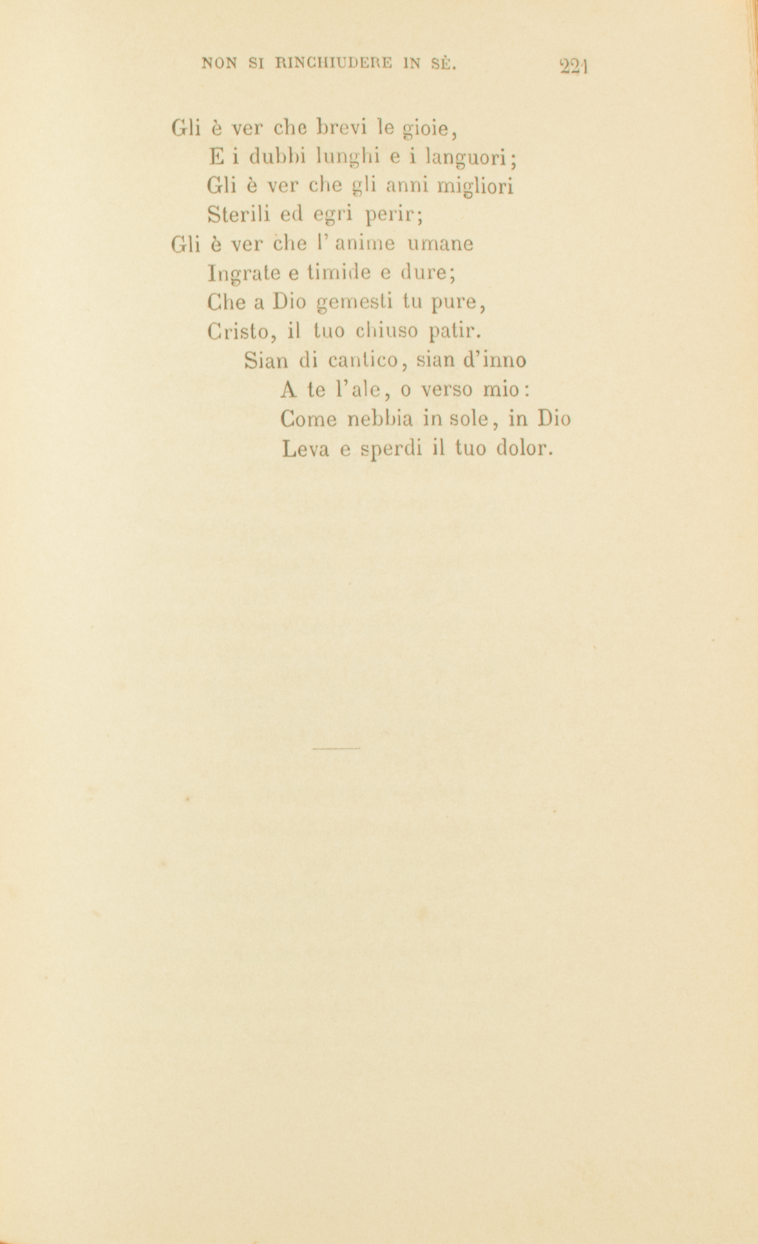 Squallido manto di nubiGrava le spalle del monte;Alto la chioma e la fronteSplende nel libero sol.Pesa sul cuor, ma non puoteSpegnere i baldi pensieri,Premer gli affetti sinceri,L’uggia nebbiosa del duol.E pur c’è cui troppo suonaLamentoso il verso mio,Che, di me parlando a Dio,Par che oblii gli altrui dolor’.Nè val che d’opra benignaRicche, e di lagrime pie,Dal cor non fiacco le mieVoci movessero al ciel.Sdegna un drappello di fortiLe voci querule mie,D’opre e di lagrime pieRicco, e ne’ rischi fedel.Lascia l’ombre; e, sole o nembo,Tenta l’alto, o verso mio:Spera, esulta; o narra a DioNon il tuo, gli altrui dolor’.Gli è ver che brevi le gioie,E i dubbi lunghi e i languori;Gli è ver che gli anni miglioriSterili ed egri perir;Gli è ver che l’anime umaneIngrate e timide e dure;Che a Dio gemesti tu pure,Cristo, il tuo chiuso patir.Sian di cantico, sian d’innoA te l’ale, o verso mio:Come nebbia in sole, in DioLeva e sperdi il tuo dolor.