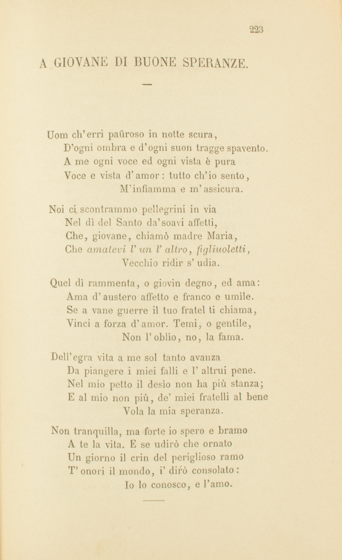 Uom ch’erri paüroso in notte scura,D’ogni ombra e d’ogni suon tragge spavento.A me ogni voce ed ogni vista è puraVoce e vista d’amor: tutto ch’io sento,M’infiamma e m’assicura.Noi ci scontrammo pellegrini in viaNel dì del Santo da’ soavi affetti,Che, giovane, chiamò madre Maria,Che amatevi l’un l’altro, figliuoletti,Vecchio ridir s’udia.Quel dì rammenta, o giovin degno, ed ama:Ama d’austero affetto e franco e umile.Se a vane guerre il tuo fratel ti chiama,Vinci a forza d’amor. Temi, o gentile,Non l’oblìo, no, la fama.Dell’egra vita a me sol tanto avanzaDa piangere i miei falli e l’altrui pene.Nel mio petto il desìo non ha più stanza;E al mio non più, de’ miei fratelli al beneVola la mia speranza.Non tranquilla, ma forte io spero e bramoA te la vita. E se udirò che ornatoUn giorno il crin del periglioso ramoT’onori il mondo, i’ dirò consolato:Io lo conosco, e l’amo.