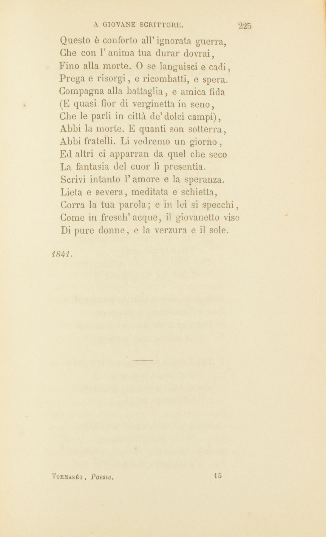 Un guardo al cielo e al monte, uno alla via;Non la testa sempr’alta. I nostri orgogliTemiam, no l’ire nè l’insidie altrui.In questo libro che ci scrisse Iddio,Ove il color favella e il suon dipinge,Leggiamo amor, fratello. Anco la penaÈ alito d’amor: gli Angeli santi,Cui quest’umil pianeta è dato in cura,Passan volando; e chi soverchio alteraLeva la fronte, col ventar dell’ala,Senza punto toccar, mandano a terra.Queta, se vien da Dio, queta e di moltiSecoli regnatrice, è la speranza.Sia fidente il dolor: che fa se il fruttoNe coglieran domani o tra mill’anni?Dono di spirti e di virtuti ignoteÈ il ben che noi circonda. E l’aër puroChe fa ne’ polsi palpitar la vita,Non si tocca con mani, occhio nol vede.Non ch’altri il sappia, ma che il cuore accolgaCon casta gioia il bene, e l’offra a Dio,Questa è gloria verace: e non applausoDi poche mani o susurrar di labbra,Ma degli Angeli il canto per gl’immensiMondi e per gli anni eterni la diffonde.Questo è conforto all’ignorata guerra,Che con l’anima tua durar dovrai,Fino alla morte. O se languisci e cadi,Prega e risorgi, e ricombatti, e spera.Compagna alla battaglia, e amica fida(E quasi fior di verginetta in seno,Che le parli in città de’ dolci campi),Abbi la morte. E quanti son sotterra,Abbi fratelli. Li vedremo un giorno,Ed altri ci apparran da quel che secoLa fantasia dei cuor li presentìa.Scrivi intanto l’amore e la speranza.Lieta e severa, meditata e schietta,Corra la tua parola; e in lei si specchi,Come in fresch’acque, il giovanetto visoDi pure donne, e la verzura e il sole.1841.