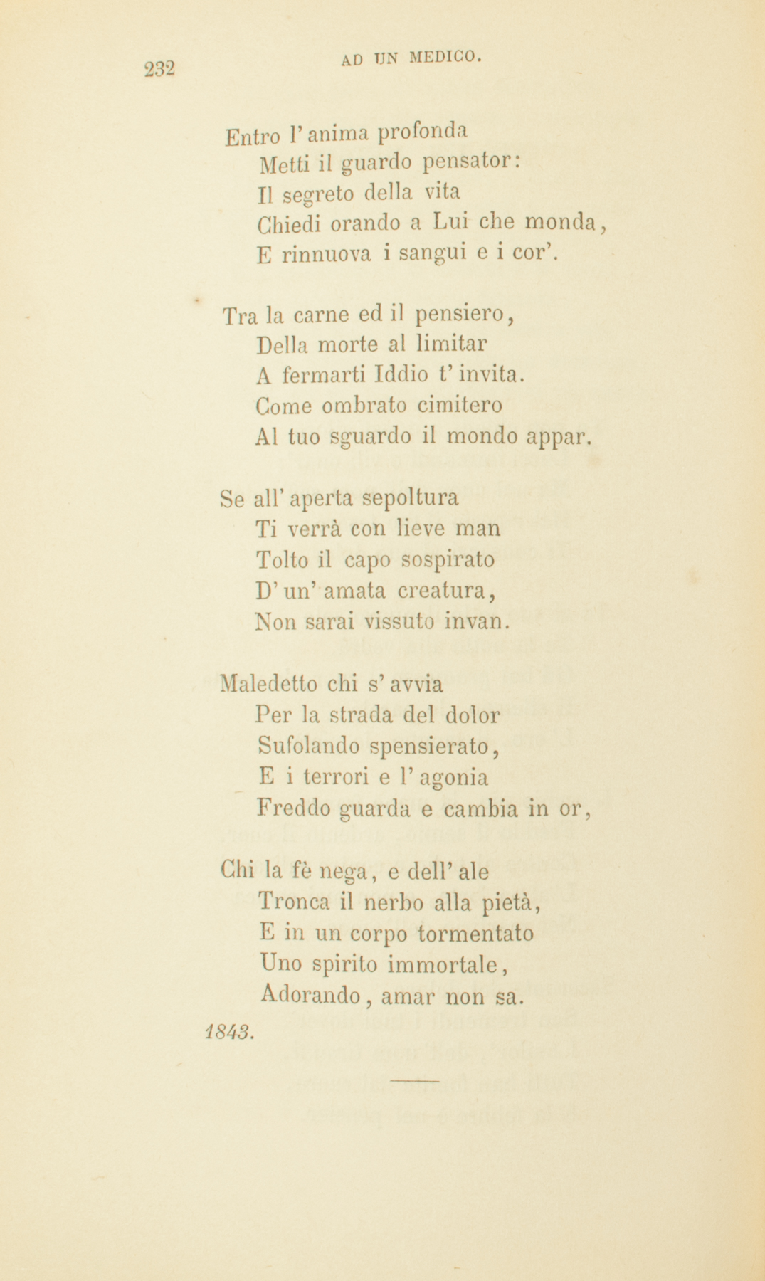 Tu non chiedi a quest’alloroLucri immondi o vili onor’:Ma nel cuor dell’uom soffrenteHai riposto il tuo tesoro;Ti consacri al suo dolor.Te al suo letto il nuovo sole,Te la notte alta vedrà.Gli hai promesso il cuor, la mente,Il silenzio, le parole,L’oro, il sangue, la pietà.L’occhio pio, la mano franca,Freddo il senno, ardente il cuor.Contro al tedio e contro agli anniL’alma forte, e non mai stancaNel martirio dell’amor.Sacerdote del dolore,Son tremendi i tuoi dover’.I malor’, dell’uom tiranni,Tutti han fomite dal cuore,E la febbre è nel pensier.Entro l’anima profondaMetti il guardo pensator:Il segreto della vitaChiedi orando a Lui che monda,E rinnuova i sangui e i cor’.Tra la carne ed il pensiero,Della morte al limitarA fermarti Iddio t’invita.Come ombrato cimiteroAl tuo sguardo il mondo appar.Se all’aperta sepolturaTi verrà con lieve manTolto il capo sospiratoD’un’amata creatura,Non sarai vissuto invan.Maledetto chi s’avviaPer la strada del dolorSufolando spensierato,E i terrori e l’agoniaFreddo guarda e cambia in or,Chi la fè nega, e dell’aleTronca il nerbo alla pietà,E in un corpo tormentatoUno spirito immortale,Adorando, amar non sa.1843.