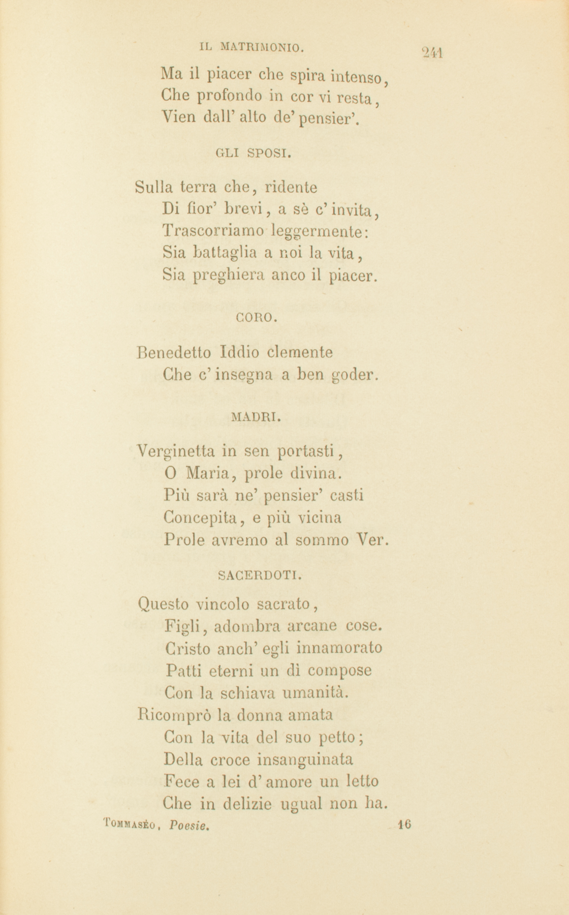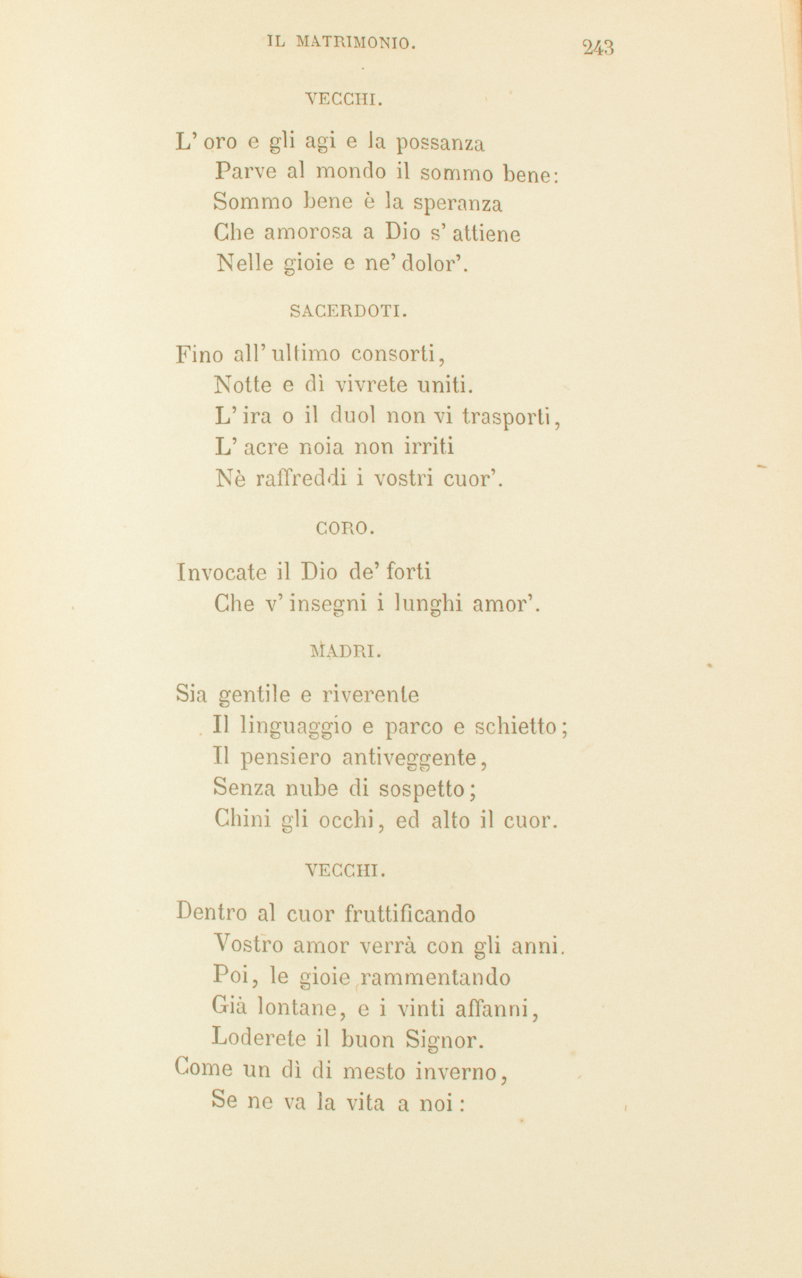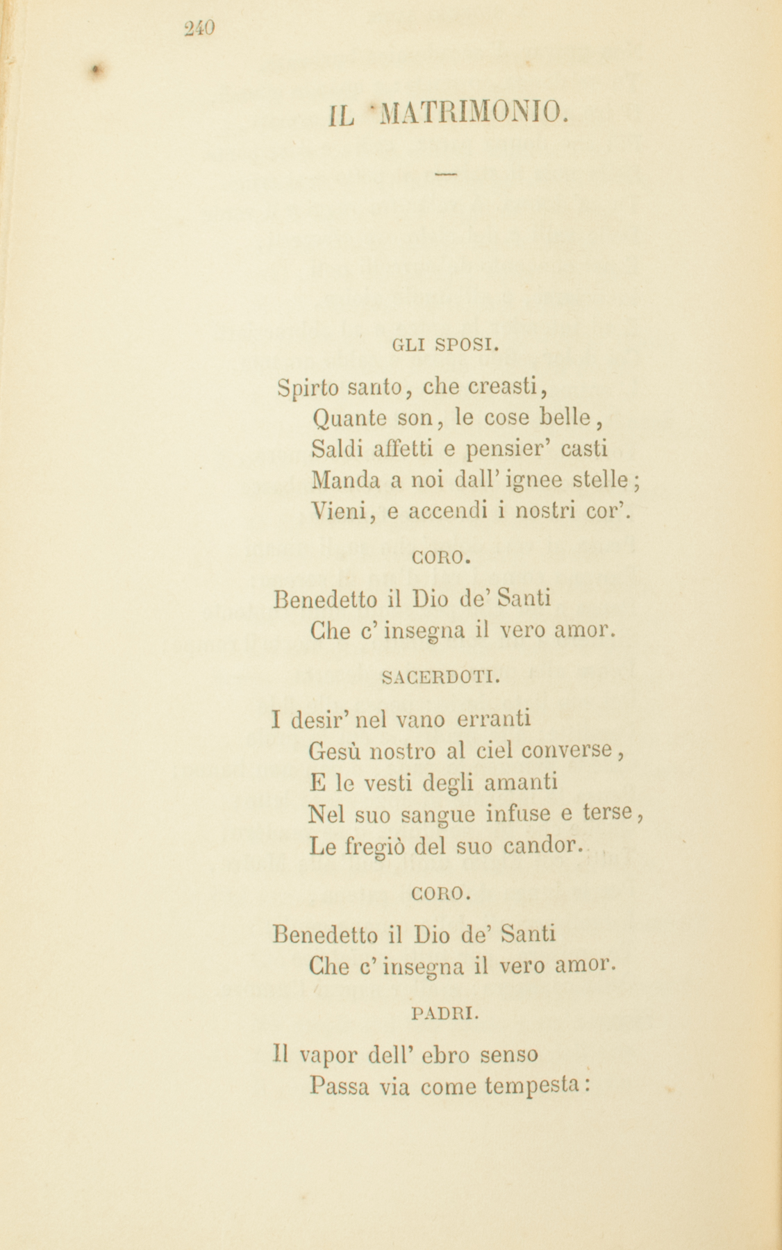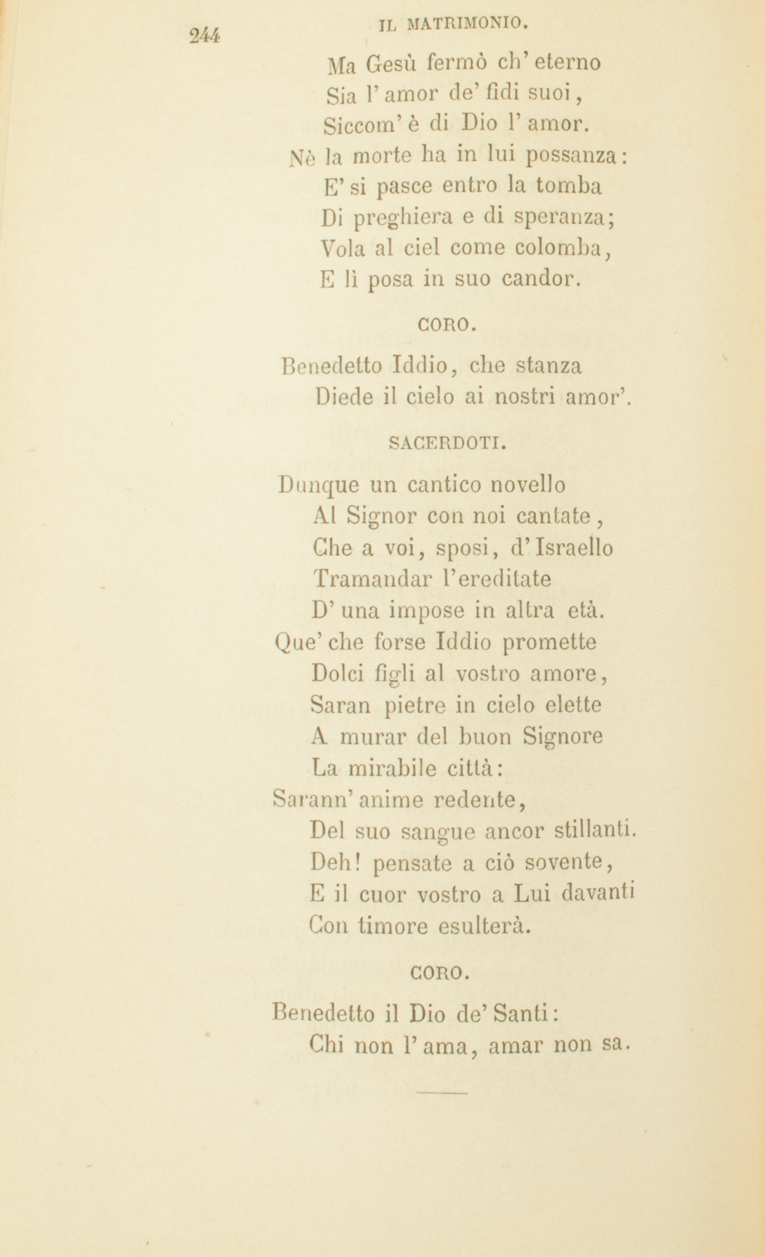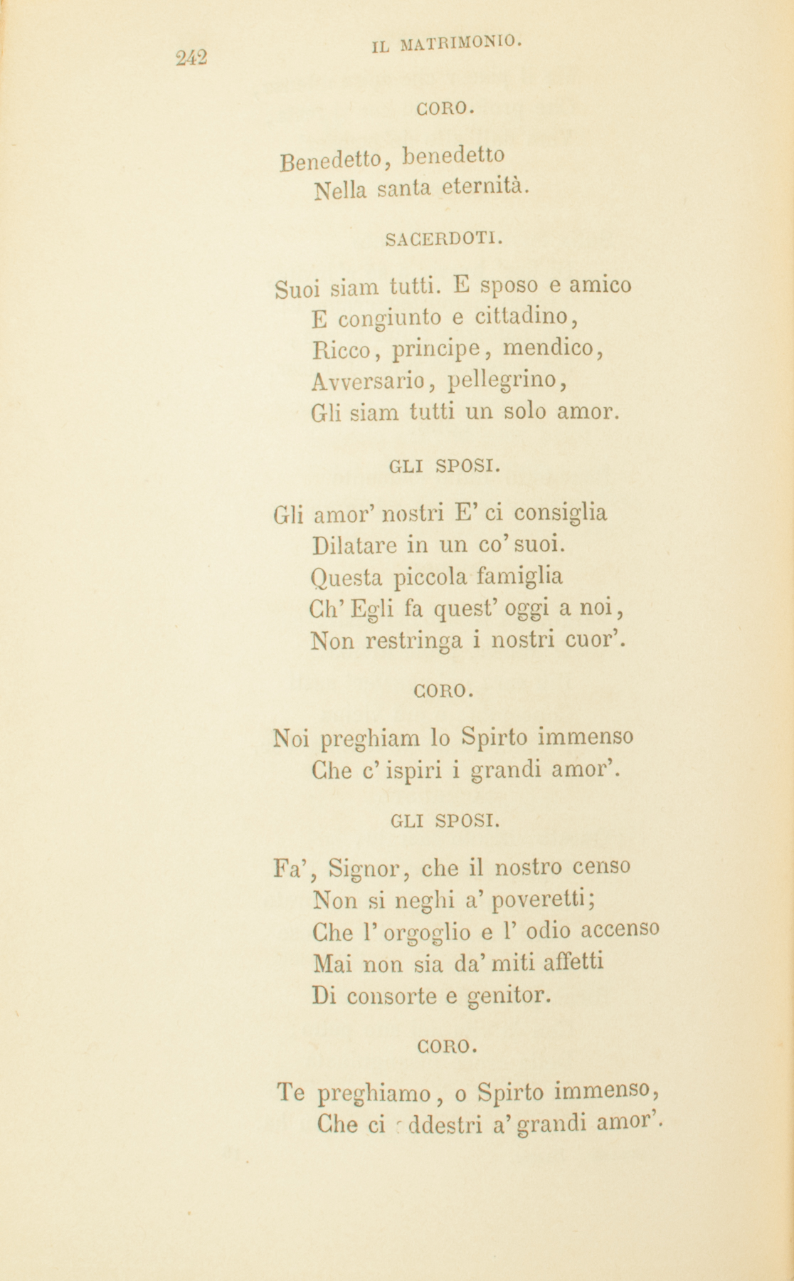 GLI SPOSI.Spirto santo, che creasti,Quante son, le cose belle,Saldi affetti e pensier’ castiManda a noi dall’ignee stelle;Vieni, e accendi i nostri cor’.GLI SPOSI.Spirto santo, che creasti,Quante son, le cose belle,Saldi affetti e pensier’ castiManda a noi dall’ignee stelle;Vieni, e accendi i nostri cor’.CORO.Benedetto il Dio de’ SantiChe c’insegna il vero amor.SACERDOTI. I desir’ nel vano errantiGesù nostro al ciel converse,E le vesti degli amantiNel suo sangue infuse e terse,Le fregiò del suo candor.CORO.Benedetto il Dio de’ SantiChe c’insegna il vero amor.PADRI.Il vapor dell’ebro sensoPassa via come tempesta:Ma il piacer che spira intensoChe profondo in cor vi resta,Vien dall’alto de’ pensier’.GLI SPOSI.Sulla terra che, ridenteDi fior’ brevi, a sè c’invita,Trascorriamo leggermente:Sia battaglia a noi la vita,Sia preghiera anco il piacer.CORO.Benedetto Iddio clementeChe c’insegna a ben goder.MADRI.Verginetta in sen portasti,O Maria, prole divina.Più sarà ne’ pensier’ castiConcepita, e più vicinaProle avremo al sommo Ver.SACERDOTI.Questo vincolo sacrato,Figli, adombra arcane cose.Cristo anch’egli innamoratoPatti eterni un dì composeCon la schiava umanità.Ricomprò la donna amataCon la vita del suo petto;Della croce insanguinataFece a lei d’amore un lettoChe in delizie ugual non ha.CORO.Benedetto, benedettoNella santa eternità.SACERDOTI.Suoi siam tutti. E sposo e amicoE congiunto e cittadino,Ricco, principe, mendico,Avversario, pellegrino,Gli siam tutti un solo amor.GLI SPOSI.Gli amor’ nostri E’ ci consigliaDilatare in un co’ suoi.Questa piccola famigliaCh’Egli fa quest’oggi a noi,Non restringa i nostri cuor’.CORO.Noi preghiam lo Spirto immensoChe c’ispiri i grandi amor’.GLI SPOSI.Fa’, Signor, che il nostro censoNon si neghi a’ poveretti;Che l’orgoglio e l’odio accensoMai non sia da’ miti affettiDi consorte e genitor.CORO.Te preghiamo, o Spirto immenso,Che ci addestri a’ grandi amor’.VECCHI.L’oro e gli agi e la possanzaParve al mondo il sommo bene:Sommo bene è la speranzaChe amorosa a Dio s’attieneNelle gioie e ne’ dolor’.SACERDOTI.Fino all’ultimo consorti,Notte e dì vivrete uniti.L’ira o il duol non vi trasporti,L’acre noia non irritiNè raffreddi i vostri cuor’.CORO.Invocate il Dio de’ fortiChe v’insegni i lunghi amor’.MADRI.Sia gentile e riverenteIl linguaggio e parco e schietto;Il pensiero antiveggente,Senza nube di sospetto;Chini gli occhi, ed alto il cuor.VECCHI.Dentro al cuor fruttificandoVostro amor verrà con gli anni.Poi, le gioie rammentandoGià lontane, e i vinti affanni,Loderete il buon Signor.Come un dì di mesto inverno,Se ne va la vita a noi:Ma Gesù fermò ch’eternoSia l’amor de’ fidi suoi,Siccom’è di Dio l’amor.Nè la morte ha in lui possanza:E’ si pasce entro la tombaDi preghiera e di speranza;Vola al ciel come colomba,E lì posa in suo candor.CORO.Benedetto Iddio, che stanzaDiede il cielo ai nostri amor’.SACERDOTI.Dunque un cantico novelloAl Signor con noi cantate,Che a voi, sposi, d’IsraelloTramandar l’ereditateD’una impose in altra età.Que’ che forse Iddio prometteDolci figli al vostro amore,Saran pietre in cielo eletteA murar del buon SignoreLa mirabile città:Sarann’anime redente,Del suo sangue ancor stillanti.Deh! pensate a ciò sovente,E il cuor vostro a Lui davantiCon timore esulterà.CORO.Benedetto il Dio de’ Santi:Chi non l’ama, amar non sa.