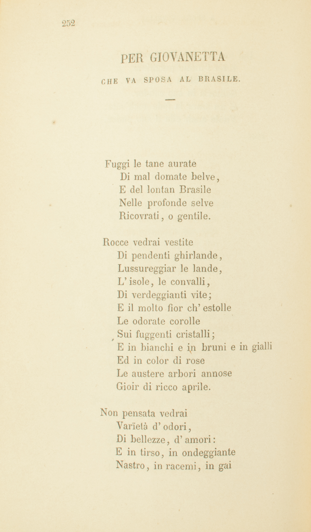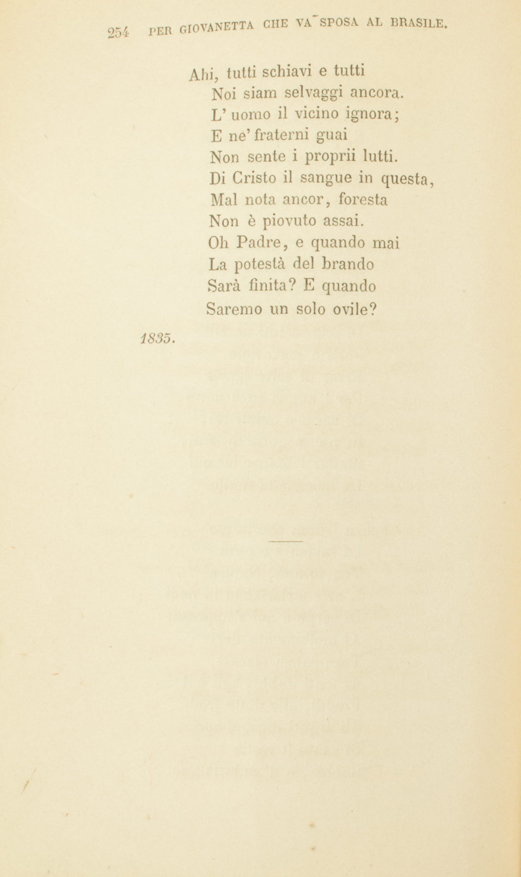 Fuggi le tane aurateDi mal domate belve,E del lontan BrasileNelle profonde selveRicovrati, o gentile.Rocce vedrai vestiteDi pendenti ghirlande,Lussureggiar le lande,L’isole, le convalli,Di verdeggianti vite;E il molto fior ch’estolleLe odorate corolleSui fuggenti cristalli;E in bianchi e in bruni e in gialliEd in color di roseLe austere arbori annoseGioir di ricco aprile.Non pensata vedraiVarïetà d’odori,Di bellezze, d’amori:E in tirso, in ondeggianteNastro, in racemi, in gai Festoni, in lunghe spireConserti i fior’ venire;E l’ellera gigante;E, più d’alpine pianteUn arboscel sublime,Fletter le lente cimeA grande arco simile.Il margine a’ ruscelli,Quasi un fiorito calle,Alïanti farfalleFitto ingemmar vedrai:Di sconosciuti uccelliForti e soavi noteErrar di selve ignotePer l’ampia pace udrai.Di verdi e aurati rai,In nuova guisa ardenti,Stellar l’ombre lucentiLa luccioletta umìle.Felice l’uom che inteseLa sapïente e puraTua voluttà, Natura!L’arte strisciando in nodiDi serpe a noi s’apprese;Ai mollemente fieriTormentosi piaceri,Ai lenti dubbi, agli odîFreddi, alle dotte frodiGli arguti ingegni aprìa;Di sante li vestìaRabbie, e d’audacia vile.Ahi, tutti schiavi e tuttiNoi siam selvaggi ancora.L’uomo il vicino ignora;E ne’ fraterni guaiNon sente i proprii lutti.Di Cristo il sangue in questa,Mal nota ancor, forestaNon è piovuto assai.Oh Padre, e quando maiLa potestà del brandoSarà finita? E quandoSaremo un solo ovile?1835.