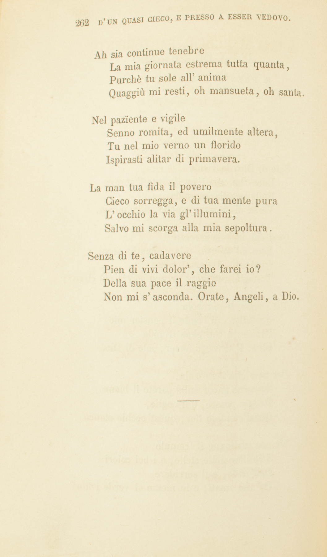 Sole di Dio, la vividaLuce che crea l’aprile e fa l’aurora,Nella pupilla languidaVersa di sè pur qualche stilla ancora.Qual chi da buia carcereEsce all’aperto, e la catena ha seco;Qual chi, l’opaca tunicaToltagli, esclama: or non son io più cieco?;Tal, come di miracoloQuotidïan, ti rende il pensier mioGrazie, e con gioia trepidaDice: I’ ti veggo ancor, sole di Dio.Dal buio che l’attornia,Discerne ancor sulla parete il biancoRaggio posare, e il coglie,Quasi candido fior, quest’occhio stanco.Ma non distingue il tremuloScintillar delle stelle, e i bei coloriDell’iride, e il sorridereDe’ visi amati, e in mezzo al verde i fiori.Ah sia continue tenebreLa mia giornata estrema tutta quanta,Purché tu sole all’animaQuaggiù mi resti, oh mansueta, oh santa.Nel pazïente e vigileSenno romita, ed umilmente altera,Tu nel mio verno un floridoIspirasti alitar di primavera.La man tua fida il poveroCieco sorregga, e di tua mente puraL’occhio la via gl’illumini,Salvo mi scorga alla mia sepoltura.Senza di te, cadaverePien di vivi dolor’, che farei io?Della sua pace il raggioNon mi s’asconda. Orate, Angeli, a Dio.