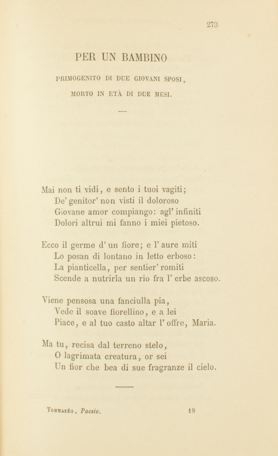 Mai non ti vidi, e sento i tuoi vagiti;De’ genitor’ non visti il dolorosoGiovane amor compiango: agl’infinitiDolori altrui mi fanno i miei pietoso.Ecco il germe d’un fiore; e l’aure mitiLo posan di lontano in letto erboso:La pianticella, per sentier’ romitiScende a nutrirla un rio fra l’erbe ascoso.Viene pensosa una fanciulla pia,Vede il soave fiorellino, e a leiPiace, e al tuo casto altar l’offre, Maria.Ma tu, recisa dal terreno stelo,O lagrimata creatura, or seiUn fior che bea di sue fragranze il cielo.