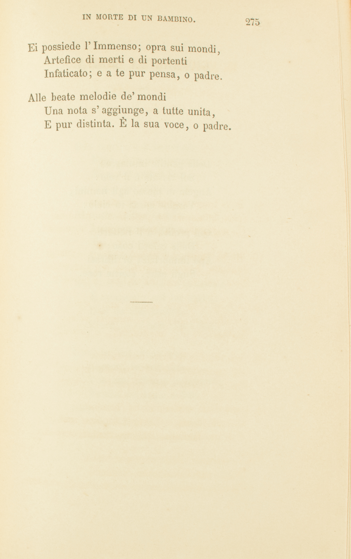 Se, dopo lungo spasimar, gli stanchiOcchi chiudesse un poco al tuo bambinoUn sonno pio; di’, non godresti, o padre?Ma ora ei veglia, a te che sogni e il piangiPerduto, è sempre innanzi, e pianamenteDice: son io; non mi ravvisi, o padre?Se nuda al collo suo sempre una spada,Se offerti al labbro suo sempre veleniVedessi; or di’, ne gioiresti, o padre?Ma più rei che di ferro e di velenoGli apprestava perigli il mondo iniquo;Più rei. Gioisci nell’angoscia, o padre.L’Angel dato custode al tuo bambino,Te custodisce, e l’Angel tuo con esso,E il tuo bambino. Hai tre custodi, o padre.Negli splendor’ della suprema stella,Negli angelici altissimi concenti,Vive, e al tuo fianco e nel tuo seno, o padre.Ei possiede l’Immenso; opra sui mondi,Artefice di merti e di portentiInfaticato; e a te pur pensa, o padre.Alle beate melodie de’ mondiUna nota s’aggiunge, a tutte unita,E pur distinta. È la sua voce, o padre.