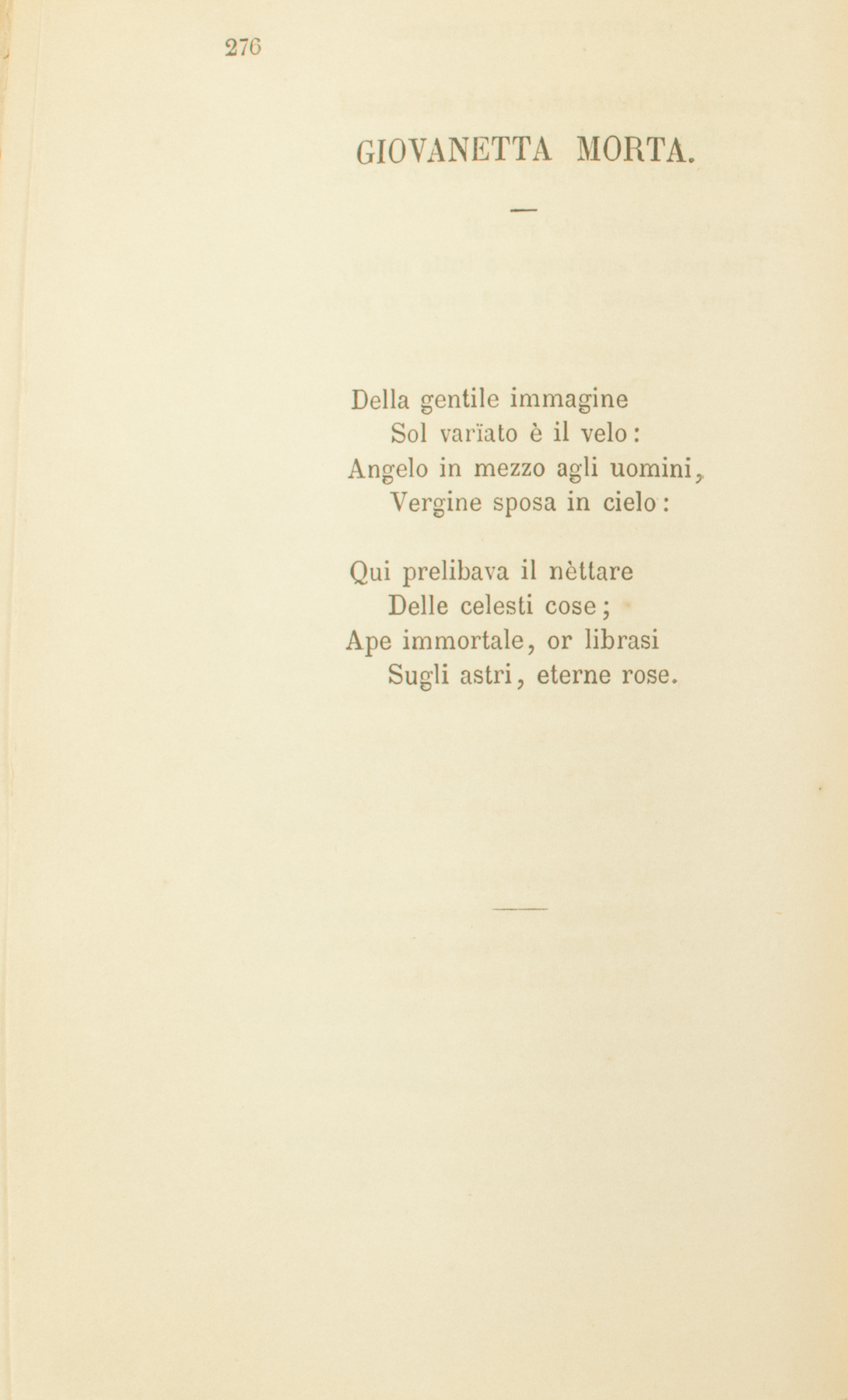 Della gentile immagineSol varïato è il velo:Angelo in mezzo agli uomini,Vergine sposa in cielo:Qui prelibava il nèttareDelle celesti cose;Ape immortale, or librasiSugli astri, eterne rose.