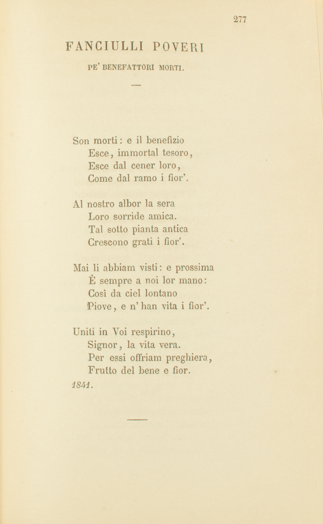 Son morti: e il benefizioEsce, immortal tesoro,Esce dal cener loro,Come dal ramo i fior’.Al nostro albor la seraLoro sorride amica.Tal sotto pianta anticaCrescono grati i fior’.Mai li abbiam visti: e prossimaÈ sempre a noi lor mano:Così da ciel lontanoPiove, e n’han vita i fior’.Uniti in Voi respirino,Signor, la vita vera.Per essi offriam preghiera,Frutto del bene e fior.1841.