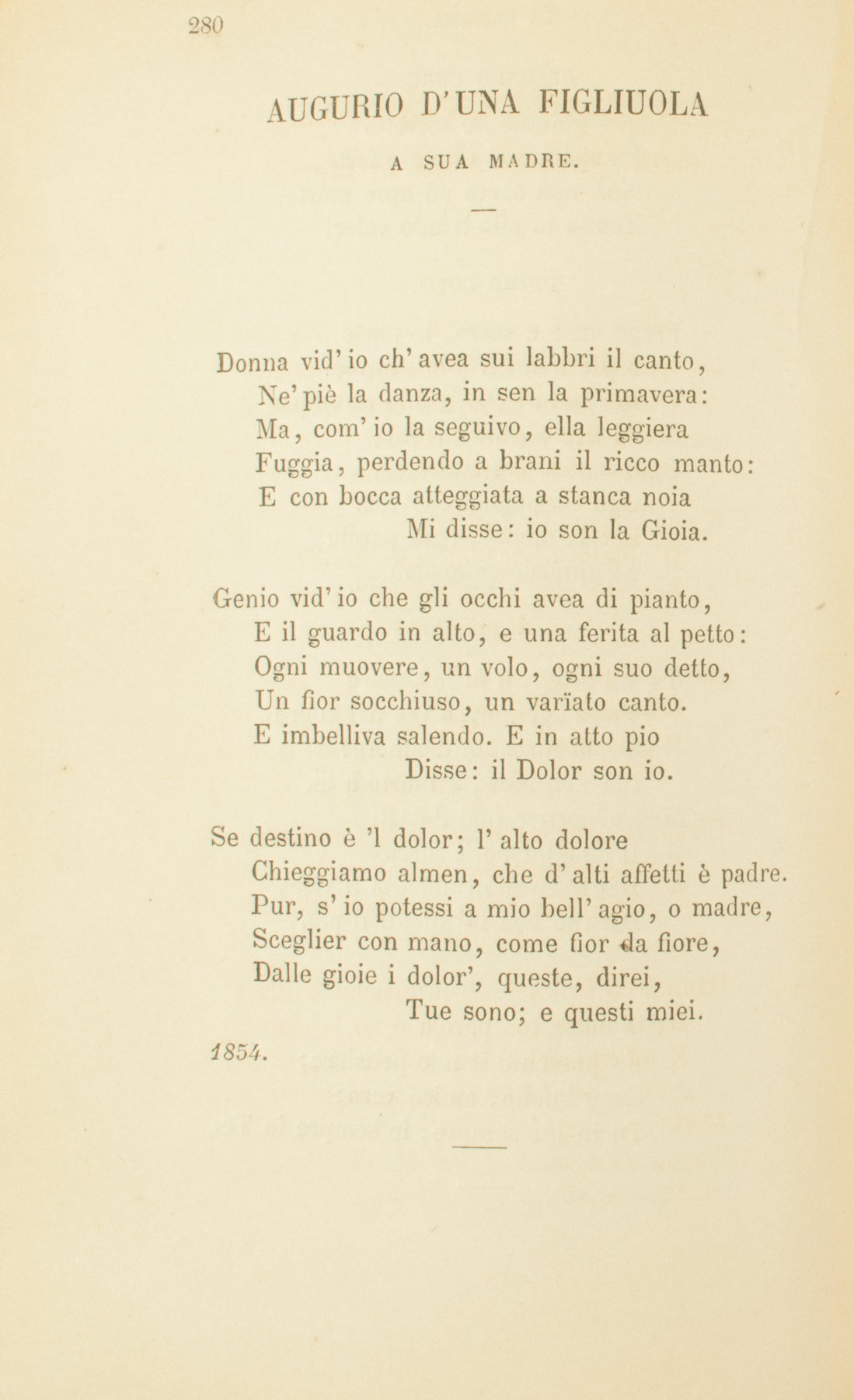 Donna vid’io ch’avea sui labbri il canto,Ne’ piè la danza, in sen la primavera:Ma, com’io la seguivo, ella leggieraFuggia, perdendo a brani il ricco manto:E con bocca atteggiata a stanca noiaMi disse: io son la Gioia.Genio vid’io che gli occhi avea di pianto,E il guardo in alto, e una ferita al petto:Ogni muovere, un volo, ogni suo detto,Un fior socchiuso, un varïato canto.E imbelliva salendo. E in atto pioDisse: il Dolor son io.Se destino è ’l dolor; l’alto doloreChieggiamo almen, che d’alti affetti è padre.Pur, s’io potessi a mio bell’agio, o madre,Sceglier con mano, come fior da fiore,Dalle gioie i dolor’, queste, direi,Tue sono; e questi miei.1854.