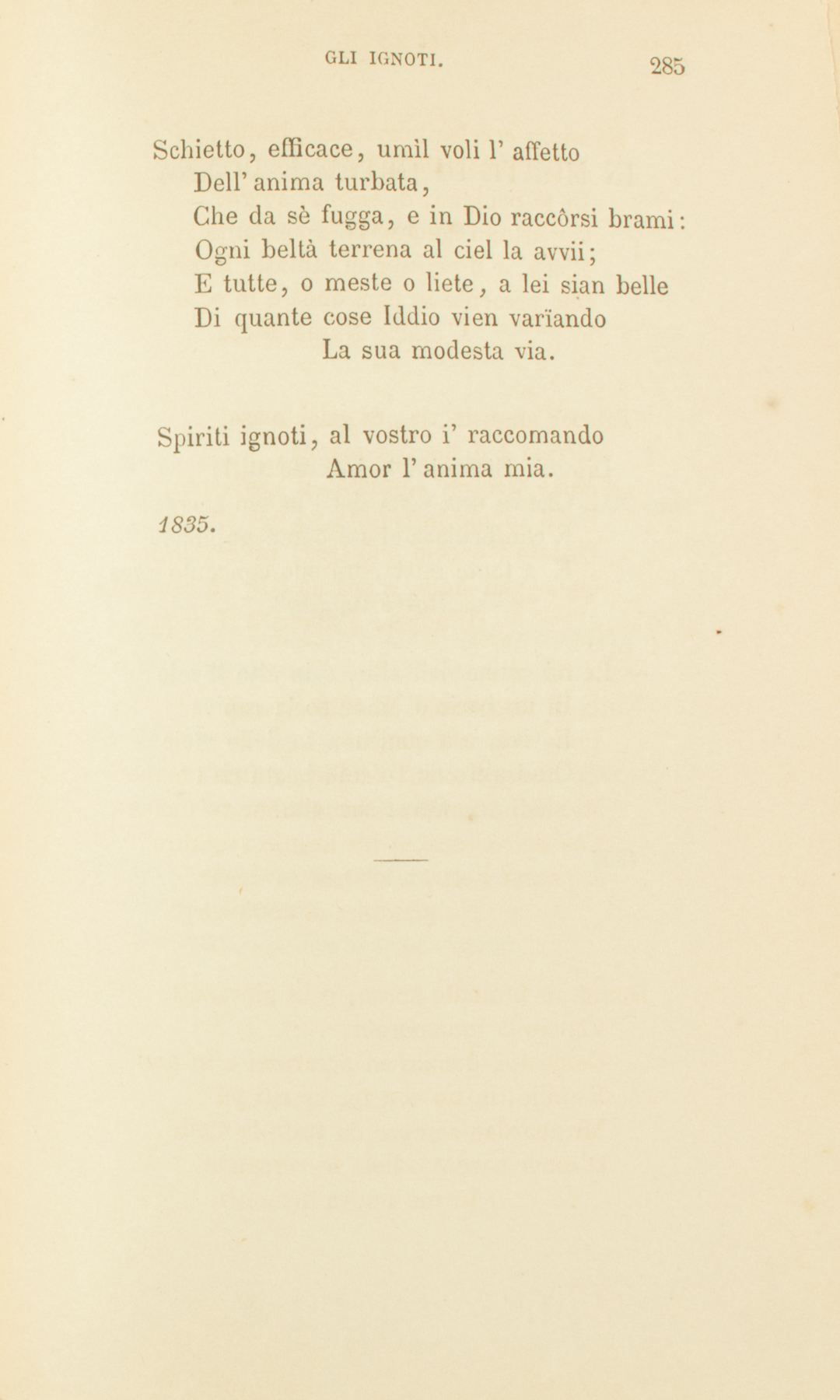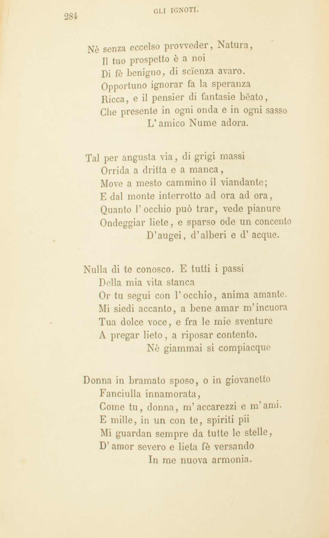 Nè quale il nome tuo, nè quale il viso,Seppi; e la tua staturaMisurai dal ferètro. Io dalla spondaIlliria, e tu dal Rodano sonanteMover dovevi; e rincontrarsi alfineIn Parigi dovea con la tua bara,O donna, il prego mio.Tal, da lontano turbine reciso,Sovr’ignota verzuraCade languido fior; tale quell’ondaChe di fanciulla tenera le pianteBacia amorosa, e lunghe selve alpineCorse e giardini gai trepida e chiaraCon fido mormorìo.Nulla di te conosco. E notte oscuraM’è, come i casi tuoi,Quant’ebbi al mondo più fidato e caro.Ogni anima, ogni tempo, ogni sembianzaÈ mar profondo, aëre interminato:E l’amor, che lo valica d’un passo,La sua possanza ignora.Nè senza eccelso provveder, Natura,Il tuo prospetto è a noiDi fè benigno, di scïenza avaro.Opportuno ignorar fa la speranzaRicca, e il pensier di fantasie bëato,Che presente in ogni onda e in ogni sassoL’amico Nume adora.Tal per angusta via, di grigi massiOrrida a dritta e a manca,Move a mesto cammino il viandante;E dal monte interrotto ad ora ad ora,Quanto l’occhio può trar, vede pianureOndeggiar liete, e sparso ode un concentoD’augei, d’alberi e d’acque.Nulla di te conosco. E tutti i passiDella mia vita stancaOr tu segui con l’occhio, anima amante.Mi siedi accanto, a bene amar m’incuoraTua dolce voce, e fra le mie sventureA pregar lieto, a riposar contento.Nè giammai si compiacqueDonna in bramato sposo, o in giovanettoFanciulla innamorata,Come tu, donna, m’accarezzi e m’ami.E mille, in un con te, spiriti piiMi guardan sempre da tutte le stelle,D’amor severo e lieta fè versandoIn me nuova armonia.Schietto, efficace, umìl voli l’affettoDell’anima turbata,Che da sè fugga, e in Dio raccôrsi brami:Ogni beltà terrena al ciel la avvii;E tutte, o meste o liete, a lei sian belleDi quante cose Iddio vien varïandoLa sua modesta via.Spiriti ignoti, al vostro i’ raccomandoAmor l’anima mia.1835.