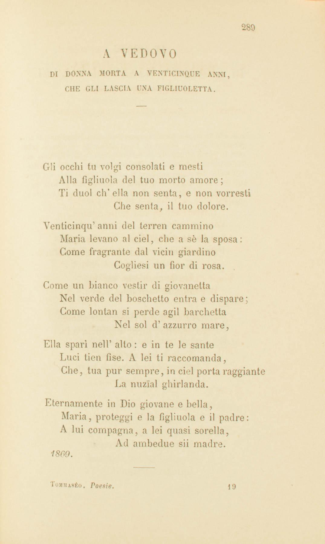 Gli occhi tu volgi consolati e mestiAlla figliuola del tuo morto amore;Ti duol ch’ella non senta, e non vorrestiChe senta, il tuo dolore.Venticinqu’anni del terren camminoMaria levano al ciel, che a sè la sposa:Come fragrante dal vicin giardinoCogliesi un fior di rosa.Come un bianco vestir di giovanettaNel verde del boschetto entra e dispare;Come lontan si perde agil barchettaNel sol d’azzurro mare,Ella sparì nell’alto: e in te le santeLuci tien fise. A lei ti raccomanda,Che, tua pur sempre, in ciel porta raggianteLa nuzïal ghirlanda.Eternamente in Dio giovane e bella,Maria, proteggi e la figliuola e il padre:A lui compagna, a lei quasi sorella,Ad ambedue sii madre.1869.