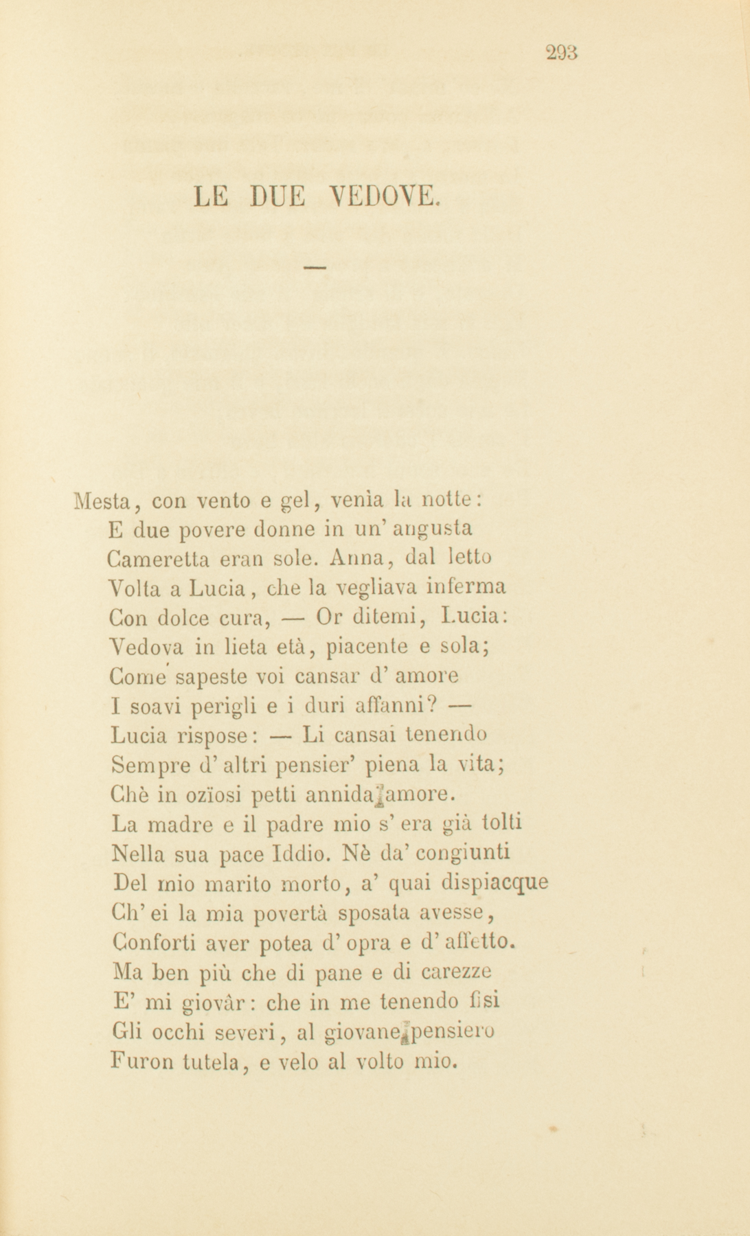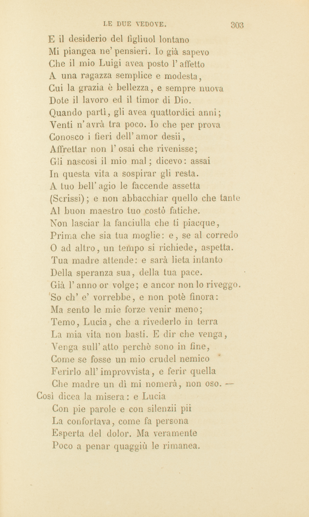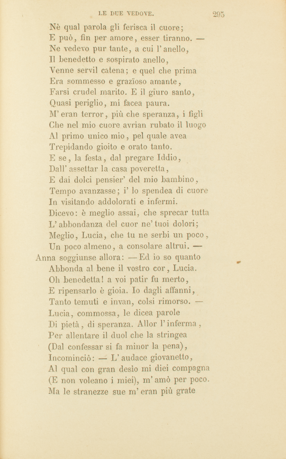 Mesta, con vento e gel, venìa la notte:E due povere donne in un’angustaCameretta eran sole. Anna, dal lettoVolta a Lucia, che la vegliava infermaCon dolce cura, — Or ditemi, Lucia:Vedova in lieta età, piacente e sola;Come sapeste voi cansar d’amoreI soavi perigli e i duri affanni? —Lucia rispose: — Li cansai tenendoSempre d’altri pensier’ piena la vita;Che in ozïosi petti annida amore.La madre e il padre mio s’era già toltiNella sua pace Iddio. Nè da’ congiuntiDel mio marito morto, a’ quai dispiacqueCh’ei la mia povertà sposata avesse,Conforti aver potea d’opra e d’affetto.Ma ben più che di pane e di carezzeE’ mi giovâr: che in me tenendo fisiGli occhi severi, al giovane pensieroFuron tutela, e velo al volto mio.Nè co’ minor’ di me, raccolta e mesta,Affiatarmi potea, nè co’ maggiori,Povera, a paro andar. Tale una piantaIn mezzo a strette cittadine stradeSola s’innalza, e cerca il ciel co’ rami.Dalla messa dell’alba a notte tardaM’affaticavo a provveder di paneOnorato, e di scuola, il mio bambino:Egli la mia famiglia e l’amor mioUnico. E quando, invan chiamato, il sonnoFuggia dagli occhi lassi, e il mio guancialeLe mie cocenti lacrime bevea;I’ sentìa l’odoroso alito lieveDe’ suoi sonni innocenti, e offrivo a DioPer lui la mia gravosa orfana vita.E, vestendo i miei panni, a un fioco lumeMi rimettevo, a mezza notte il verno,Senza fuoco, al lavor, come personaChe si raffretta a uscir di gran periglio:E vinta da stanchezza, alfin, la seraVegnente appresso, mi prendea profondoSonno, e pietoso delle cure oblio.Spesso pensavo in cuor l’ore che lieteEbbi con lui che il buono Iddio mi diede,E poi mi tolse (Ei lo riposi in pace);E dicevo fra me: non tornerannoMai più quell’ore; e, al paragon di quelle,Ogni men vivo amor parria dispetto.Poi, pensando i dolor’ ch’ebbi con lui,—Giovane ancor, dicea, patisti tanto:Non cercar nuovi affanni. E che faraiPoscia, se a ben soffrir lena ti manca?Non dare al figliuol tuo padre un estrano:Non saprìa qual sorriso il persüada,Nè qual parola gli ferisca il cuore;E può, fin per amore, esser tiranno. —Ne vedevo pur tante, a cui l’anello,Il benedetto e sospirato anello,Venne servil catena; e quel che primaEra sommesso e grazïoso amante,Farsi crudel marito. E il giuro santo,Quasi periglio, mi facea paura.M’eran terror, più che speranza, i figliChe nel mio cuore avrian rubato il luogoAl primo unico mio, pel quale aveaTrepidando gioito e orato tanto.E se, la festa, dal pregare Iddio,Dall’assettar la casa poveretta,E dai dolci pensier’ del mio bambino,Tempo avanzasse; i’ lo spendea di cuoreIn visitando addolorati e infermi.Dicevo: è meglio assai, che sprecar tuttaL’abbondanza del cuor ne’ tuoi dolori;Meglio, Lucia, che tu ne serbi un poco,Un poco almeno, a consolare altrui. —Anna soggiunse allora: — Ed io so quantoAbbonda al bene il vostro cor, Lucia.Oh benedetta! a voi patir fu merto,E ripensarlo è gioia. Io dagli affanni,Tanto temuti e invan, colsi rimorso. —Lucia, commossa, le dicea paroleDi pietà, di speranza. Allor l’inferma,Per allentare il duol che la stringea(Dal confessar si fa minor la pena),Incominciò: — L’audace giovanetto,Al qual con gran desìo mi diei compagna(E non voleano i miei), m’amò per poco.Ma le stranezze sue m’eran più grateChe altrui lusinga; e s’accendea l’amore,Misto d’ambascia e di temenza e d’ire.Alcuna cosa in me s’era trasfusoDi quegl’impeti suoi; chè disfogavoNel bambino innocente il mio corruccio;Poi, con carezze ed affrettati baciSenza parola, gli chiedea perdono.L’uom che sì m’affliggea, quanto dilettoFosse al mio cuor, sentii quando lo persi.Per l’Appennin venìa. Dalla vetturaCadde, e una ruota gli passò sul petto.(Dicono adesso del vapor che uccide,E non si pensa quanti corpi cariPer altre vie già divorò la morte).Chi si trovò presente, a me dicevaCome il bel bruno pallido del visoNon fece luogo al lividor, nè a quantoSuol d’orrendo all’aspetto aver la morte.Passò traverso ai visceri vitaliLa ruota, e dentro stritolò. Là entroTutto lo spasmo; altrove ancor la vita,Salda la mente. Al sacerdote accorsoDisse all’orecchio e ricevè paroleDi senso eterno; e fra gli astanti immoti,Come chi nel suo letto s’addormenta,Spirò. Giacea disteso in sulla via,Chè non eran di là case o capanne.Nel men lontano cimitero ignotoEbbe da ignote man’ la sepoltura;E alcun di quelli che seguian pietosi,Avrà, vedendo spenzolar portateLe braccia lente e la giovane testa,Pensato al pianto degl’ignoti, orando.Il conduttore e i passeggieri intantoSpronar dovean, perchè ’l rumor del casoA’ cari lor fiera agonìa non fosse.E così suol talora essere inciampo,Noia più che dolor, la morte altrui;E l’uom, nel duolo altrui, pensa a se stesso.Come rimasi alla crudel novella!Un sogno mi parea confuso e scuro,Scuro, solcato di baglior’ maligni,E la vita e la morte: e men dolenteChe sopraffatta, vagellando andavo,Costernata di stupido sgomento.Pur mi riebbi in breve: ancor la vitaBella mi parve, e amor, dolce tormento.E d’uomo assai men degno amor mi prese,Ubbidïente e pauroso amoreE violento. E lui, stolta, prescelsi(Come l’uman desìo crede a’ sembianti!).Prescelsi ad uom che sotto umile aspettoDignitosa e fervente anima avea.Quanto per me sostenne, e quanta, amando,Dimostrò più di me che di sè curaQuel buon Giovanni! Non preghiere impronte,Nè sdegni nè lamenti: umile e pianoE fermo sempre e delicato affetto.Quanto non pose amor nel mio bambino,Come suo figlio fosse! Io, che temevoLe prepotenti gelosie di Naldo(Così l’altro avea nome), indispettitaRigettavo, infelice, i suoi presentiCh’e’ gli faceva; ingelosivo anch’ioCh’e’ mi togliesse il cor del mio Luigi.Luigi inver lo amava, e non poteaNaldo patir, che a me vedea sì caro:Chè veramente con modi aspri NaldoTrattava il mio figliuolo; ond’io trafittaPiangevo in cor, ma non ardìa far motto.E, perocchè ’l patir matura il se