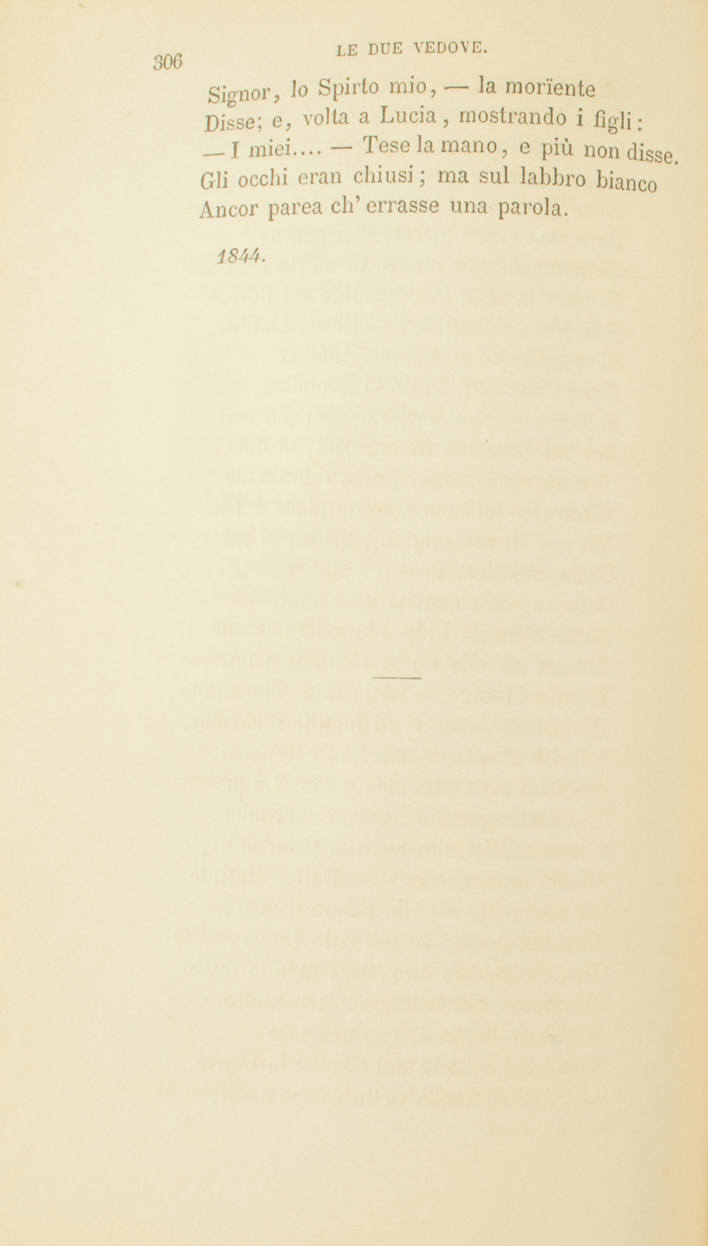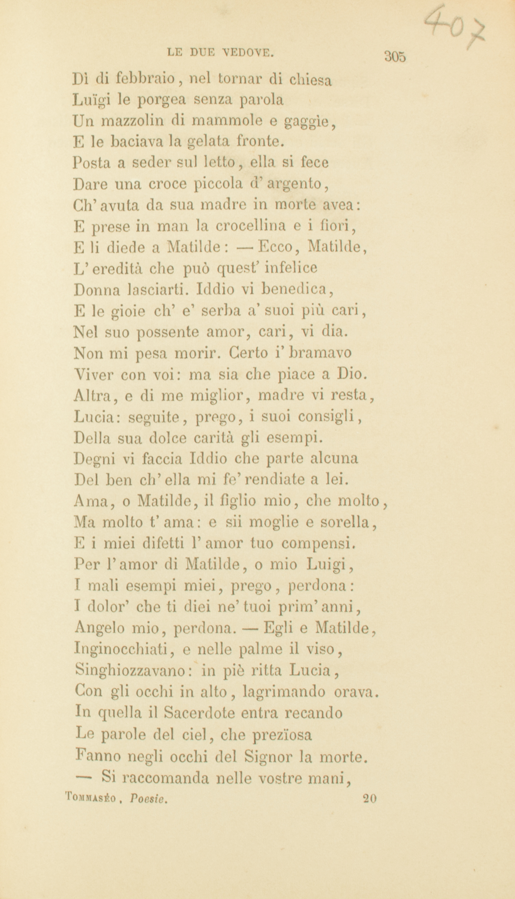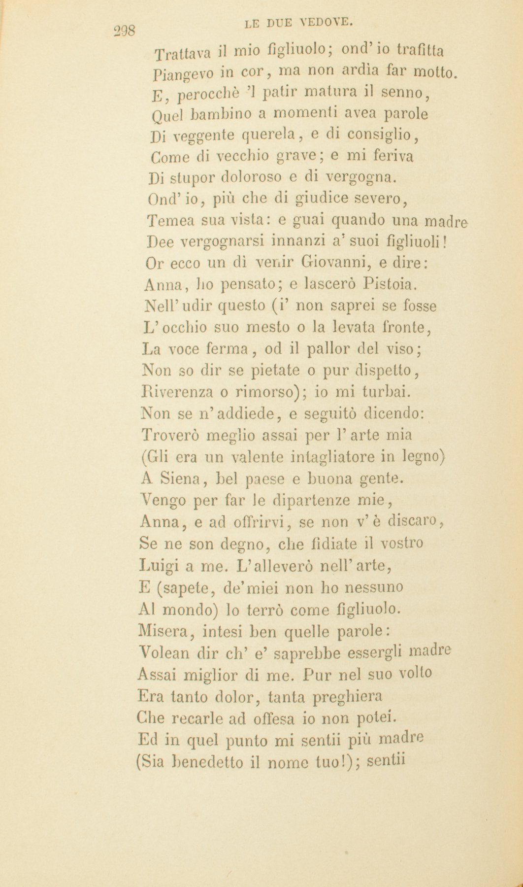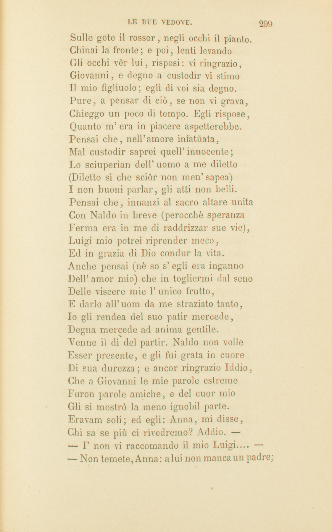 Mesta, con vento e gel, venìa la notte:E due povere donne in un’angustaCameretta eran sole. Anna, dal lettoVolta a Lucia, che la vegliava infermaCon dolce cura, — Or ditemi, Lucia:Vedova in lieta età, piacente e sola;Come sapeste voi cansar d’amoreI soavi perigli e i duri affanni? —Lucia rispose: — Li cansai tenendoSempre d’altri pensier’ piena la vita;Che in ozïosi petti annida amore.La madre e il padre mio s’era già toltiNella sua pace Iddio. Nè da’ congiuntiDel mio marito morto, a’ quai dispiacqueCh’ei la mia povertà sposata avesse,Conforti aver potea d’opra e d’affetto.Ma ben più che di pane e di carezzeE’ mi giovâr: che in me tenendo fisiGli occhi severi, al giovane pensieroFuron tutela, e velo al volto mio.Nè co’ minor’ di me, raccolta e mesta,Affiatarmi potea, nè co’ maggiori,Povera, a paro andar. Tale una piantaIn mezzo a strette cittadine stradeSola s’innalza, e cerca il ciel co’ rami.Dalla messa dell’alba a notte tardaM’affaticavo a provveder di paneOnorato, e di scuola, il mio bambino:Egli la mia famiglia e l’amor mioUnico. E quando, invan chiamato, il sonnoFuggia dagli occhi lassi, e il mio guancialeLe mie cocenti lacrime bevea;I’ sentìa l’odoroso alito lieveDe’ suoi sonni innocenti, e offrivo a DioPer lui la mia gravosa orfana vita.E, vestendo i miei panni, a un fioco lumeMi rimettevo, a mezza notte il verno,Senza fuoco, al lavor, come personaChe si raffretta a uscir di gran periglio:E vinta da stanchezza, alfin, la seraVegnente appresso, mi prendea profondoSonno, e pietoso delle cure oblio.Spesso pensavo in cuor l’ore che lieteEbbi con lui che il buono Iddio mi diede,E poi mi tolse (Ei lo riposi in pace);E dicevo fra me: non tornerannoMai più quell’ore; e, al paragon di quelle,Ogni men vivo amor parria dispetto.Poi, pensando i dolor’ ch’ebbi con lui,—Giovane ancor, dicea, patisti tanto:Non cercar nuovi affanni. E che faraiPoscia, se a ben soffrir lena ti manca?Non dare al figliuol tuo padre un estrano:Non saprìa qual sorriso il persüada,Nè qual parola gli ferisca il cuore;E può, fin per amore, esser tiranno. —Ne vedevo pur tante, a cui l’anello,Il benedetto e sospirato anello,Venne servil catena; e quel che primaEra sommesso e grazïoso amante,Farsi crudel marito. E il giuro santo,Quasi periglio, mi facea paura.M’eran terror, più che speranza, i figliChe nel mio cuore avrian rubato il luogoAl primo unico mio, pel quale aveaTrepidando gioito e orato tanto.E se, la festa, dal pregare Iddio,Dall’assettar la casa poveretta,E dai dolci pensier’ del mio bambino,Tempo avanzasse; i’ lo spendea di cuoreIn visitando addolorati e infermi.Dicevo: è meglio assai, che sprecar tuttaL’abbondanza del cuor ne’ tuoi dolori;Meglio, Lucia, che tu ne serbi un poco,Un poco almeno, a consolare altrui. —Anna soggiunse allora: — Ed io so quantoAbbonda al bene il vostro cor, Lucia.Oh benedetta! a voi patir fu merto,E ripensarlo è gioia. Io dagli affanni,Tanto temuti e invan, colsi rimorso. —Lucia, commossa, le dicea paroleDi pietà, di speranza. Allor l’inferma,Per allentare il duol che la stringea(Dal confessar si fa minor la pena),Incominciò: — L’audace giovanetto,Al qual con gran desìo mi diei compagna(E non voleano i miei), m’amò per poco.Ma le stranezze sue m’eran più grateChe altrui lusinga; e s’accendea l’amore,Misto d’ambascia e di temenza e d’ire.Alcuna cosa in me s’era trasfusoDi quegl’impeti suoi; chè disfogavoNel bambino innocente il mio corruccio;Poi, con carezze ed affrettati baciSenza parola, gli chiedea perdono.L’uom che sì m’affliggea, quanto dilettoFosse al mio cuor, sentii quando lo persi.Per l’Appennin venìa. Dalla vetturaCadde, e una ruota gli passò sul petto.(Dicono adesso del vapor che uccide,E non si pensa quanti corpi cariPer altre vie già divorò la morte).Chi si trovò presente, a me dicevaCome il bel bruno pallido del visoNon fece luogo al lividor, nè a quantoSuol d’orrendo all’aspetto aver la morte.Passò traverso ai visceri vitaliLa ruota, e dentro stritolò. Là entroTutto lo spasmo; altrove ancor la vita,Salda la mente. Al sacerdote accorsoDisse all’orecchio e ricevè paroleDi senso eterno; e fra gli astanti immoti,Come chi nel suo letto s’addormenta,Spirò. Giacea disteso in sulla via,Chè non eran di là case o capanne.Nel men lontano cimitero ignotoEbbe da ignote man’ la sepoltura;E alcun di quelli che seguian pietosi,Avrà, vedendo spenzolar portateLe braccia lente e la giovane testa,Pensato al pianto degl’ignoti, orando.Il conduttore e i passeggieri intantoSpronar dovean, perchè ’l rumor del casoA’ cari lor fiera agonìa non fosse.E così suol talora essere inciampo,Noia più che dolor, la morte altrui;E l’uom, nel duolo altrui, pensa a se stesso.Come rimasi alla crudel novella!Un sogno mi parea confuso e scuro,Scuro, solcato di baglior’ maligni,E la vita e la morte: e men dolenteChe sopraffatta, vagellando andavo,Costernata di stupido sgomento.Pur mi riebbi in breve: ancor la vitaBella mi parve, e amor, dolce tormento.E d’uomo assai men degno amor mi prese,Ubbidïente e pauroso amoreE violento. E lui, stolta, prescelsi(Come l’uman desìo crede a’ sembianti!).Prescelsi ad uom che sotto umile aspettoDignitosa e fervente anima avea.Quanto per me sostenne, e quanta, amando,Dimostrò più di me che di sè curaQuel buon Giovanni! Non preghiere impronte,Nè sdegni nè lamenti: umile e pianoE fermo sempre e delicato affetto.Quanto non pose amor nel mio bambino,Come suo figlio fosse! Io, che temevoLe prepotenti gelosie di Naldo(Così l’altro avea nome), indispettitaRigettavo, infelice, i suoi presentiCh’e’ gli faceva; ingelosivo anch’ioCh’e’ mi togliesse il cor del mio Luigi.Luigi inver lo amava, e non poteaNaldo patir, che a me vedea sì caro:Chè veramente con modi aspri NaldoTrattava il mio figliuolo; ond’io trafittaPiangevo in cor, ma non ardìa far motto.E, perocchè ’l patir matura il se