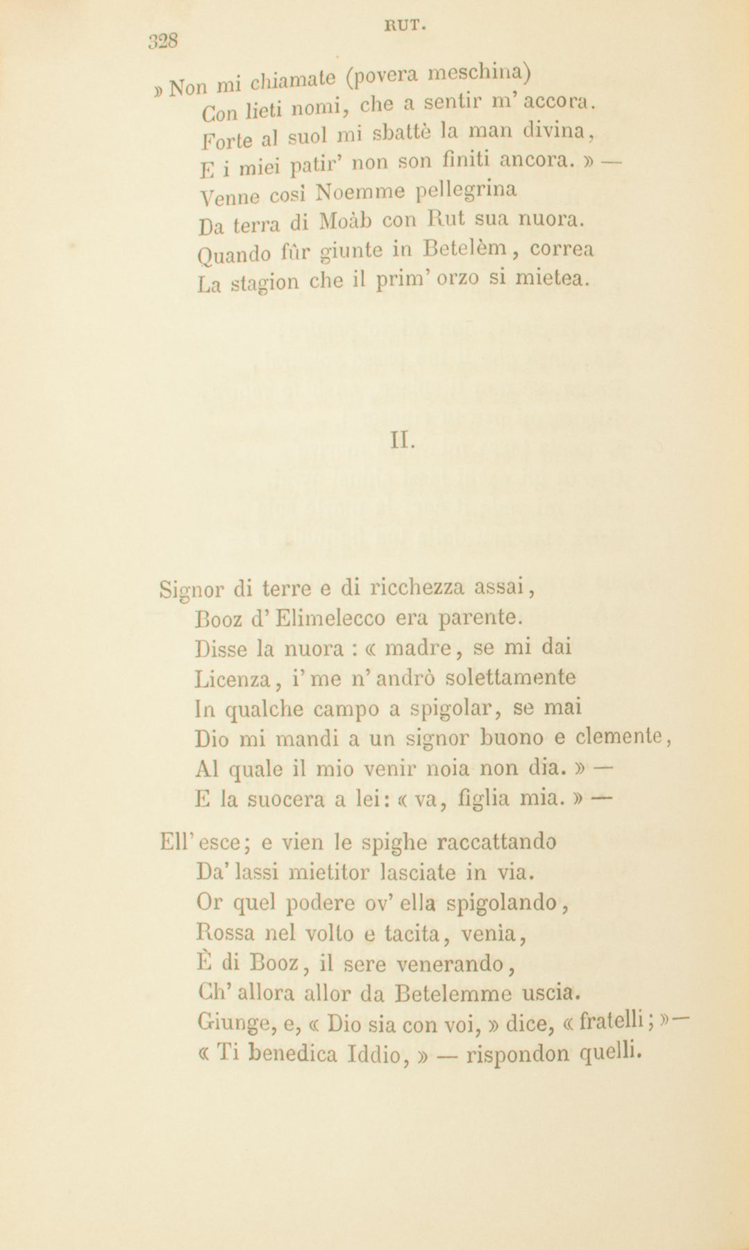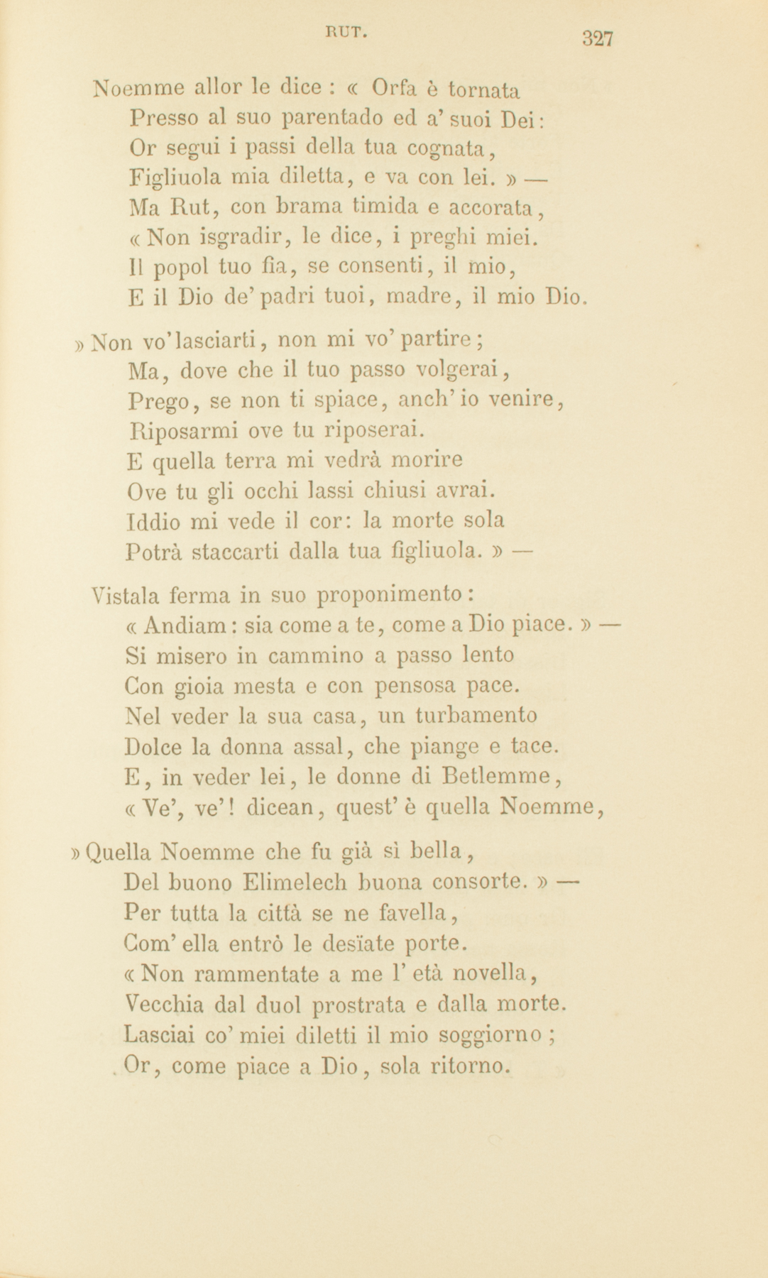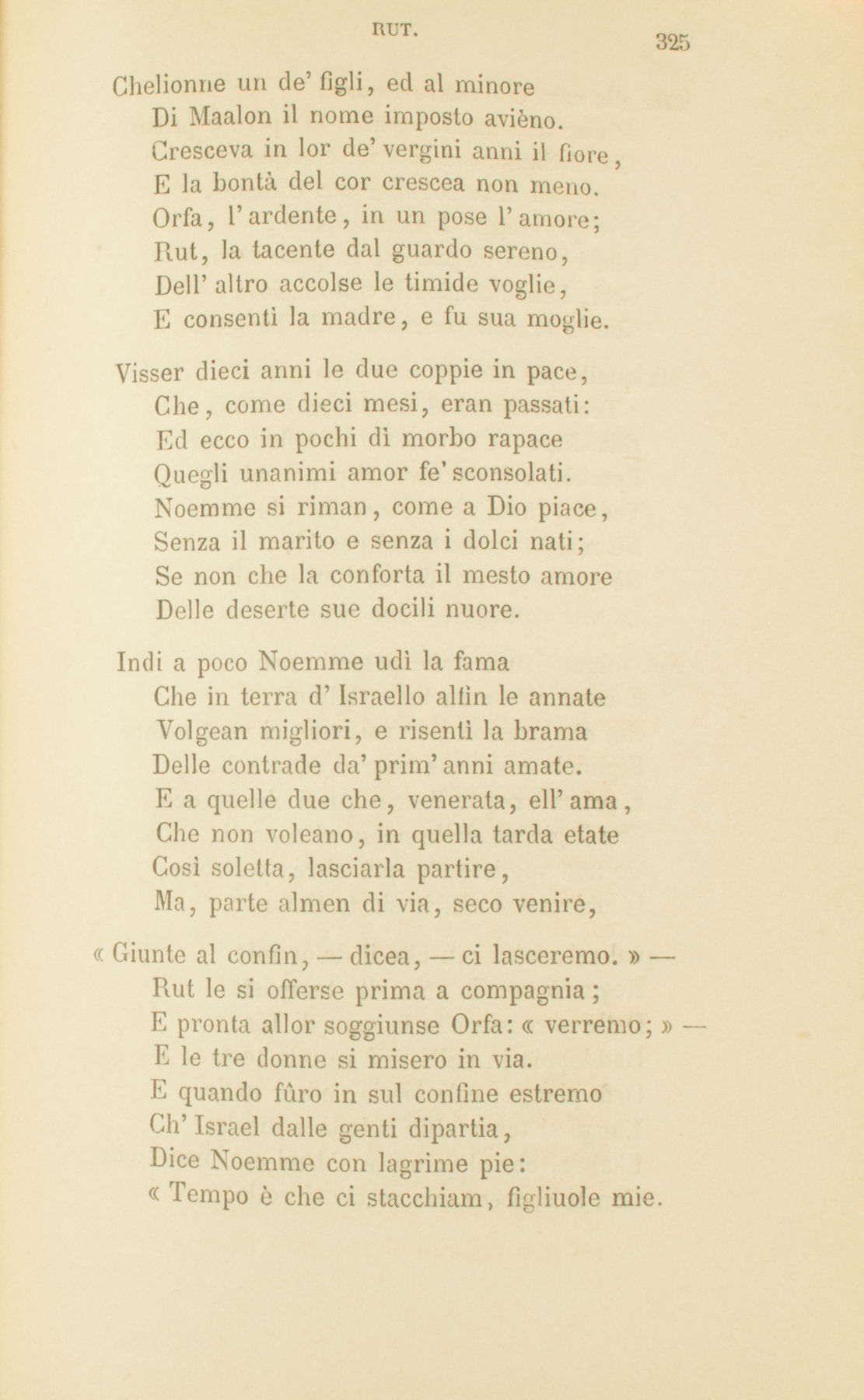 Quando non c’eran re, ma si reggevaA giudici la gente d’Israello,Venne la fame; e il popolo gemeva,E più crudel che morte era il flagello.Allora un uom che in Betelèm viveva,Prese la moglie e i figli, ed un fardelloFe’ delle poche sue povere cose;E nella terra di Moàb si pose.Incominciava all’umile famigliaEsser benigna la sede novella;Quando Iddio, che a suo senno e dona e piglia,Elimelecco a’ suoi riposi appella.Piange Noemme; e seco si consiglia,Come prima potrà la poverella,Di far ritorno, permettente Iddio,Co’ due figliuoli al suo nido natìo.Chelionne un de’ figli, ed al minoreDi Maalon il nome imposto avièno.Cresceva in lor de’ vergini anni il fiore,E la bontà del cor crescea non meno.Orfa, l’ardente, in un pose l’amore;Rut, la tacente dal guardo sereno,Dell’altro accolse le timide voglie,E consentì la madre, e fu sua moglie.Visser dieci anni le due coppie in pace,Che, come dieci mesi, eran passati:Ed ecco in pochi dì morbo rapaceQuegli unanimi amor fe’ sconsolati.Noemme si riman, come a Dio piace,Senza il marito e senza i dolci nati;Se non che la conforta il mesto amoreDelle deserte sue docili nuore.Indi a poco Noemme udì la famaChe in terra d’Israello alfin le annateVolgean migliori, e risentì la bramaDelle contrade da’ prim’anni amate.E a quelle due che, venerata, ell’ama,Che non voleano, in quella tarda etateCosì soletta, lasciarla partire,Ma, parte almen di via, seco venire,«Giunte al confin, — dicea, — ci lasceremo.» —Rut le si offerse prima a compagnia;E pronta allor soggiunse Orfa: «verremo;» —E le tre donne si misero in via.E quando fûro in sul confine estremoCh’Israel dalle genti dipartia,Dice Noemme con lagrime pie:«Tempo è che ci stacchiam, figliuole mie.Ite alla casa del vostro riposo,Presso alla madre vostra: io spero e precoChe il Signor sia con voi così pietosoCome voi foste co’ miei cari e meco;E vi provvegga di fidato sposo,Che i vostri dì passiate in pace seco.» —Così, benedicendo, le abbracciavaCon le braccia tremanti, e le baciava.Ma quelle pie con pianto e con parole:«Teco verremo al tuo luogo natio.» —Ella dicea: «tornate, o mie figliuole:Perchè venir vorreste al popol mio?Vedete, lassa, ch’io non ho più prole,Nè marito promettervi poss’io:Nè sperar posso che co’ lieti giorniLa vita coniugale a me ritorni.Nel volger d’una notte potessi ancoE concepire e partorir figliuoli,Sin che crescan per voi, non ci vuol manco,Figliuole mie, che sette e sette soli.E prima avreste il crin quasi che biancoChe il giorno delle nozze vi consoli.Or non vogliate che più oltre, o buone,Io del vostro soffrir sia testimone;Il qual m’accôra più che il dolor mio.Reggerò meglio sola alla tempestaDelle percosse che la man di DioRaddoppia in sulla mia canuta testa.» —Orfa piange, e la lascia, ed al natioLuogo si torna al fin soletta e mesta.L’altra, che al pianto e a’ baci era men molle,Con la suocera sua restar si volle.Noemme allor le dice: «Orfa è tornataPresso al suo parentado ed a’ suoi Dei:Or segui i passi della tua cognata,Figliuola mia diletta, e va con lei.» —Ma Rut, con brama timida e accorata,«Non isgradir, le dice, i preghi miei.Il popol tuo fia, se consenti, il mio,E il Dio de’ padri tuoi, madre, il mio Dio.Non vo’ lasciarti, non mi vo’ partire;Ma, dove che il tuo passo volgerai,Prego, se non ti spiace, anch’io venire,Riposarmi ove tu riposerai.E quella terra mi vedrà morireOve tu gli occhi lassi chiusi avrai.Iddio mi vede il cor: la morte solaPotrà staccarti dalla tua figliuola.» —Vistala ferma in suo proponimento:«Andiam: sia come a te, come a Dio piace.» —Si misero in cammino a passo lentoCon gioia mesta e con pensosa pace.Nel veder la sua casa, un turbamentoDolce la donna assal, che piange e tace.E, in veder lei, le donne di Betlemme,«Ve’, ve’! dicean, quest’è quella Noemme,Quella Noemme che fu già sì bella,Del buono Elimelech buona consorte.» —Per tutta la città se ne favella,Com’ella entrò le desïate porte.«Non rammentate a me l’età novella,Vecchia dal duol prostrata e dalla morte.Lasciai co’ miei diletti il mio soggiorno;Or, come piace a Dio, sola ritorno.Non mi chiamate (povera meschina)Con lieti nomi, che a sentir m’accora.Forte al suol mi sbattè la man divina,E i miei patir’ non son finiti ancora.» —Venne così Noemme pellegrinaDa terra di Moàb con Rut sua nuora.Quando fûr giunte in Betelèm, correaLa stagion che il prim’orzo si mietea.
