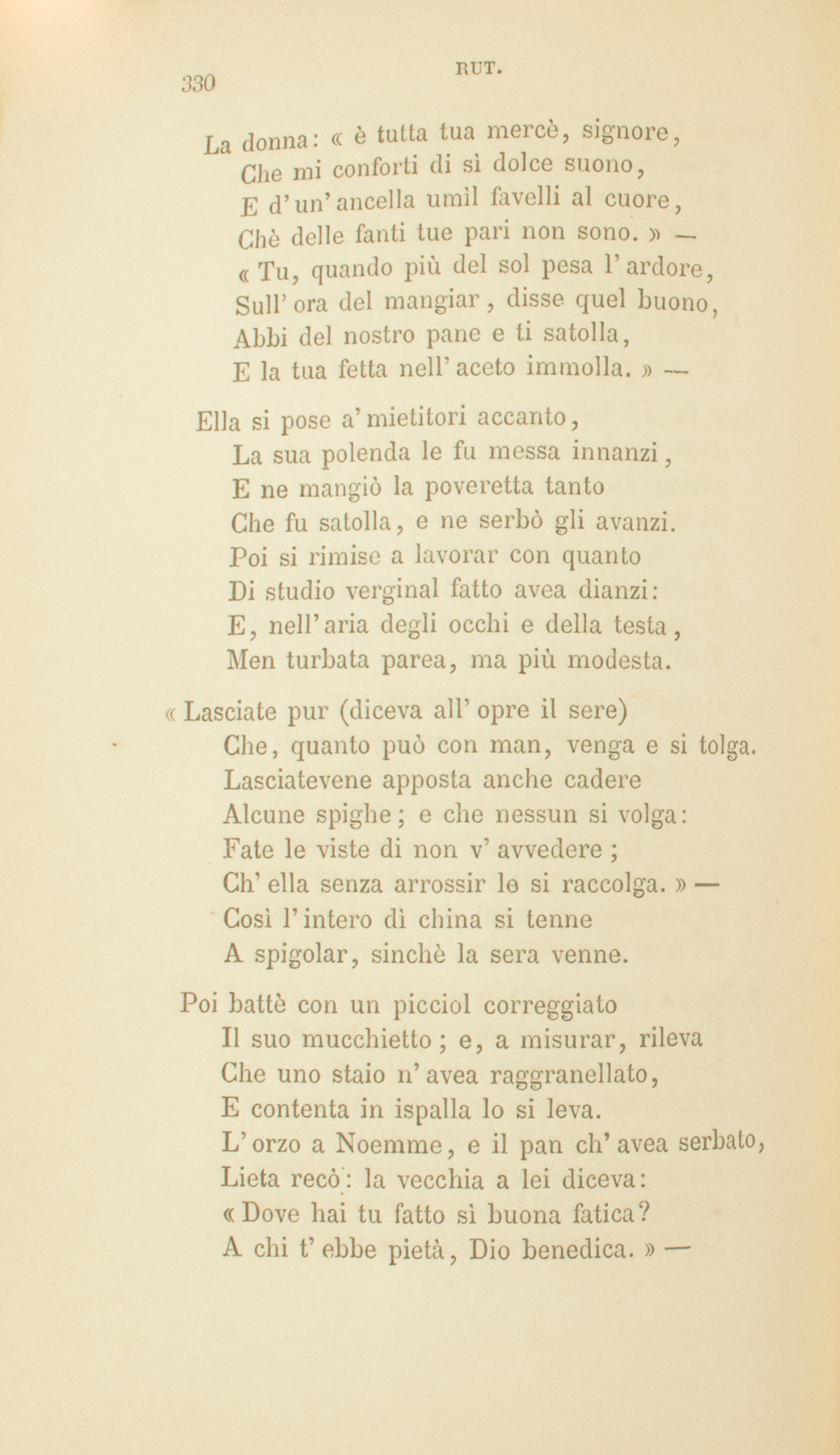Mangiò Booz e bevve; e, non già brillo,Ma gaio, e in cor pensando a Dio, si gettaPresso le manne, e s’addormì tranquillo:Venne pian piano allor la poveretta,Prese il pallio tremando, e discoprillo,E, senza lui toccar, dappiè s’assetta.Era la notte al mezzo e molto scura:Booz, riscosso, a un tratto ebbe paura.Visto una donna che non gli favella,Si maraviglia; e «chi se’ tu?» — domanda.«I’ mi son Rut, la tua ùmile ancella,Che a te, congiunto nostro, s’accomanda,Perchè sul capo di lei meschinellaPietoso il pallio tuo levi ed ispanda.» —Ed ei: «ti benedica Iddio Signore:Gran bontà già facesti, ed or maggiore.Che non badasti a ricchi o a poverettiNell’età ch’è più credula ed ardente.Or non vo’, figlia mia, che tu sospetti;Il tuo desìo farò compiutamente.Làsciati andare a’ tuoi bennati affetti;Perchè, certo son io, tutta la genteCh’è nella mia città, vede e sa bene,Figlia mia, che tu se’ donna dabbene.Congiunto io son di sangue a te, nol nego;Ma un altro abbiam che t’è più stretto ancora.Nella pace d’Iddio dormi, ti prego;Poi, come appaia un primo albor d’aurora,Andremo, e s’e’ ti vuole, a lui ti lego;Se no, t’avrei per mia senza dimora.Testimon del mio cuore Iddio mi sia:Dormi in pace a doman, figliuola mia.» —Ella, contenta, al sonno si compone:E s’alzò quando il ciel non anco albeggia,Che non ben si conoscon le persone:«Va, — le diss’egli, — e che nessun ti veggia.» —E spiega il pallio a terra, e in quello poneSei moggia d’orzo, e con una correggiaStringe le cocche, e gliel pone in ispalle:Ella sen va per un ombroso calle.Entra in Betlemme; e, trepidando, pronta,«Dimmi, figliuola mia, quel che facesti,» —La suocera domanda: ella raccontaGli atti dell’uomo e i suoi parlari onesti.«Queste sei moggia poi d’orzo e’ mi conta.Buono è ’l consiglio, o madre, che tu desti.» —E quella: «aspetta, e tu vedrai ch’e’ vuoleTutte, o figlia, adempir le sue parole.» —IV.