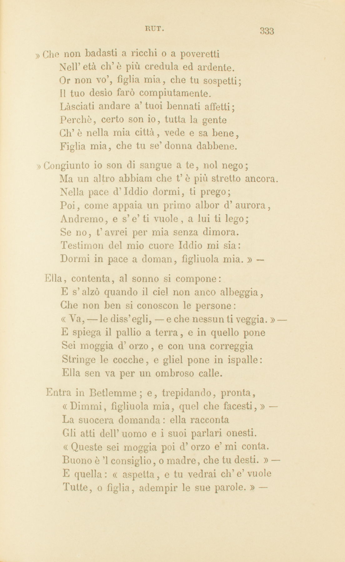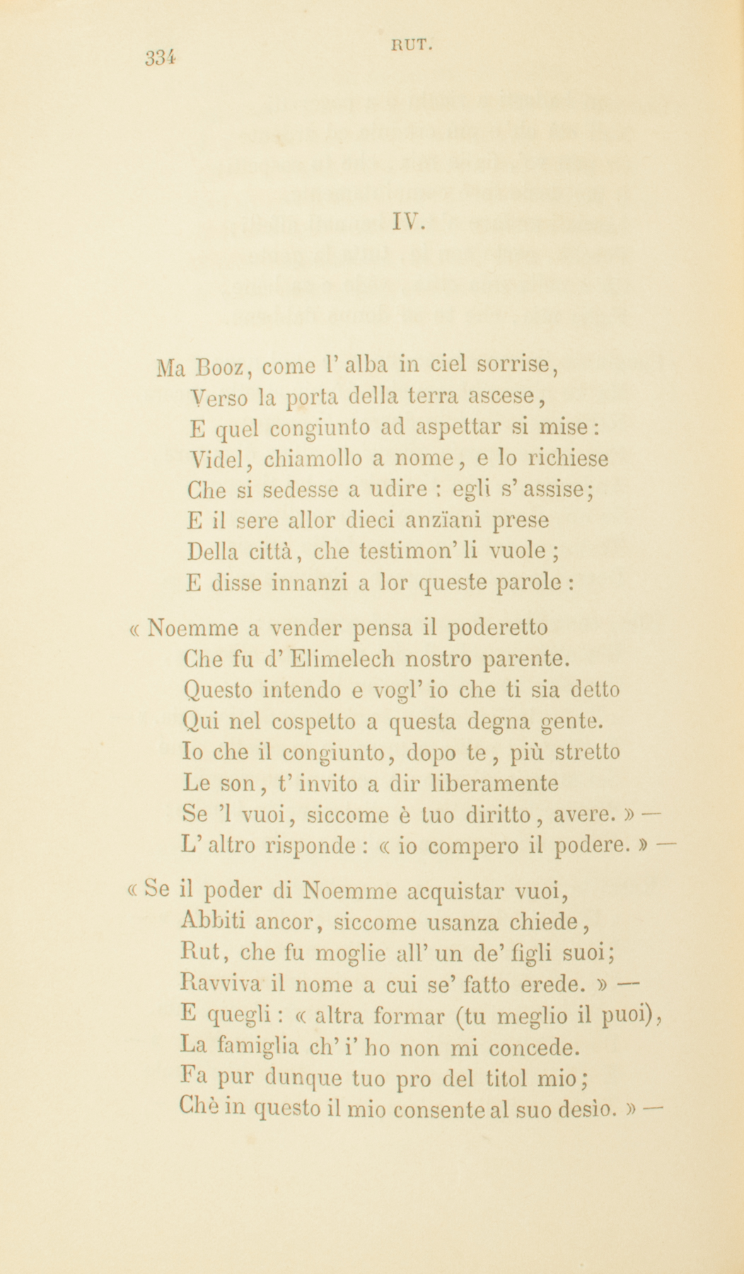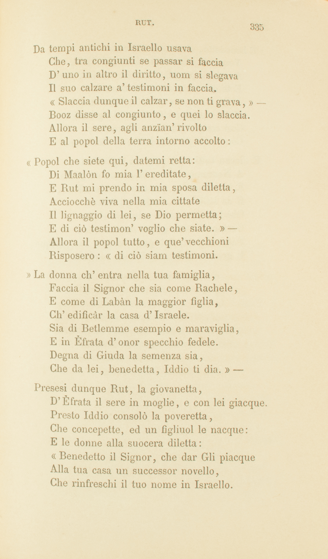 Ma Booz, come l’alba in ciel sorrise,Verso la porta della terra ascese,E quel congiunto ad aspettar si mise:Videi, chiamollo a nome, e lo richieseChe si sedesse a udire: egli s’assise;E il sere allor dieci anzïani preseDella città, che testimon’ li vuole;E disse innanzi a lor queste parole:«Noemme a vender pensa il poderettoChe fu d’Elimelech nostro parente.Questo intendo e vogl’io che ti sia dettoQui nel cospetto a questa degna gente.Io che il congiunto, dopo te, più strettoLe son, t’invito a dir liberamenteSe ’l vuoi, siccome è tuo diritto, avere.» —L’altro risponde: «io compero il podere.» —«Se il poder di Noemme acquistar vuoi,Abbiti ancor, siccome usanza chiede,Rut, che fu moglie all’un de’ figli suoi;Ravviva il nome a cui se’ fatto erede.» —E quegli: «altra formar (tu meglio il puoi),La famiglia ch’i’ ho non mi concede.Fa pur dunque tuo pro del titol mio;Chè in questo il mio consente al suo desìo.» —Da tempi antichi in Israello usavaChe, tra congiunti se passar si facciaD’uno in altro il diritto, uom si slegavaIl suo calzare a’ testimoni in faccia.«Slaccia dunque il calzar, se non ti grava,» —Booz disse al congiunto, e quei lo slaccia.Allora il sere, agli anzian’ rivoltoE al popol della terra intorno accolto:«Popol che siete qui, datemi retta:Di Maalòn fo mia l’ereditate,E Rut mi prendo in mia sposa diletta,Acciocchè viva nella mia cittateIl lignaggio di lei, se Dio permetta;E di ciò testimon’ voglio che siate.» —Allora il popol tutto, e que ’vecchioniRisposero: «di ciò siam testimoni.La donna ch’entra nella tua famiglia,Faccia il Signor che sia come Rachele,E come di Labàn la maggior figlia,Ch’edificàr la casa d’Israele.Sia di Betlemme esempio e maraviglia,E in Èfrata d’onor specchio fedele.Degna di Giuda la semenza sia,Che da lei, benedetta, Iddio ti dia.» —Presesi dunque Rut, la giovanetta,D’Èfrata il sere in moglie, e con lei giacque.Presto Iddio consolò la poveretta,Che concepette, ed un figliuol le nacque:E le donne alla suocera diletta:«Benedetto il Signor, che dar Gli piacqueAlla tua casa un successor novello,Che rinfreschi il tuo nome in Israello.E benedetto, che tanta dolcezzaVersa alla fine su’ tuoi lunghi duoli.Avrai chi guardi almen la tua vecchiezza,E te di cara compagnia consoli.Della tua nuora avrai la tenerezza,Molto maggior che di molti figliuoli.» —Così congratulavano a Noemme,Con molto dir, le donne di Betlemme.E dicean tutti: «è nato un figliuolettoA Noemme;» — e Noemme ne godea:E lo portava in sen con grande affetto,E da balia e da madre gli facea.Obèd posero nome a lui ch’elettoGerme d’eletta gente esser dovea;Padre d’Isài, del qual, come a Dio piacque,Il gran re d’Israel, Dàvide nacque.