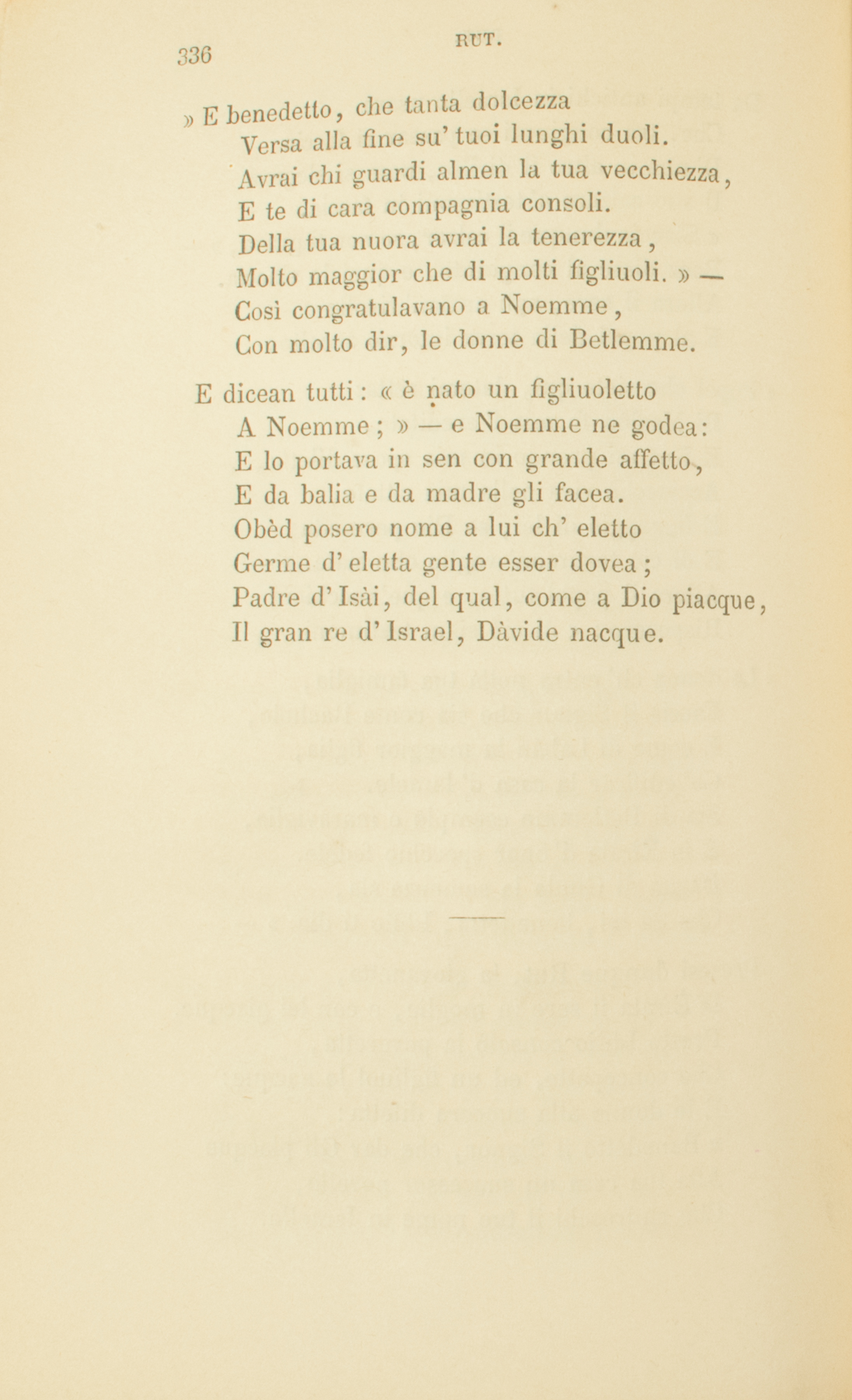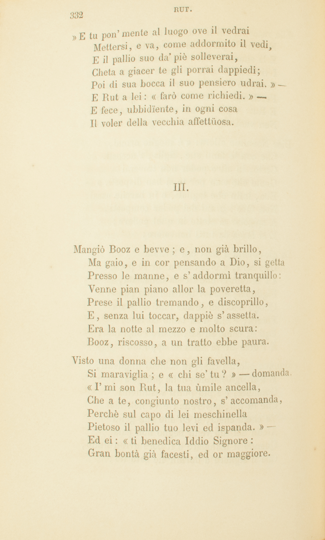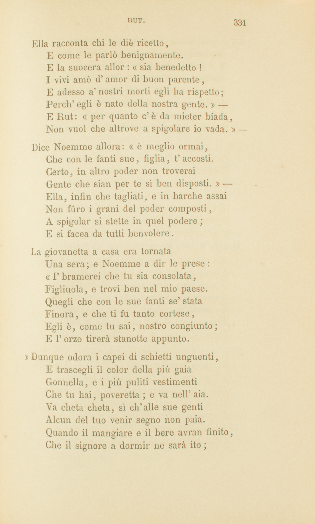 Ma Booz, come l’alba in ciel sorrise,Verso la porta della terra ascese,E quel congiunto ad aspettar si mise:Videi, chiamollo a nome, e lo richieseChe si sedesse a udire: egli s’assise;E il sere allor dieci anzïani preseDella città, che testimon’ li vuole;E disse innanzi a lor queste parole:«Noemme a vender pensa il poderettoChe fu d’Elimelech nostro parente.Questo intendo e vogl’io che ti sia dettoQui nel cospetto a questa degna gente.Io che il congiunto, dopo te, più strettoLe son, t’invito a dir liberamenteSe ’l vuoi, siccome è tuo diritto, avere.» —L’altro risponde: «io compero il podere.» —«Se il poder di Noemme acquistar vuoi,Abbiti ancor, siccome usanza chiede,Rut, che fu moglie all’un de’ figli suoi;Ravviva il nome a cui se’ fatto erede.» —E quegli: «altra formar (tu meglio il puoi),La famiglia ch’i’ ho non mi concede.Fa pur dunque tuo pro del titol mio;Chè in questo il mio consente al suo desìo.» —Da tempi antichi in Israello usavaChe, tra congiunti se passar si facciaD’uno in altro il diritto, uom si slegavaIl suo calzare a’ testimoni in faccia.«Slaccia dunque il calzar, se non ti grava,» —Booz disse al congiunto, e quei lo slaccia.Allora il sere, agli anzian’ rivoltoE al popol della terra intorno accolto:«Popol che siete qui, datemi retta:Di Maalòn fo mia l’ereditate,E Rut mi prendo in mia sposa diletta,Acciocchè viva nella mia cittateIl lignaggio di lei, se Dio permetta;E di ciò testimon’ voglio che siate.» —Allora il popol tutto, e que ’vecchioniRisposero: «di ciò siam testimoni.La donna ch’entra nella tua famiglia,Faccia il Signor che sia come Rachele,E come di Labàn la maggior figlia,Ch’edificàr la casa d’Israele.Sia di Betlemme esempio e maraviglia,E in Èfrata d’onor specchio fedele.Degna di Giuda la semenza sia,Che da lei, benedetta, Iddio ti dia.» —Presesi dunque Rut, la giovanetta,D’Èfrata il sere in moglie, e con lei giacque.Presto Iddio consolò la poveretta,Che concepette, ed un figliuol le nacque:E le donne alla suocera diletta:«Benedetto il Signor, che dar Gli piacqueAlla tua casa un successor novello,Che rinfreschi il tuo nome in Israello.E benedetto, che tanta dolcezzaVersa alla fine su’ tuoi lunghi duoli.Avrai chi guardi almen la tua vecchiezza,E te di cara compagnia consoli.Della tua nuora avrai la tenerezza,Molto maggior che di molti figliuoli.» —Così congratulavano a Noemme,Con molto dir, le donne di Betlemme.E dicean tutti: «è nato un figliuolettoA Noemme;» — e Noemme ne godea:E lo portava in sen con grande affetto,E da balia e da madre gli facea.Obèd posero nome a lui ch’elettoGerme d’eletta gente esser dovea;Padre d’Isài, del qual, come a Dio piacque,Il gran re d’Israel, Dàvide nacque.