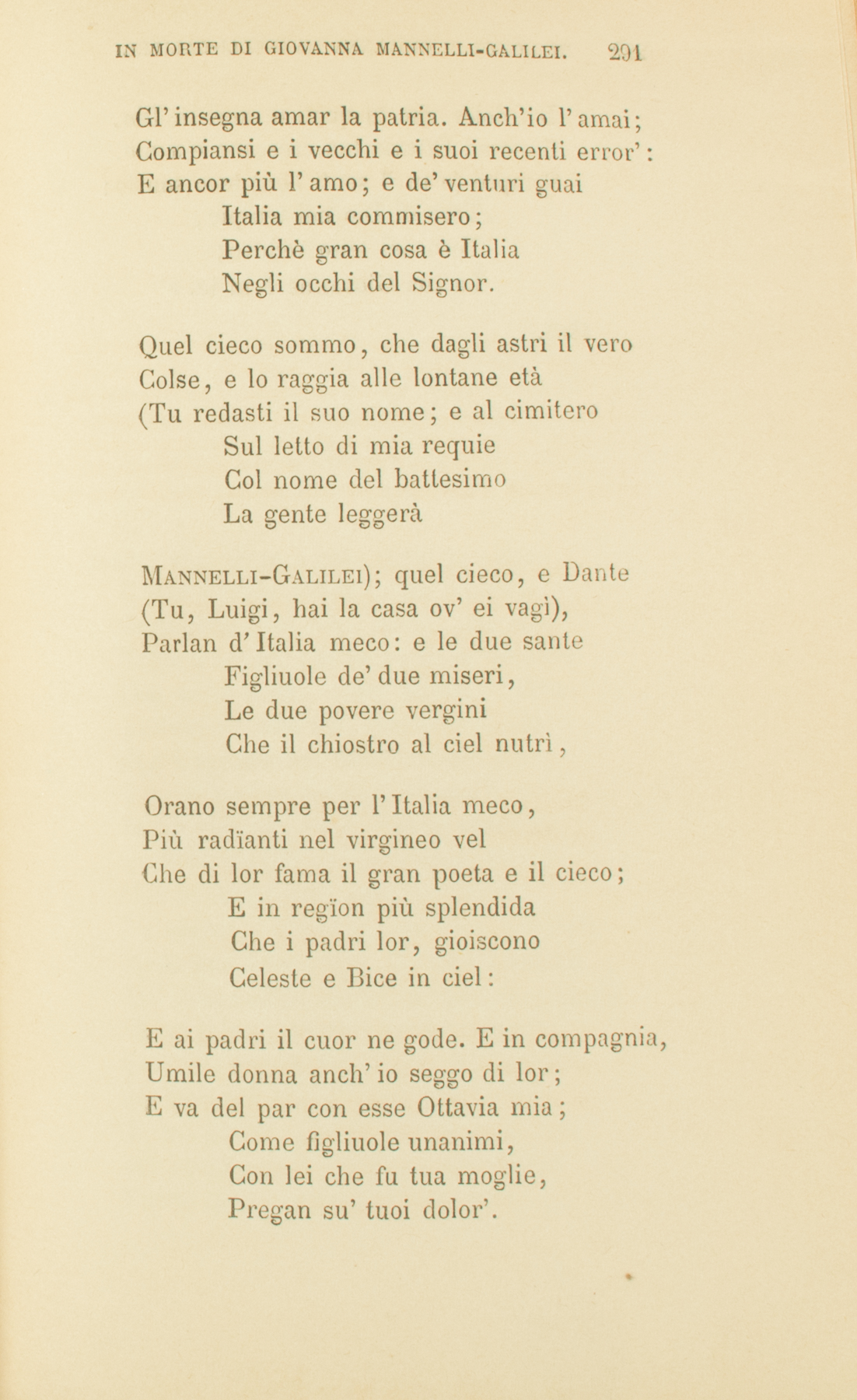 Allor che ’l fremito de la pugna da l’ardua torreAscolto, al sommo del petto il core mi balza,E dico: ahi quanti da la ferrea destra di MartePer te tormenti sostengono, svergognata,Troia di destrieri domitrice e i nobili Achei!Per te di vedove consorti e d’orfana prole,Fùnebre, ne’ tetti, ne’ templi corre ululato,Che ’l giovane ancora genitore e il dolce maritoVeggono travolti rotolar ne la polvere, e piantoE laï versando sul petto recente ferito,Reggono con mano la cara cervice cadente.Ma de gli estinti e de’ gementi ti fugge la vistaSe Paride ammiri tornar da la strage cruentaIncolume. E te, da lungi accennante, saluta;E il sangue appreso e ’l tintinno de l’arme sonantiLo fan più bello. Ma tu l’ancelle chiomateSollecita appelli, gli apprestino i caldi lavacri.E’ sale a l’alte case: e, ancor di lorìca gravato,I’ me gli stringo, com’ellera lussurïanteA querce altera frondente di verde novello;E la man trepida, le ondanti creste de l’elmoPosate a terra, il bel crine di polvere sparsoCarezza, e terge il sudor de le floride guance.Ahi! ma le abondanti dal petto care paroleUn nume ignoto raffredda, e la voce rimansiStretta alle fauci nel nome di dolce marito.E quando, in forte amplesso commista d’amore,Il cor segreto tutto negli ignei baciSi sface, nomarlo la bocca ansante ricusaUom mio. Deh quanto con lacrime t’invïdiai,Te che al compresso mio duol compiangi tacendo,Figlia di Priamo, bella d’Elicáone sposa,Laódice! A te di pura dolcezza rigatiGli amplessi, a te di tristo rossore la fronteImmacolata. E tu, splendor de le troadi ninfe,Oh tu cui ’l sacro Priamo parla riverente,Andròmaca, allor che incedi a Dïana simìle,Bella d’odorato peplo e d’argentei veli,A te d’intorno un sommesso d’amore susurroCorre, e l’ùmil volgo s’arrestano contemplando.Perchè la vista di quel tuo dolce rosatoPallor virgineo e de’ semplici sguardi soaviRegger non posso? Perchè tua voce modesta,Qual d’usignolo ch’entro a fragrante rosetoCanta sul primo tremolar de le vergini stelle,Mi suona nel petto quasi suon di triste novella?Fuggir m’è forza e della magion ne’ recessiCelar la cura. Quivi Etra di Pìtteo nata,E Clìmene fida, ridenti ancelle, beateAncor del tenero fior dell’improvvida vita,A me pensosa, tessente le lucide tele,Trascorrer fanno talor su la china pupillaUn mesto riso. Ma quando la lor giovinettaBeltà ragguardo, mi toma söave dinanziDi te che ’n Argo le morbide tele sedeviMeco tessendo, cara nutrice, l’imagoMaterna. E Giuno mi mette ne l’intimo pettoDe’ patrii tetti, de’ non più visti parenti,E di chi primo mi fe’ sua, dolce la brama.Ma come, ahi misera! de le donne argive lo sguardo,O del cognato, o di te soffrire potrei,Figlia? Quale a me, di doglie tante ministra,Qual fôra l’amplesso, la voce de l’inclito Atride?Stolta! e tu pensi ch’e’ dorma fredde le notti,Di te sognando, Meneläo di Marte l’amico,Nè tenere ancelle, all’incendio di predataCittà sottratte, dono di nobili Achei,Di giovane amplesso l’allegrino ? Tale d’amoriPonesti a’ ciechi mortali immobile fatoTu, Dea, che a Gnido sorridi ed a l’alta Citera.Di Giove l’arcano senno a te, lieta Afrodìte,Serve; e la madre mia l’attesta, e i forti gemelli,Castore del corso mastro, Polluce de l’armi.E tu l’attesti, dell’inclito BellerofonteNata, ch’a l’Egioco confusa in amore, creastiIl simile a’ numi Sarpedone, Laodamìa.Queste ne l’intimo core mi mormora blande loqueleLa santa Citerèa, ch’a me de le cure latentiSgombra da l’immoto pensiere la pallida nube.Talor la veggo spuntar ne’ languidi sogni,Come da l’Oceano i raï d’Espero dolce-tremanti;E al seno, ed al passo leggier quasi voi di colomba,La Dea conosco. Ridesta, in amor mi si volgeL’infiammata anima; e al chiaror de la luce novellaChe su i torniti letti risplende, lo veggo,I be’ crin, sulla rosea cervice fluenti(Quale infra’ lauri d’Eürota il Cinzio nume,O quale in selva il bellissimo Endimïone),Quel per cui Priamo sua figlia dolce mi noma.Dal suo respiro i’ pendo, e me dico beataCh’unica fra tutte l’argive e le troadi ninfeOrno gli odorati talami di tale marito.E se di veli ondeggianti e di splendido peploBella oltre all’uso i’ paio, e più vivida fiammaPer me ’l pensiero comprendegli, grazie vêr teUnqua più calde non salsero, lieta Afrodite.Ma nè i diletti nè ’l duol del core profondoHo cui narrarli: nè qui di conscio risoSon dati a me misera i conforti, o di conscio lutto.Qual chi per selva di pruneti orrida e d’anguiCerca smarrito calle e vestigïa note,I’ non rinvengo me stessa. E stranïa vivo,Strania vivrommi finché vecchiaia mi colgaSquallida ne’ tetti per me di floride viteOrbati. Lutto a’ presenti, infame saraiFavola a’ venturi. Deh morte piaciuta mi fosseAnzi che ’l talamo antico e i diletti parentiLasciar! Deh slanciata m’avesse la negra procellaSu i ripidi scogli o ne la spuma de l’onde sonanti!