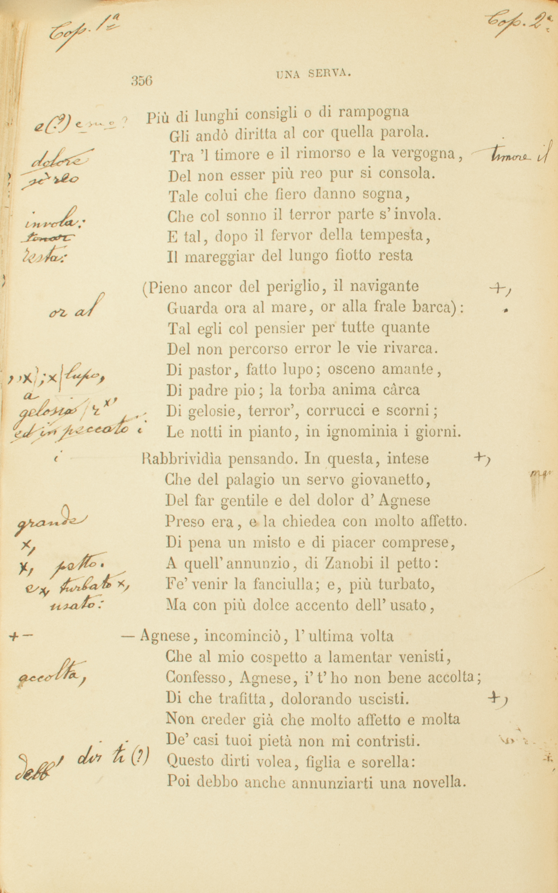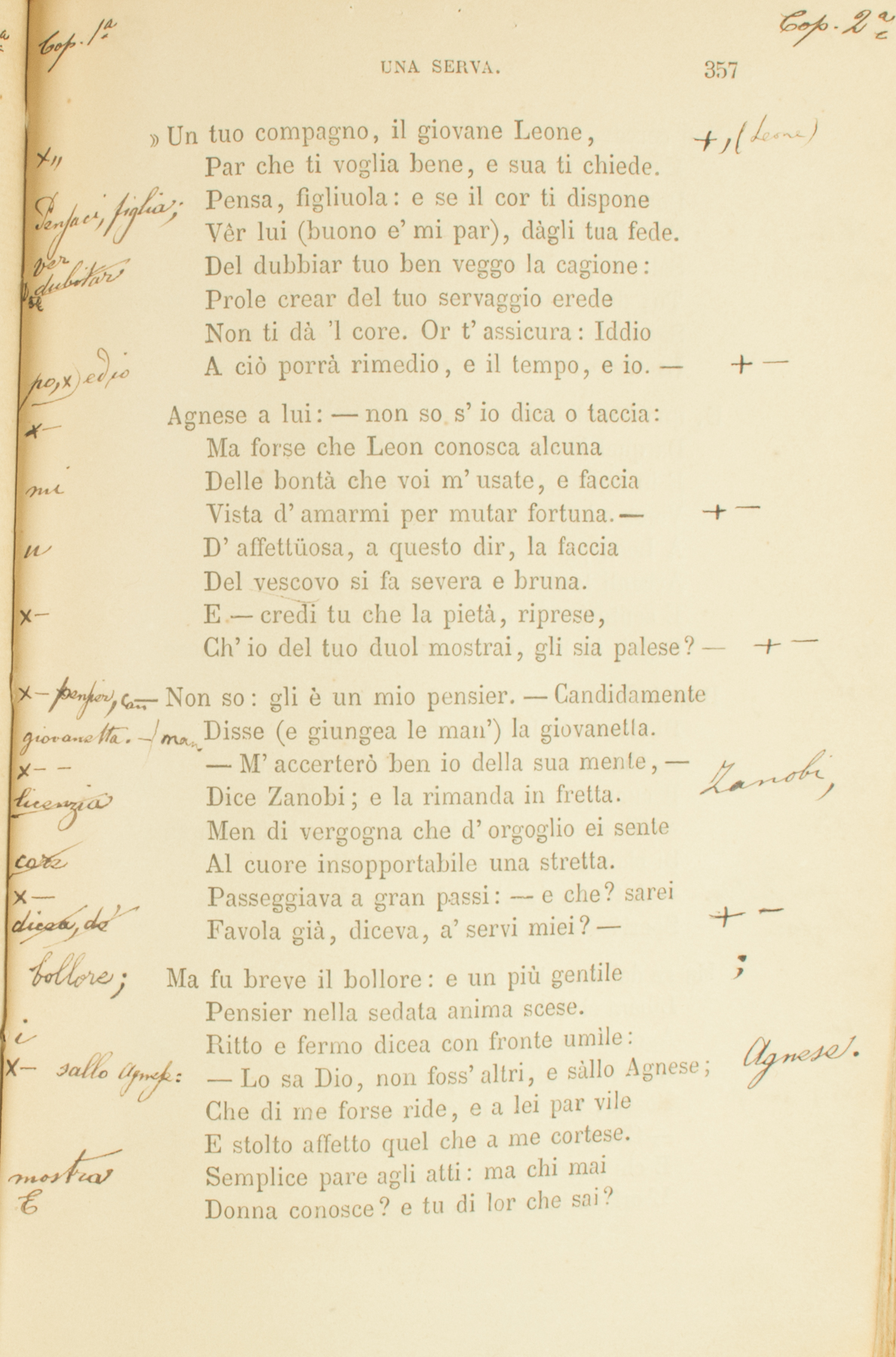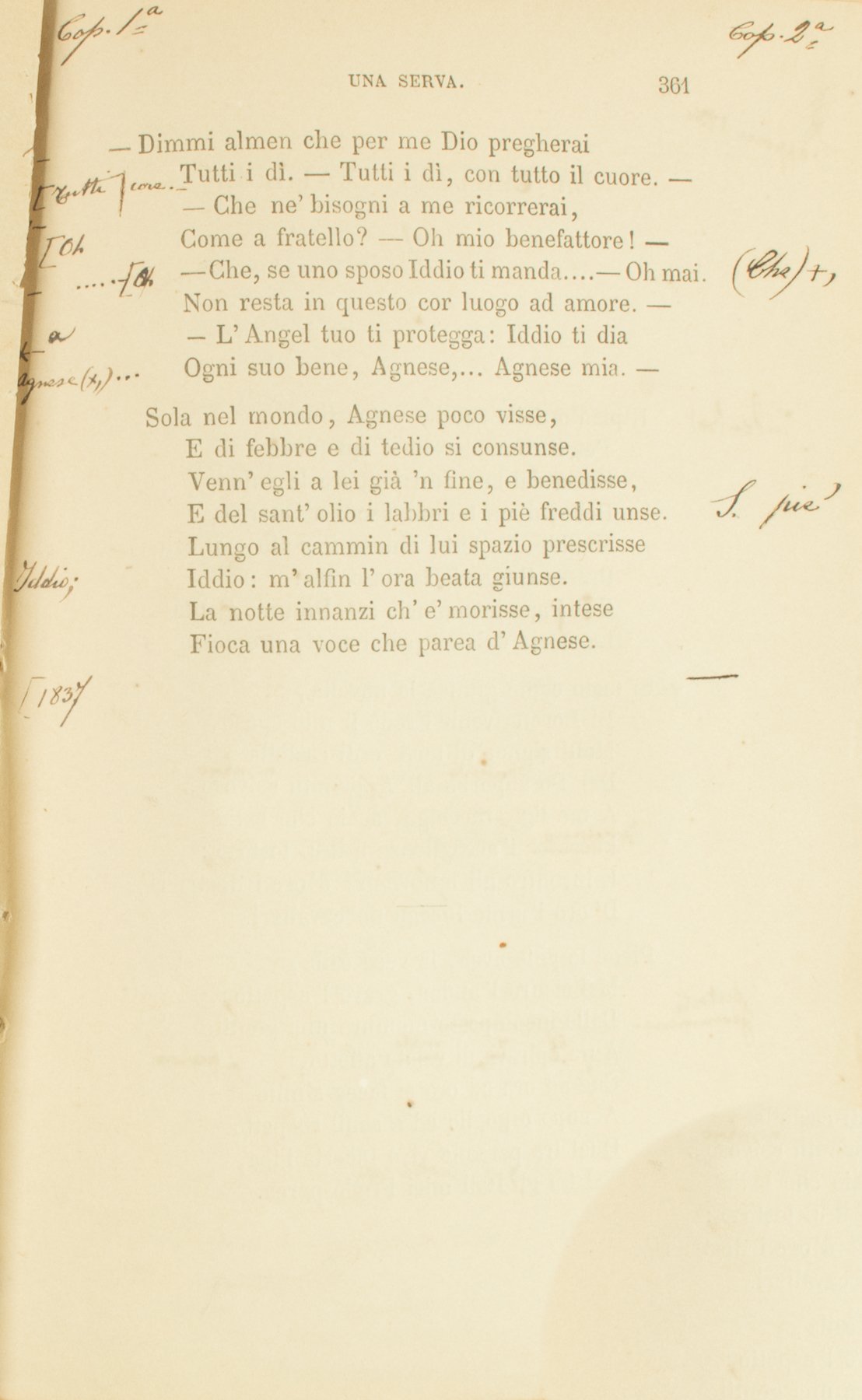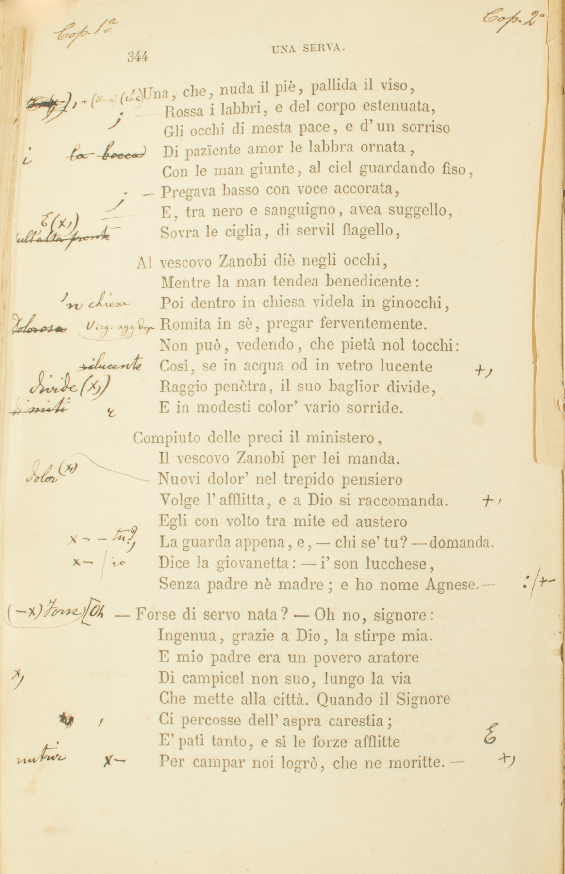 Verso il monte ascendean dalla pianuraChe lungo il tuo bel fiume, Arno, dechina.L’ombra involvea le falde, in sull’alturaL’ aure godean la luce mattutina.Or appariano ed or tra la verzuraSi nascondean, la salmodia divinaCantando a due a due la turba pia;E il vescovo Zanobi li seguia.Benedicean la terra, e buona annataChiedeva il pio colono al buon Signore.La primavera sorridea beata,E tutta la campagna era un amore;E, di pioggie recenti consolata,Si rinverdiva nell’amato umoreOgni ùmil fronda, ogni foglia novella,E dire un inno a Dio pareva anch’ella.Nel pensar che i figli vostriFieno, o Padre, liberati,Si sentîro i pensier’ nostriConsolati. Sulla lingua i lieti accentiAbbondâr dal cuore espressi.Fu il Signor, diran le genti,Grande in essi.Il Signor fu grande in noi:La letizia nostra è piena.Togli, o Padre, i cari tuoiDi catena.Il torrente innondatoreL’ire omai del flutto ha quete.L’uom che semina in dolore,Gioia miete.Mesti andavan seminandoLor sementa: ed or verranno,E, i manipoli portando,Gioiranno.Seguitavan chiamando in lor preghiera,Angeli, il vostro nome, e il tuo, Maria;E il Battista, pensosa anima austera,E tutti che sperâr certo il Messia;E gl’Innocenti, pargoletta schiera;E i Dodici da Pier fino a Mattia;E i Romiti, e i Dottor’ di sacre cose,E i Martiri, e le Donne affettuose.Alto levaiGli occhi, e pregai,A te che in cielDimore,Come famiglioTien fiso il ciglioAl suo fedelSignore.Come serventeGuarda umilmenteLa donna suaCh’ell’ama;Il nostro amoreGuarda, o Signore,La faccia tuaCon brama.Pietà, buon Dio,L’onta c’empioD’un duolo acerboA morte.D’onta e di penaNostr’alma è piena,Scherno al superboE al forte.Giungeano a passo lento in cima al colleOve mostra sue croci e biancheggianteLa cattedral di Fiesole s’estolleTra ’l verde lieto delle folte piante.Inginocchion sulle sudate zolleStavan di molte donne al tempio innante:E ve n’avea di condizion servile,Mancipii del palazzo vescovile.Una, che, nuda il piè, pallida il viso,Rossa i labbri, e del corpo estenuata,Gli occhi di mesta pace, e d’un sorrisoDi pazïente amor le labbra ornata,Con le man giunte, al ciel guardando fiso,Pregava basso con voce accorata,E, tra nero e sanguigno, avea suggello,Sovra le ciglia, di servil flagello,Al vescovo Zanobi diè negli occhi,Mentre la man tendea benedicente:Poi dentro in chiesa videla in ginocchi,Romita in sè, pregar ferventemente.Non può, vedendo, che pietà nol tocchi:Così, se in acqua od in vetro lucenteRaggio penètra, il suo baglior divide,E in modesti color’ vario sorride.Compiuto delle preci il ministero,Il vescovo Zanobi per lei manda.Nuovi dolor’ nel trepido pensieroVolge l’afflitta, e a Dio si raccomanda.Egli con volto tra mite ed austeroLa guarda appena, e, — chi se’ tu? —domanda.Dice la giovanetta: — i’ son lucchese,Senza padre nè madre; e ho nome Agnese. —— Forse di servo nata? — Oh no, signore:Ingenua, grazie a Dio, la stirpe mia.E mio padre era un povero aratoreDi campicel non suo, lungo la viaChe mette alla città. Quando il SignoreCi percosse dell’aspra carestia;E’ patì tanto, e sì le forze afflittePer campar noi logrò, che ne moritte. —Foglio aggiunto con postille, r.Foglio aggiunto con postille, v.Tutta nel suo pensier si stette alquanto;Egli pietoso in lei lo sguardo fisse:— Segui, infelice. - Ed ella: - orfano, accanto...—E arrossiva e piangeva: e più non disse.— Orfano, tu dicevi? Accheta il pianto;Dimmi il nuovo dolor che ti trafisse.Parli a chi ti compiange: apri il tuo cuore:Non il signor, t’ascolta il tuo Pastore. —— Orfano, accanto al nostro poderetto,Un giovanetto povero vivea. —Qui si tacque: e ’l Pastor, pio nell’aspetto,— Segui, figliuola. — Agnese rispondea:«La madre e il padre mio, quel giovanettoChiamavan sempre all’opre: io ne godea.Come figliuolo suo l’amavan quelli,E no’ due ci amavan come fratelli.Quando vide portarsi in chiesa il padre,Non fu men alto il suo del nostro strido.Poscia de’ suoi sudor’ me con mia madreMantenea, di dì ’n dì sempre più fido.Ma la fame crescea. Quando le squadreSotto l’insegna dell’Augusto Guido,Di marchigiana gente e di franceseE di toscana nostra, armarsi intese;Pensò che meglio con l’opra guerriera(Misere noi!) ci avria fornito un pane;E ci lasciò solette a primavera,Per far la guerra in contrade lontane.E combattè nella battaglia fieraDove tedesche genti e friulaneFuggiro, è fama, come al vento nebbia,Là presso un fiume che si chiama Trebbia.Quando si seppe noi della vittoria,Ah che gioioso dì, signor, fu quello!— Egli riviene a noi, nè senza gloria:Lo rivedrem — dicevo — il mio fratello. —I’ vidi ritornar (fiera memoria!)Ricchi di preda que’ del suo drappello,Empiendo i campi e il ciel di lieti gridiChe mi ferìano il cor: ma lui non vidi.Seppi che, nel fervor della battaglia,Toccata il prode non avea ferita:Ma tra’ fuggenti, misero! si scaglia,E, stretto in mezzo a lor, perdè la vita.A noi due poverette, orbe in gramaglia,La gente, a’ mali nostri impietosita,Povera anch’essa, alcun soccorso dava;Ma la fame crudel continuava.E mia madre.... Or non più. Che importa a voiDi me meschina e della mia sventura? —— Segui, diss’egli, e narra i dolor’ tuoi.Anche in me le sue piaghe aprì natura. —Tacque ella un poco, lagrimando; e poi:— Dal tapinar della sua crëatura,Più che dal suo, mia madre consumata,Dopo molto languir cadde malata.Per procacciarle un po’ di pane asciutto,Sola nel letto lasciarla i’ dovea.Ella metteasi inginocchioni, e tuttoQuel tempo lo pregava e lo piangea.Queste parole: benedetto il fruttoDelle viscere tue, sempre dicea:Ora, o Madre di Dio, per noi meschineAdesso e all’ora della nostra fine.Foglio aggiunto con postille, r.Foglio aggiunto con postille, v.Foglio aggiunto con postille, r.Foglio aggiunto con postille, v.Una mattina i’ esco, in sulla viaMi metto, e tutto il santo giorno attendoChi un poco di pan per lei mi dia;Torno la sera
