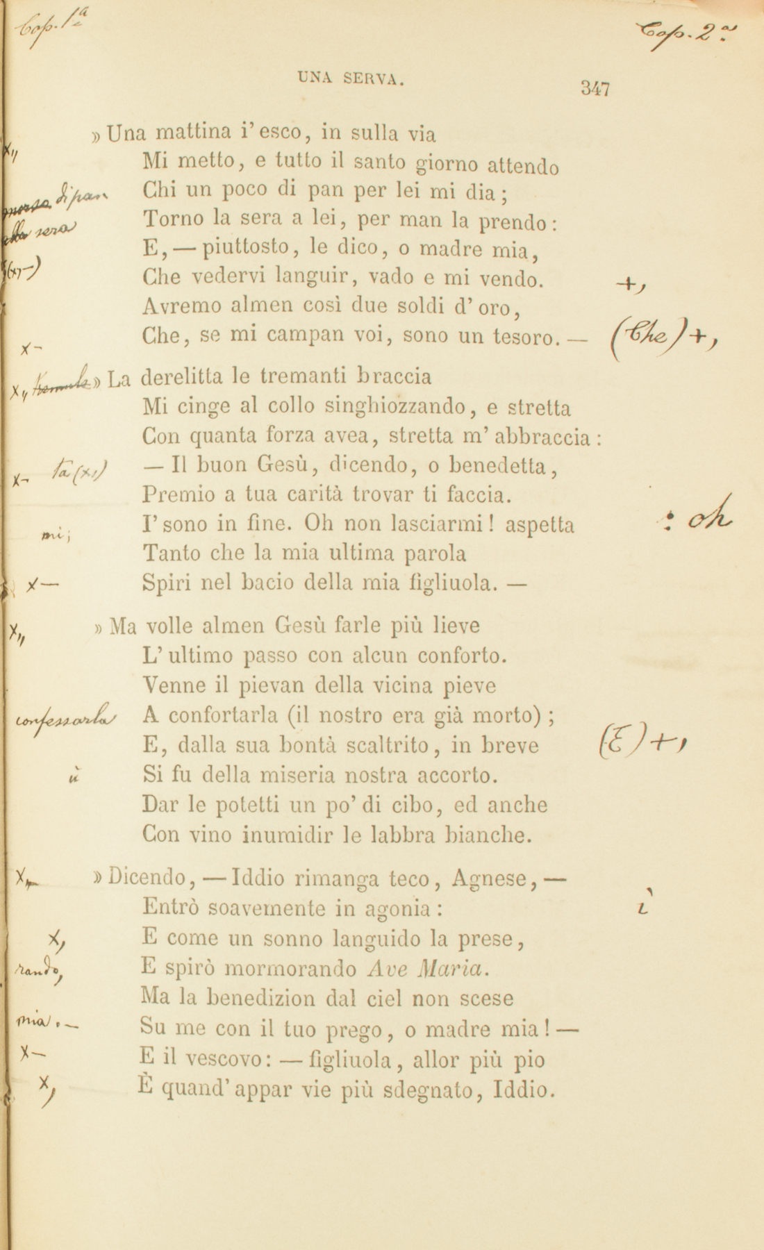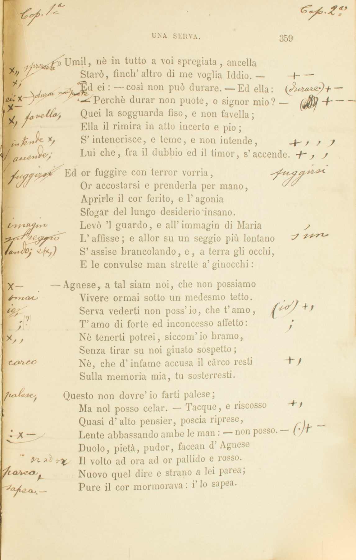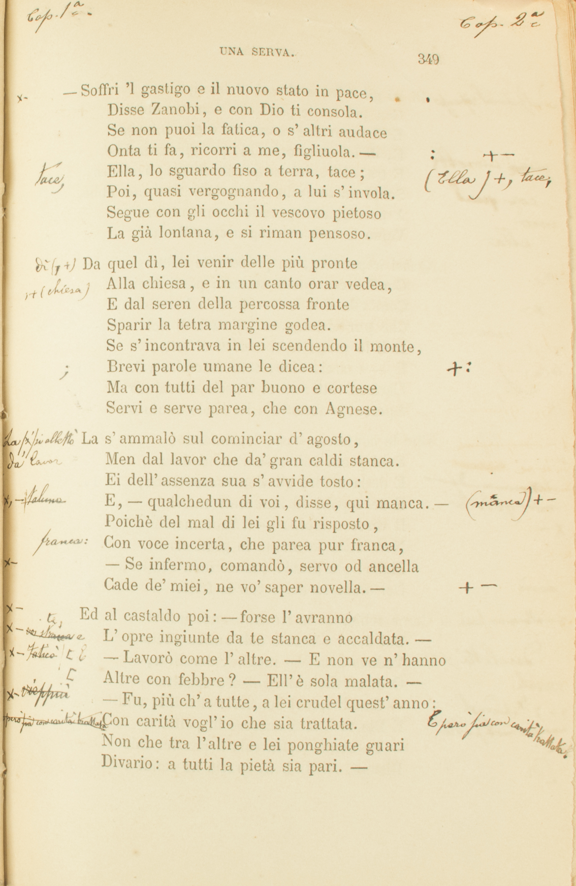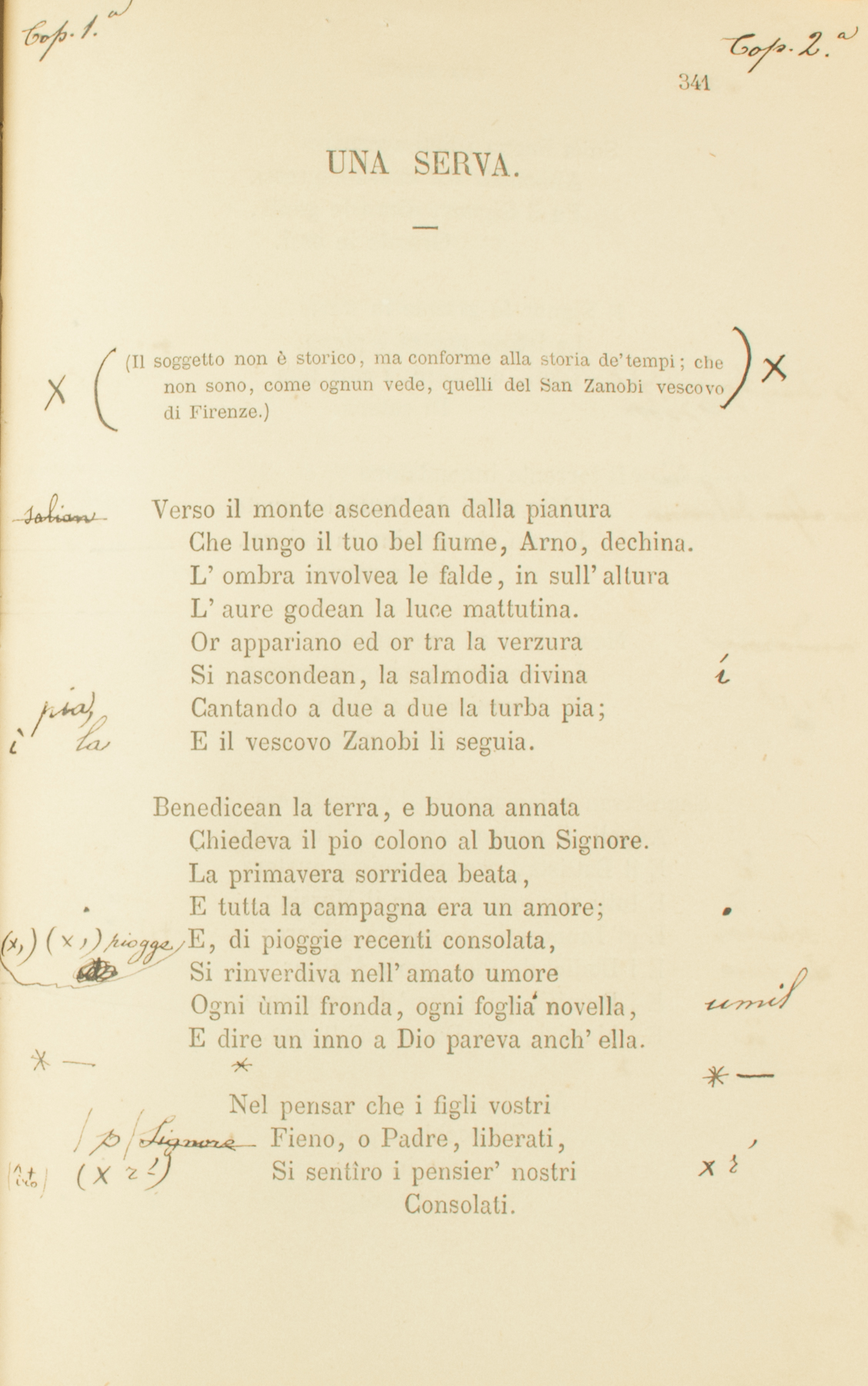Verso il monte ascendean dalla pianuraChe lungo il tuo bel fiume, Arno, dechina.L’ombra involvea le falde, in sull’alturaL’ aure godean la luce mattutina.Or appariano ed or tra la verzuraSi nascondean, la salmodia divinaCantando a due a due la turba pia;E il vescovo Zanobi li seguia.Benedicean la terra, e buona annataChiedeva il pio colono al buon Signore.La primavera sorridea beata,E tutta la campagna era un amore;E, di pioggie recenti consolata,Si rinverdiva nell’amato umoreOgni ùmil fronda, ogni foglia novella,E dire un inno a Dio pareva anch’ella.Nel pensar che i figli vostriFieno, o Padre, liberati,Si sentîro i pensier’ nostriConsolati. Sulla lingua i lieti accentiAbbondâr dal cuore espressi.Fu il Signor, diran le genti,Grande in essi.Il Signor fu grande in noi:La letizia nostra è piena.Togli, o Padre, i cari tuoiDi catena.Il torrente innondatoreL’ire omai del flutto ha quete.L’uom che semina in dolore,Gioia miete.Mesti andavan seminandoLor sementa: ed or verranno,E, i manipoli portando,Gioiranno.Seguitavan chiamando in lor preghiera,Angeli, il vostro nome, e il tuo, Maria;E il Battista, pensosa anima austera,E tutti che sperâr certo il Messia;E gl’Innocenti, pargoletta schiera;E i Dodici da Pier fino a Mattia;E i Romiti, e i Dottor’ di sacre cose,E i Martiri, e le Donne affettuose.Alto levaiGli occhi, e pregai,A te che in cielDimore,Come famiglioTien fiso il ciglioAl suo fedelSignore.Come serventeGuarda umilmenteLa donna suaCh’ell’ama;Il nostro amoreGuarda, o Signore,La faccia tuaCon brama.Pietà, buon Dio,L’onta c’empioD’un duolo acerboA morte.D’onta e di penaNostr’alma è piena,Scherno al superboE al forte.Giungeano a passo lento in cima al colleOve mostra sue croci e biancheggianteLa cattedral di Fiesole s’estolleTra ’l verde lieto delle folte piante.Inginocchion sulle sudate zolleStavan di molte donne al tempio innante:E ve n’avea di condizion servile,Mancipii del palazzo vescovile.Una, che, nuda il piè, pallida il viso,Rossa i labbri, e del corpo estenuata,Gli occhi di mesta pace, e d’un sorrisoDi pazïente amor le labbra ornata,Con le man giunte, al ciel guardando fiso,Pregava basso con voce accorata,E, tra nero e sanguigno, avea suggello,Sovra le ciglia, di servil flagello,Al vescovo Zanobi diè negli occhi,Mentre la man tendea benedicente:Poi dentro in chiesa videla in ginocchi,Romita in sè, pregar ferventemente.Non può, vedendo, che pietà nol tocchi:Così, se in acqua od in vetro lucenteRaggio penètra, il suo baglior divide,E in modesti color’ vario sorride.Compiuto delle preci il ministero,Il vescovo Zanobi per lei manda.Nuovi dolor’ nel trepido pensieroVolge l’afflitta, e a Dio si raccomanda.Egli con volto tra mite ed austeroLa guarda appena, e, — chi se’ tu? —domanda.Dice la giovanetta: — i’ son lucchese,Senza padre nè madre; e ho nome Agnese. —— Forse di servo nata? — Oh no, signore:Ingenua, grazie a Dio, la stirpe mia.E mio padre era un povero aratoreDi campicel non suo, lungo la viaChe mette alla città. Quando il SignoreCi percosse dell’aspra carestia;E’ patì tanto, e sì le forze afflittePer campar noi logrò, che ne moritte. —Foglio aggiunto con postille, r.Foglio aggiunto con postille, v.Tutta nel suo pensier si stette alquanto;Egli pietoso in lei lo sguardo fisse:— Segui, infelice. - Ed ella: - orfano, accanto...—E arrossiva e piangeva: e più non disse.— Orfano, tu dicevi? Accheta il pianto;Dimmi il nuovo dolor che ti trafisse.Parli a chi ti compiange: apri il tuo cuore:Non il signor, t’ascolta il tuo Pastore. —— Orfano, accanto al nostro poderetto,Un giovanetto povero vivea. —Qui si tacque: e ’l Pastor, pio nell’aspetto,— Segui, figliuola. — Agnese rispondea:«La madre e il padre mio, quel giovanettoChiamavan sempre all’opre: io ne godea.Come figliuolo suo l’amavan quelli,E no’ due ci amavan come fratelli.Quando vide portarsi in chiesa il padre,Non fu men alto il suo del nostro strido.Poscia de’ suoi sudor’ me con mia madreMantenea, di dì ’n dì sempre più fido.Ma la fame crescea. Quando le squadreSotto l’insegna dell’Augusto Guido,Di marchigiana gente e di franceseE di toscana nostra, armarsi intese;Pensò che meglio con l’opra guerriera(Misere noi!) ci avria fornito un pane;E ci lasciò solette a primavera,Per far la guerra in contrade lontane.E combattè nella battaglia fieraDove tedesche genti e friulaneFuggiro, è fama, come al vento nebbia,Là presso un fiume che si chiama Trebbia.Quando si seppe noi della vittoria,Ah che gioioso dì, signor, fu quello!— Egli riviene a noi, nè senza gloria:Lo rivedrem — dicevo — il mio fratello. —I’ vidi ritornar (fiera memoria!)Ricchi di preda que’ del suo drappello,Empiendo i campi e il ciel di lieti gridiChe mi ferìano il cor: ma lui non vidi.Seppi che, nel fervor della battaglia,Toccata il prode non avea ferita:Ma tra’ fuggenti, misero! si scaglia,E, stretto in mezzo a lor, perdè la vita.A noi due poverette, orbe in gramaglia,La gente, a’ mali nostri impietosita,Povera anch’essa, alcun soccorso dava;Ma la fame crudel continuava.E mia madre.... Or non più. Che importa a voiDi me meschina e della mia sventura? —— Segui, diss’egli, e narra i dolor’ tuoi.Anche in me le sue piaghe aprì natura. —Tacque ella un poco, lagrimando; e poi:— Dal tapinar della sua crëatura,Più che dal suo, mia madre consumata,Dopo molto languir cadde malata.Per procacciarle un po’ di pane asciutto,Sola nel letto lasciarla i’ dovea.Ella metteasi inginocchioni, e tuttoQuel tempo lo pregava e lo piangea.Queste parole: benedetto il fruttoDelle viscere tue, sempre dicea:Ora, o Madre di Dio, per noi meschineAdesso e all’ora della nostra fine.Foglio aggiunto con postille, r.Foglio aggiunto con postille, v.Foglio aggiunto con postille, r.Foglio aggiunto con postille, v.Una mattina i’ esco, in sulla viaMi metto, e tutto il santo giorno attendoChi un poco di pan per lei mi dia;Torno la sera