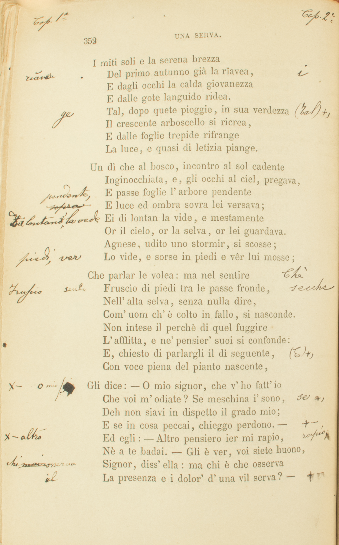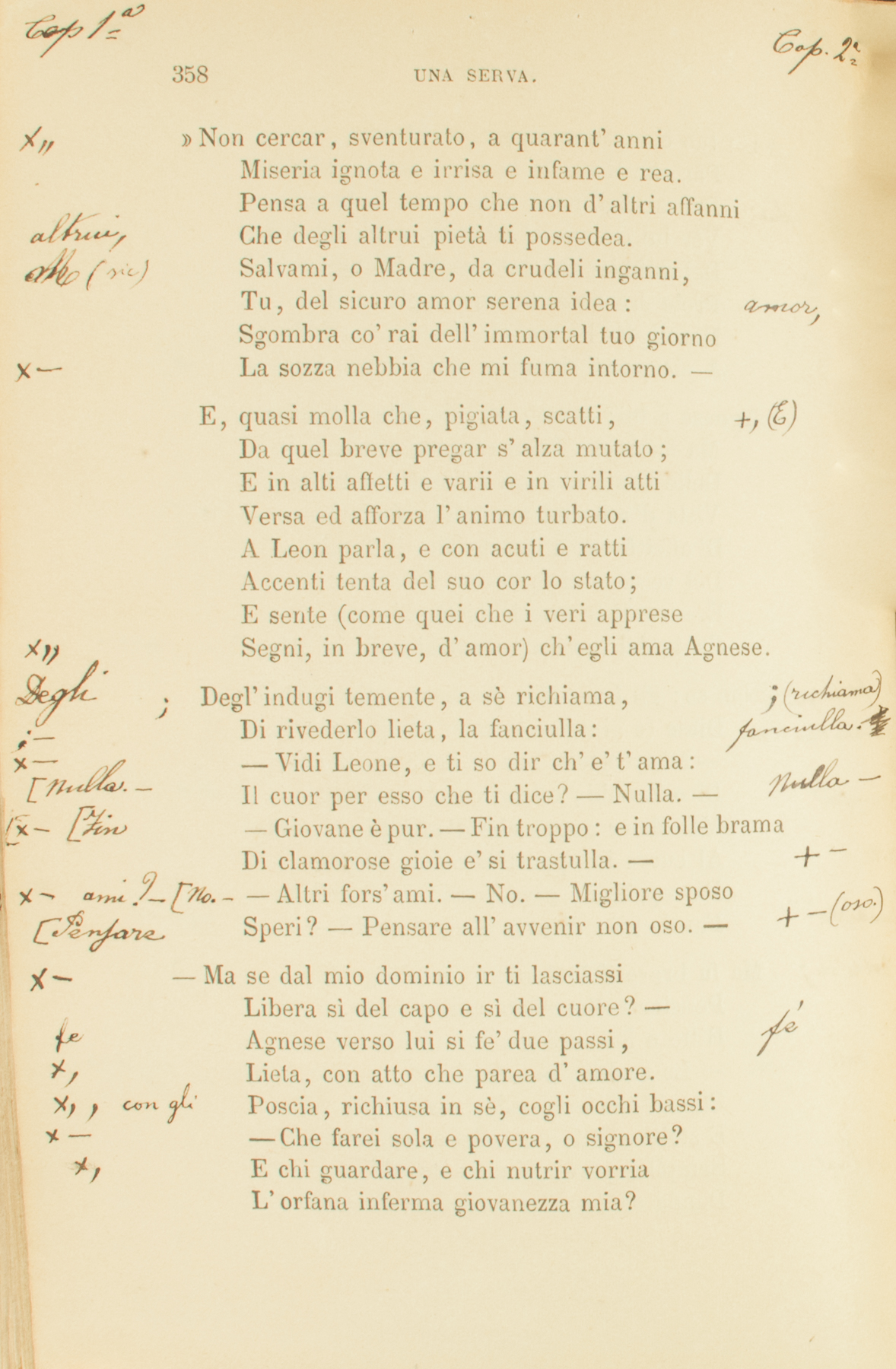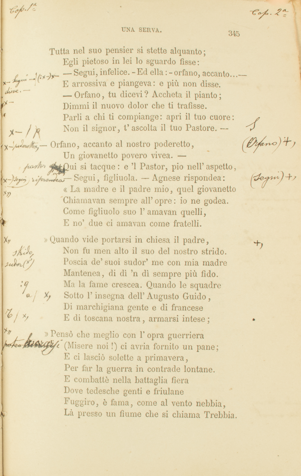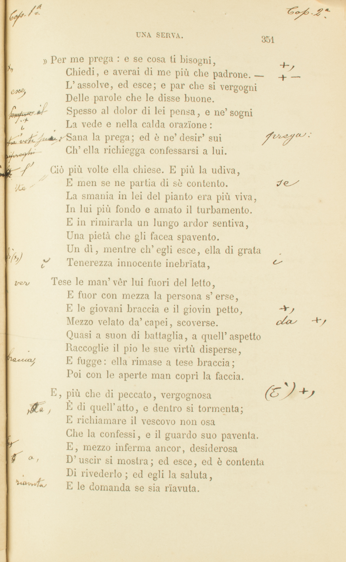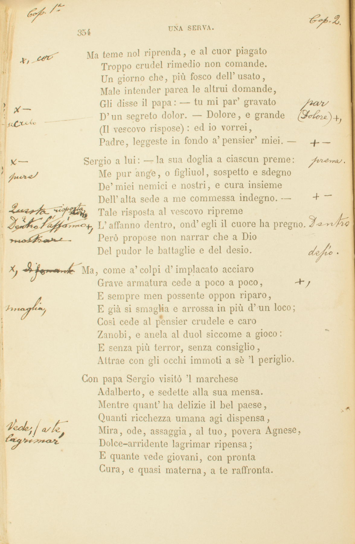 Verso il monte ascendean dalla pianuraChe lungo il tuo bel fiume, Arno, dechina.L’ombra involvea le falde, in sull’alturaL’ aure godean la luce mattutina.Or appariano ed or tra la verzuraSi nascondean, la salmodia divinaCantando a due a due la turba pia;E il vescovo Zanobi li seguia.Benedicean la terra, e buona annataChiedeva il pio colono al buon Signore.La primavera sorridea beata,E tutta la campagna era un amore;E, di pioggie recenti consolata,Si rinverdiva nell’amato umoreOgni ùmil fronda, ogni foglia novella,E dire un inno a Dio pareva anch’ella.Nel pensar che i figli vostriFieno, o Padre, liberati,Si sentîro i pensier’ nostriConsolati. Sulla lingua i lieti accentiAbbondâr dal cuore espressi.Fu il Signor, diran le genti,Grande in essi.Il Signor fu grande in noi:La letizia nostra è piena.Togli, o Padre, i cari tuoiDi catena.Il torrente innondatoreL’ire omai del flutto ha quete.L’uom che semina in dolore,Gioia miete.Mesti andavan seminandoLor sementa: ed or verranno,E, i manipoli portando,Gioiranno.Seguitavan chiamando in lor preghiera,Angeli, il vostro nome, e il tuo, Maria;E il Battista, pensosa anima austera,E tutti che sperâr certo il Messia;E gl’Innocenti, pargoletta schiera;E i Dodici da Pier fino a Mattia;E i Romiti, e i Dottor’ di sacre cose,E i Martiri, e le Donne affettuose.Alto levaiGli occhi, e pregai,A te che in cielDimore,Come famiglioTien fiso il ciglioAl suo fedelSignore.Come serventeGuarda umilmenteLa donna suaCh’ell’ama;Il nostro amoreGuarda, o Signore,La faccia tuaCon brama.Pietà, buon Dio,L’onta c’empioD’un duolo acerboA morte.D’onta e di penaNostr’alma è piena,Scherno al superboE al forte.Giungeano a passo lento in cima al colleOve mostra sue croci e biancheggianteLa cattedral di Fiesole s’estolleTra ’l verde lieto delle folte piante.Inginocchion sulle sudate zolleStavan di molte donne al tempio innante:E ve n’avea di condizion servile,Mancipii del palazzo vescovile.Una, che, nuda il piè, pallida il viso,Rossa i labbri, e del corpo estenuata,Gli occhi di mesta pace, e d’un sorrisoDi pazïente amor le labbra ornata,Con le man giunte, al ciel guardando fiso,Pregava basso con voce accorata,E, tra nero e sanguigno, avea suggello,Sovra le ciglia, di servil flagello,Al vescovo Zanobi diè negli occhi,Mentre la man tendea benedicente:Poi dentro in chiesa videla in ginocchi,Romita in sè, pregar ferventemente.Non può, vedendo, che pietà nol tocchi:Così, se in acqua od in vetro lucenteRaggio penètra, il suo baglior divide,E in modesti color’ vario sorride.Compiuto delle preci il ministero,Il vescovo Zanobi per lei manda.Nuovi dolor’ nel trepido pensieroVolge l’afflitta, e a Dio si raccomanda.Egli con volto tra mite ed austeroLa guarda appena, e, — chi se’ tu? —domanda.Dice la giovanetta: — i’ son lucchese,Senza padre nè madre; e ho nome Agnese. —— Forse di servo nata? — Oh no, signore:Ingenua, grazie a Dio, la stirpe mia.E mio padre era un povero aratoreDi campicel non suo, lungo la viaChe mette alla città. Quando il SignoreCi percosse dell’aspra carestia;E’ patì tanto, e sì le forze afflittePer campar noi logrò, che ne moritte. —Foglio aggiunto con postille, r.Foglio aggiunto con postille, v.Tutta nel suo pensier si stette alquanto;Egli pietoso in lei lo sguardo fisse:— Segui, infelice. - Ed ella: - orfano, accanto...—E arrossiva e piangeva: e più non disse.— Orfano, tu dicevi? Accheta il pianto;Dimmi il nuovo dolor che ti trafisse.Parli a chi ti compiange: apri il tuo cuore:Non il signor, t’ascolta il tuo Pastore. —— Orfano, accanto al nostro poderetto,Un giovanetto povero vivea. —Qui si tacque: e ’l Pastor, pio nell’aspetto,— Segui, figliuola. — Agnese rispondea:«La madre e il padre mio, quel giovanettoChiamavan sempre all’opre: io ne godea.Come figliuolo suo l’amavan quelli,E no’ due ci amavan come fratelli.Quando vide portarsi in chiesa il padre,Non fu men alto il suo del nostro strido.Poscia de’ suoi sudor’ me con mia madreMantenea, di dì ’n dì sempre più fido.Ma la fame crescea. Quando le squadreSotto l’insegna dell’Augusto Guido,Di marchigiana gente e di franceseE di toscana nostra, armarsi intese;Pensò che meglio con l’opra guerriera(Misere noi!) ci avria fornito un pane;E ci lasciò solette a primavera,Per far la guerra in contrade lontane.E combattè nella battaglia fieraDove tedesche genti e friulaneFuggiro, è fama, come al vento nebbia,Là presso un fiume che si chiama Trebbia.Quando si seppe noi della vittoria,Ah che gioioso dì, signor, fu quello!— Egli riviene a noi, nè senza gloria:Lo rivedrem — dicevo — il mio fratello. —I’ vidi ritornar (fiera memoria!)Ricchi di preda que’ del suo drappello,Empiendo i campi e il ciel di lieti gridiChe mi ferìano il cor: ma lui non vidi.Seppi che, nel fervor della battaglia,Toccata il prode non avea ferita:Ma tra’ fuggenti, misero! si scaglia,E, stretto in mezzo a lor, perdè la vita.A noi due poverette, orbe in gramaglia,La gente, a’ mali nostri impietosita,Povera anch’essa, alcun soccorso dava;Ma la fame crudel continuava.E mia madre.... Or non più. Che importa a voiDi me meschina e della mia sventura? —— Segui, diss’egli, e narra i dolor’ tuoi.Anche in me le sue piaghe aprì natura. —Tacque ella un poco, lagrimando; e poi:— Dal tapinar della sua crëatura,Più che dal suo, mia madre consumata,Dopo molto languir cadde malata.Per procacciarle un po’ di pane asciutto,Sola nel letto lasciarla i’ dovea.Ella metteasi inginocchioni, e tuttoQuel tempo lo pregava e lo piangea.Queste parole: benedetto il fruttoDelle viscere tue, sempre dicea:Ora, o Madre di Dio, per noi meschineAdesso e all’ora della nostra fine.Foglio aggiunto con postille, r.Foglio aggiunto con postille, v.Foglio aggiunto con postille, r.Foglio aggiunto con postille, v.Una mattina i’ esco, in sulla viaMi metto, e tutto il santo giorno attendoChi un poco di pan per lei mi dia;Torno la sera