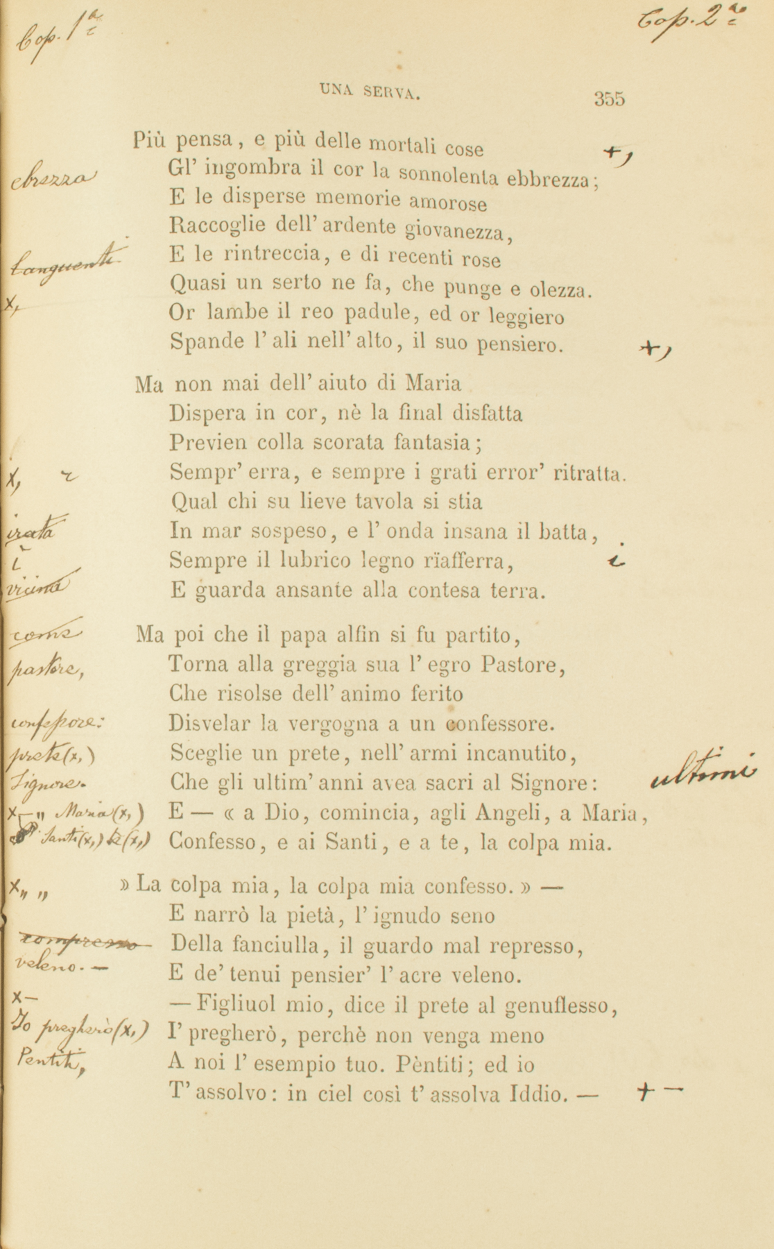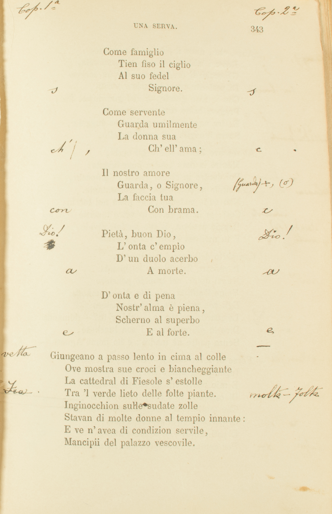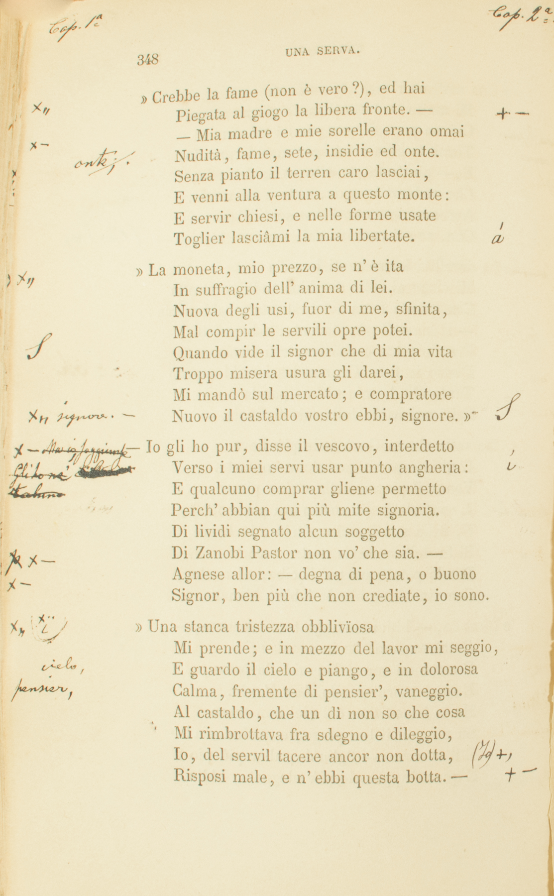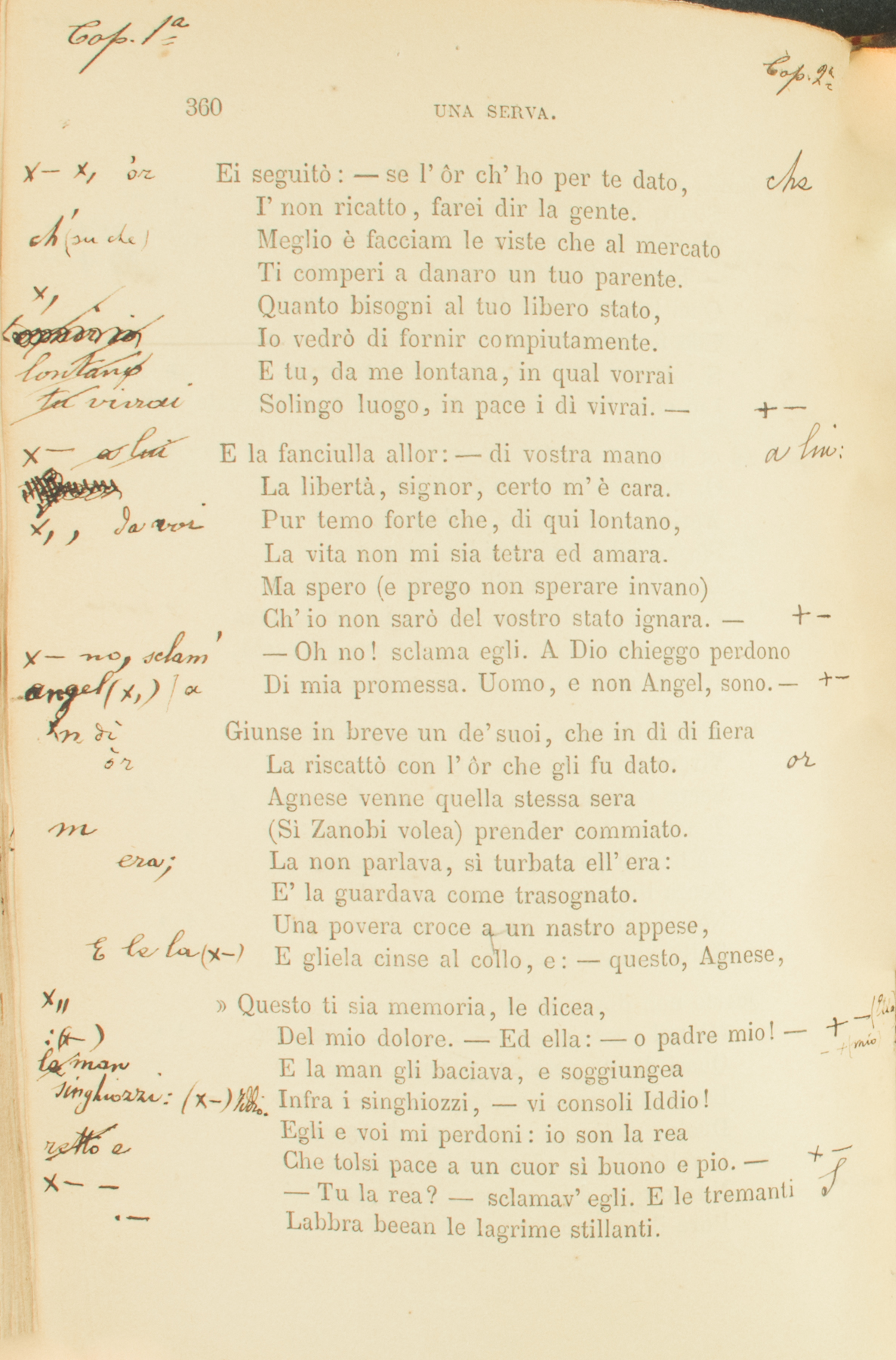 Verso il monte ascendean dalla pianuraChe lungo il tuo bel fiume, Arno, dechina.L’ombra involvea le falde, in sull’alturaL’ aure godean la luce mattutina.Or appariano ed or tra la verzuraSi nascondean, la salmodia divinaCantando a due a due la turba pia;E il vescovo Zanobi li seguia.Benedicean la terra, e buona annataChiedeva il pio colono al buon Signore.La primavera sorridea beata,E tutta la campagna era un amore;E, di pioggie recenti consolata,Si rinverdiva nell’amato umoreOgni ùmil fronda, ogni foglia novella,E dire un inno a Dio pareva anch’ella.Nel pensar che i figli vostriFieno, o Padre, liberati,Si sentîro i pensier’ nostriConsolati. Sulla lingua i lieti accentiAbbondâr dal cuore espressi.Fu il Signor, diran le genti,Grande in essi.Il Signor fu grande in noi:La letizia nostra è piena.Togli, o Padre, i cari tuoiDi catena.Il torrente innondatoreL’ire omai del flutto ha quete.L’uom che semina in dolore,Gioia miete.Mesti andavan seminandoLor sementa: ed or verranno,E, i manipoli portando,Gioiranno.Seguitavan chiamando in lor preghiera,Angeli, il vostro nome, e il tuo, Maria;E il Battista, pensosa anima austera,E tutti che sperâr certo il Messia;E gl’Innocenti, pargoletta schiera;E i Dodici da Pier fino a Mattia;E i Romiti, e i Dottor’ di sacre cose,E i Martiri, e le Donne affettuose.Alto levaiGli occhi, e pregai,A te che in cielDimore,Come famiglioTien fiso il ciglioAl suo fedelSignore.Come serventeGuarda umilmenteLa donna suaCh’ell’ama;Il nostro amoreGuarda, o Signore,La faccia tuaCon brama.Pietà, buon Dio,L’onta c’empioD’un duolo acerboA morte.D’onta e di penaNostr’alma è piena,Scherno al superboE al forte.Giungeano a passo lento in cima al colleOve mostra sue croci e biancheggianteLa cattedral di Fiesole s’estolleTra ’l verde lieto delle folte piante.Inginocchion sulle sudate zolleStavan di molte donne al tempio innante:E ve n’avea di condizion servile,Mancipii del palazzo vescovile.Una, che, nuda il piè, pallida il viso,Rossa i labbri, e del corpo estenuata,Gli occhi di mesta pace, e d’un sorrisoDi pazïente amor le labbra ornata,Con le man giunte, al ciel guardando fiso,Pregava basso con voce accorata,E, tra nero e sanguigno, avea suggello,Sovra le ciglia, di servil flagello,Al vescovo Zanobi diè negli occhi,Mentre la man tendea benedicente:Poi dentro in chiesa videla in ginocchi,Romita in sè, pregar ferventemente.Non può, vedendo, che pietà nol tocchi:Così, se in acqua od in vetro lucenteRaggio penètra, il suo baglior divide,E in modesti color’ vario sorride.Compiuto delle preci il ministero,Il vescovo Zanobi per lei manda.Nuovi dolor’ nel trepido pensieroVolge l’afflitta, e a Dio si raccomanda.Egli con volto tra mite ed austeroLa guarda appena, e, — chi se’ tu? —domanda.Dice la giovanetta: — i’ son lucchese,Senza padre nè madre; e ho nome Agnese. —— Forse di servo nata? — Oh no, signore:Ingenua, grazie a Dio, la stirpe mia.E mio padre era un povero aratoreDi campicel non suo, lungo la viaChe mette alla città. Quando il SignoreCi percosse dell’aspra carestia;E’ patì tanto, e sì le forze afflittePer campar noi logrò, che ne moritte. —Foglio aggiunto con postille, r.Foglio aggiunto con postille, v.Tutta nel suo pensier si stette alquanto;Egli pietoso in lei lo sguardo fisse:— Segui, infelice. - Ed ella: - orfano, accanto...—E arrossiva e piangeva: e più non disse.— Orfano, tu dicevi? Accheta il pianto;Dimmi il nuovo dolor che ti trafisse.Parli a chi ti compiange: apri il tuo cuore:Non il signor, t’ascolta il tuo Pastore. —— Orfano, accanto al nostro poderetto,Un giovanetto povero vivea. —Qui si tacque: e ’l Pastor, pio nell’aspetto,— Segui, figliuola. — Agnese rispondea:«La madre e il padre mio, quel giovanettoChiamavan sempre all’opre: io ne godea.Come figliuolo suo l’amavan quelli,E no’ due ci amavan come fratelli.Quando vide portarsi in chiesa il padre,Non fu men alto il suo del nostro strido.Poscia de’ suoi sudor’ me con mia madreMantenea, di dì ’n dì sempre più fido.Ma la fame crescea. Quando le squadreSotto l’insegna dell’Augusto Guido,Di marchigiana gente e di franceseE di toscana nostra, armarsi intese;Pensò che meglio con l’opra guerriera(Misere noi!) ci avria fornito un pane;E ci lasciò solette a primavera,Per far la guerra in contrade lontane.E combattè nella battaglia fieraDove tedesche genti e friulaneFuggiro, è fama, come al vento nebbia,Là presso un fiume che si chiama Trebbia.Quando si seppe noi della vittoria,Ah che gioioso dì, signor, fu quello!— Egli riviene a noi, nè senza gloria:Lo rivedrem — dicevo — il mio fratello. —I’ vidi ritornar (fiera memoria!)Ricchi di preda que’ del suo drappello,Empiendo i campi e il ciel di lieti gridiChe mi ferìano il cor: ma lui non vidi.Seppi che, nel fervor della battaglia,Toccata il prode non avea ferita:Ma tra’ fuggenti, misero! si scaglia,E, stretto in mezzo a lor, perdè la vita.A noi due poverette, orbe in gramaglia,La gente, a’ mali nostri impietosita,Povera anch’essa, alcun soccorso dava;Ma la fame crudel continuava.E mia madre.... Or non più. Che importa a voiDi me meschina e della mia sventura? —— Segui, diss’egli, e narra i dolor’ tuoi.Anche in me le sue piaghe aprì natura. —Tacque ella un poco, lagrimando; e poi:— Dal tapinar della sua crëatura,Più che dal suo, mia madre consumata,Dopo molto languir cadde malata.Per procacciarle un po’ di pane asciutto,Sola nel letto lasciarla i’ dovea.Ella metteasi inginocchioni, e tuttoQuel tempo lo pregava e lo piangea.Queste parole: benedetto il fruttoDelle viscere tue, sempre dicea:Ora, o Madre di Dio, per noi meschineAdesso e all’ora della nostra fine.Foglio aggiunto con postille, r.Foglio aggiunto con postille, v.Foglio aggiunto con postille, r.Foglio aggiunto con postille, v.Una mattina i’ esco, in sulla viaMi metto, e tutto il santo giorno attendoChi un poco di pan per lei mi dia;Torno la sera