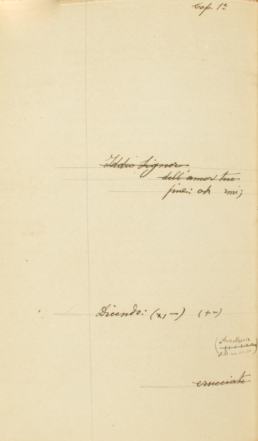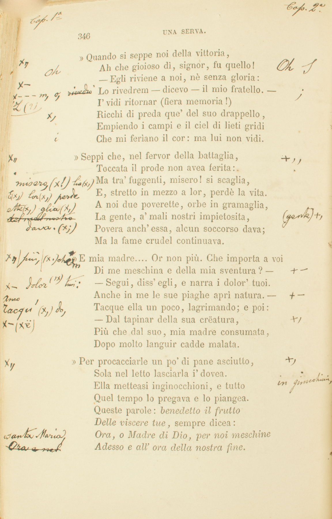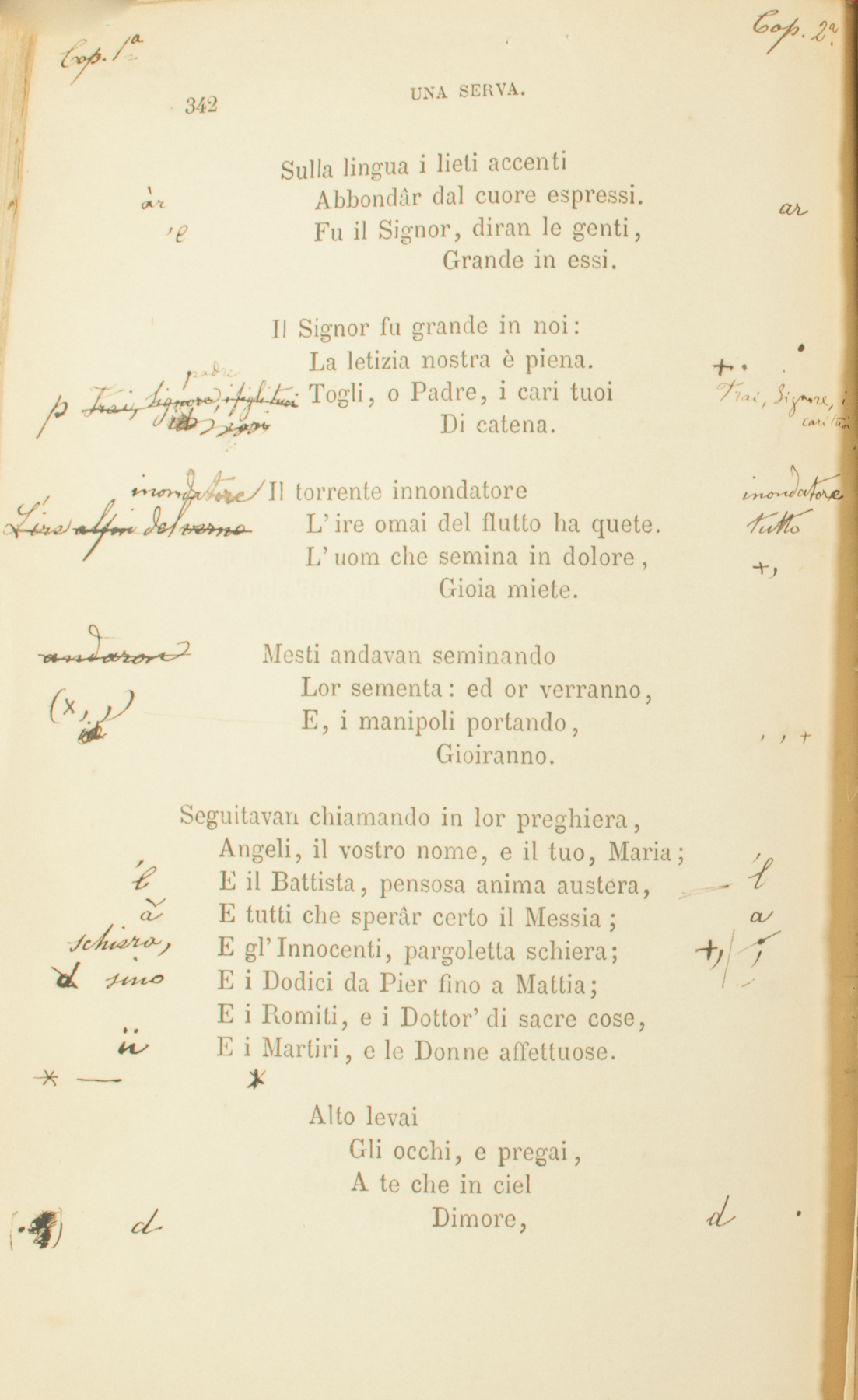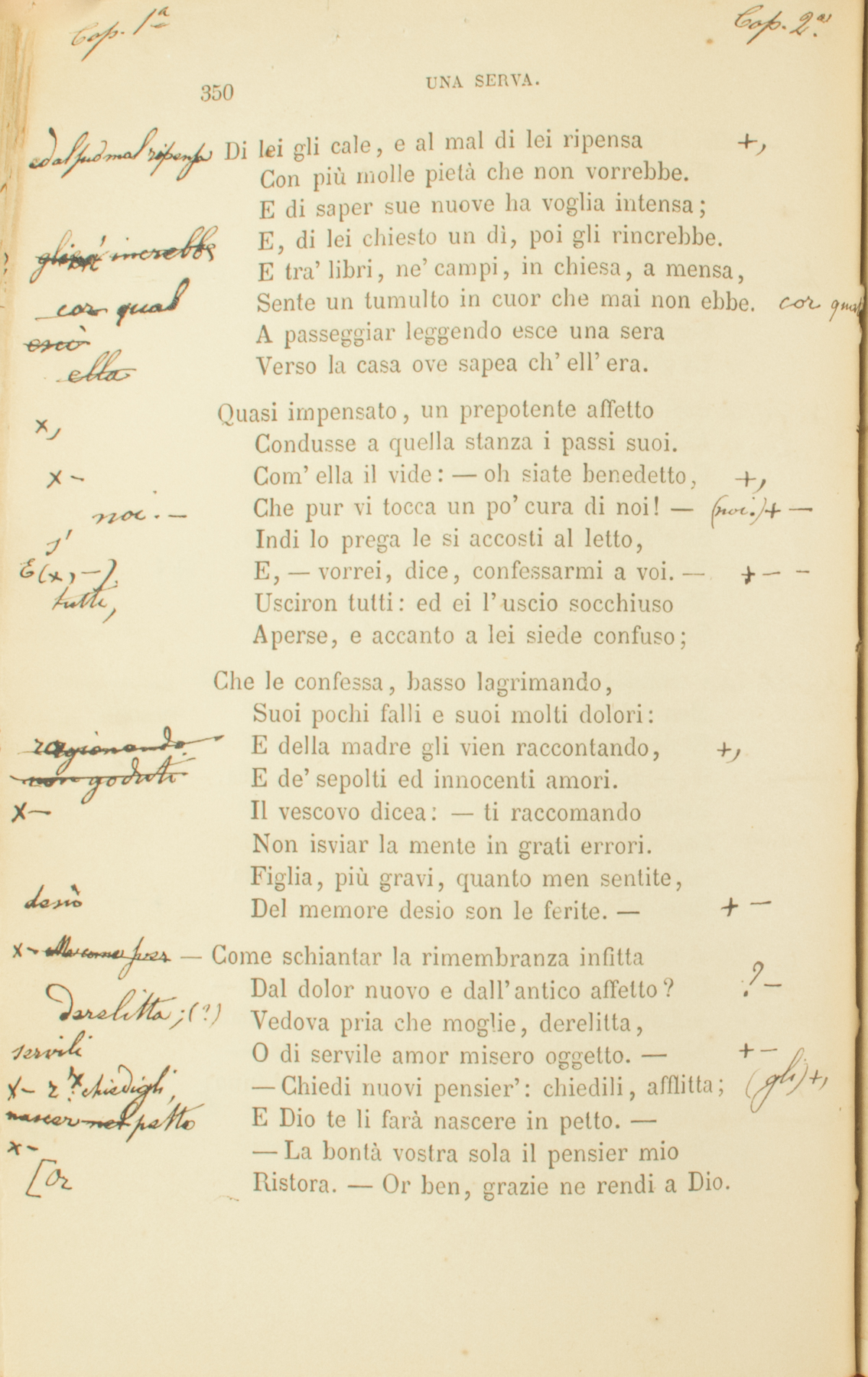 Verso il monte ascendean dalla pianuraChe lungo il tuo bel fiume, Arno, dechina.L’ombra involvea le falde, in sull’alturaL’ aure godean la luce mattutina.Or appariano ed or tra la verzuraSi nascondean, la salmodia divinaCantando a due a due la turba pia;E il vescovo Zanobi li seguia.Benedicean la terra, e buona annataChiedeva il pio colono al buon Signore.La primavera sorridea beata,E tutta la campagna era un amore;E, di pioggie recenti consolata,Si rinverdiva nell’amato umoreOgni ùmil fronda, ogni foglia novella,E dire un inno a Dio pareva anch’ella.Nel pensar che i figli vostriFieno, o Padre, liberati,Si sentîro i pensier’ nostriConsolati. Sulla lingua i lieti accentiAbbondâr dal cuore espressi.Fu il Signor, diran le genti,Grande in essi.Il Signor fu grande in noi:La letizia nostra è piena.Togli, o Padre, i cari tuoiDi catena.Il torrente innondatoreL’ire omai del flutto ha quete.L’uom che semina in dolore,Gioia miete.Mesti andavan seminandoLor sementa: ed or verranno,E, i manipoli portando,Gioiranno.Seguitavan chiamando in lor preghiera,Angeli, il vostro nome, e il tuo, Maria;E il Battista, pensosa anima austera,E tutti che sperâr certo il Messia;E gl’Innocenti, pargoletta schiera;E i Dodici da Pier fino a Mattia;E i Romiti, e i Dottor’ di sacre cose,E i Martiri, e le Donne affettuose.Alto levaiGli occhi, e pregai,A te che in cielDimore,Come famiglioTien fiso il ciglioAl suo fedelSignore.Come serventeGuarda umilmenteLa donna suaCh’ell’ama;Il nostro amoreGuarda, o Signore,La faccia tuaCon brama.Pietà, buon Dio,L’onta c’empioD’un duolo acerboA morte.D’onta e di penaNostr’alma è piena,Scherno al superboE al forte.Giungeano a passo lento in cima al colleOve mostra sue croci e biancheggianteLa cattedral di Fiesole s’estolleTra ’l verde lieto delle folte piante.Inginocchion sulle sudate zolleStavan di molte donne al tempio innante:E ve n’avea di condizion servile,Mancipii del palazzo vescovile.Una, che, nuda il piè, pallida il viso,Rossa i labbri, e del corpo estenuata,Gli occhi di mesta pace, e d’un sorrisoDi pazïente amor le labbra ornata,Con le man giunte, al ciel guardando fiso,Pregava basso con voce accorata,E, tra nero e sanguigno, avea suggello,Sovra le ciglia, di servil flagello,Al vescovo Zanobi diè negli occhi,Mentre la man tendea benedicente:Poi dentro in chiesa videla in ginocchi,Romita in sè, pregar ferventemente.Non può, vedendo, che pietà nol tocchi:Così, se in acqua od in vetro lucenteRaggio penètra, il suo baglior divide,E in modesti color’ vario sorride.Compiuto delle preci il ministero,Il vescovo Zanobi per lei manda.Nuovi dolor’ nel trepido pensieroVolge l’afflitta, e a Dio si raccomanda.Egli con volto tra mite ed austeroLa guarda appena, e, — chi se’ tu? —domanda.Dice la giovanetta: — i’ son lucchese,Senza padre nè madre; e ho nome Agnese. —— Forse di servo nata? — Oh no, signore:Ingenua, grazie a Dio, la stirpe mia.E mio padre era un povero aratoreDi campicel non suo, lungo la viaChe mette alla città. Quando il SignoreCi percosse dell’aspra carestia;E’ patì tanto, e sì le forze afflittePer campar noi logrò, che ne moritte. —Foglio aggiunto con postille, r.Foglio aggiunto con postille, v.Tutta nel suo pensier si stette alquanto;Egli pietoso in lei lo sguardo fisse:— Segui, infelice. - Ed ella: - orfano, accanto...—E arrossiva e piangeva: e più non disse.— Orfano, tu dicevi? Accheta il pianto;Dimmi il nuovo dolor che ti trafisse.Parli a chi ti compiange: apri il tuo cuore:Non il signor, t’ascolta il tuo Pastore. —— Orfano, accanto al nostro poderetto,Un giovanetto povero vivea. —Qui si tacque: e ’l Pastor, pio nell’aspetto,— Segui, figliuola. — Agnese rispondea:«La madre e il padre mio, quel giovanettoChiamavan sempre all’opre: io ne godea.Come figliuolo suo l’amavan quelli,E no’ due ci amavan come fratelli.Quando vide portarsi in chiesa il padre,Non fu men alto il suo del nostro strido.Poscia de’ suoi sudor’ me con mia madreMantenea, di dì ’n dì sempre più fido.Ma la fame crescea. Quando le squadreSotto l’insegna dell’Augusto Guido,Di marchigiana gente e di franceseE di toscana nostra, armarsi intese;Pensò che meglio con l’opra guerriera(Misere noi!) ci avria fornito un pane;E ci lasciò solette a primavera,Per far la guerra in contrade lontane.E combattè nella battaglia fieraDove tedesche genti e friulaneFuggiro, è fama, come al vento nebbia,Là presso un fiume che si chiama Trebbia.Quando si seppe noi della vittoria,Ah che gioioso dì, signor, fu quello!— Egli riviene a noi, nè senza gloria:Lo rivedrem — dicevo — il mio fratello. —I’ vidi ritornar (fiera memoria!)Ricchi di preda que’ del suo drappello,Empiendo i campi e il ciel di lieti gridiChe mi ferìano il cor: ma lui non vidi.Seppi che, nel fervor della battaglia,Toccata il prode non avea ferita:Ma tra’ fuggenti, misero! si scaglia,E, stretto in mezzo a lor, perdè la vita.A noi due poverette, orbe in gramaglia,La gente, a’ mali nostri impietosita,Povera anch’essa, alcun soccorso dava;Ma la fame crudel continuava.E mia madre.... Or non più. Che importa a voiDi me meschina e della mia sventura? —— Segui, diss’egli, e narra i dolor’ tuoi.Anche in me le sue piaghe aprì natura. —Tacque ella un poco, lagrimando; e poi:— Dal tapinar della sua crëatura,Più che dal suo, mia madre consumata,Dopo molto languir cadde malata.Per procacciarle un po’ di pane asciutto,Sola nel letto lasciarla i’ dovea.Ella metteasi inginocchioni, e tuttoQuel tempo lo pregava e lo piangea.Queste parole: benedetto il fruttoDelle viscere tue, sempre dicea:Ora, o Madre di Dio, per noi meschineAdesso e all’ora della nostra fine.Foglio aggiunto con postille, r.Foglio aggiunto con postille, v.Foglio aggiunto con postille, r.Foglio aggiunto con postille, v.Una mattina i’ esco, in sulla viaMi metto, e tutto il santo giorno attendoChi un poco di pan per lei mi dia;Torno la sera