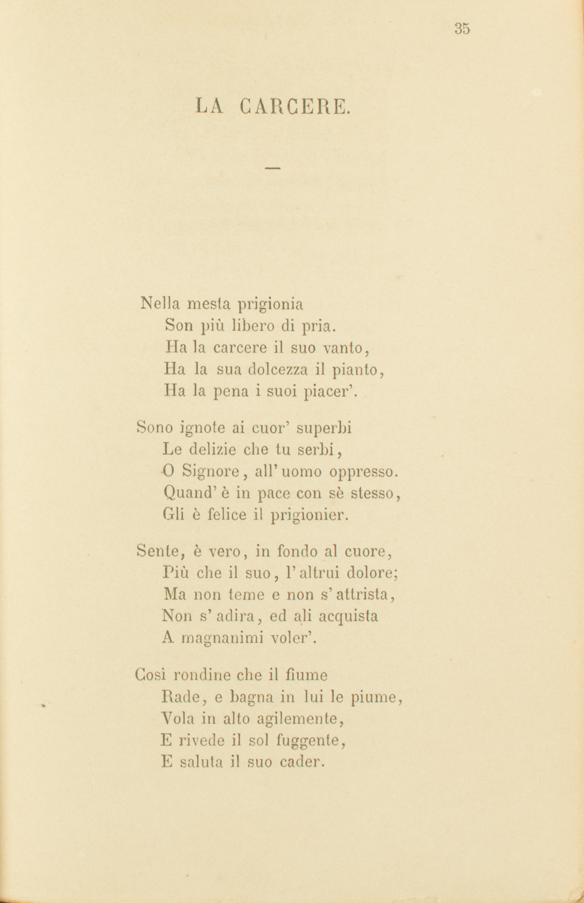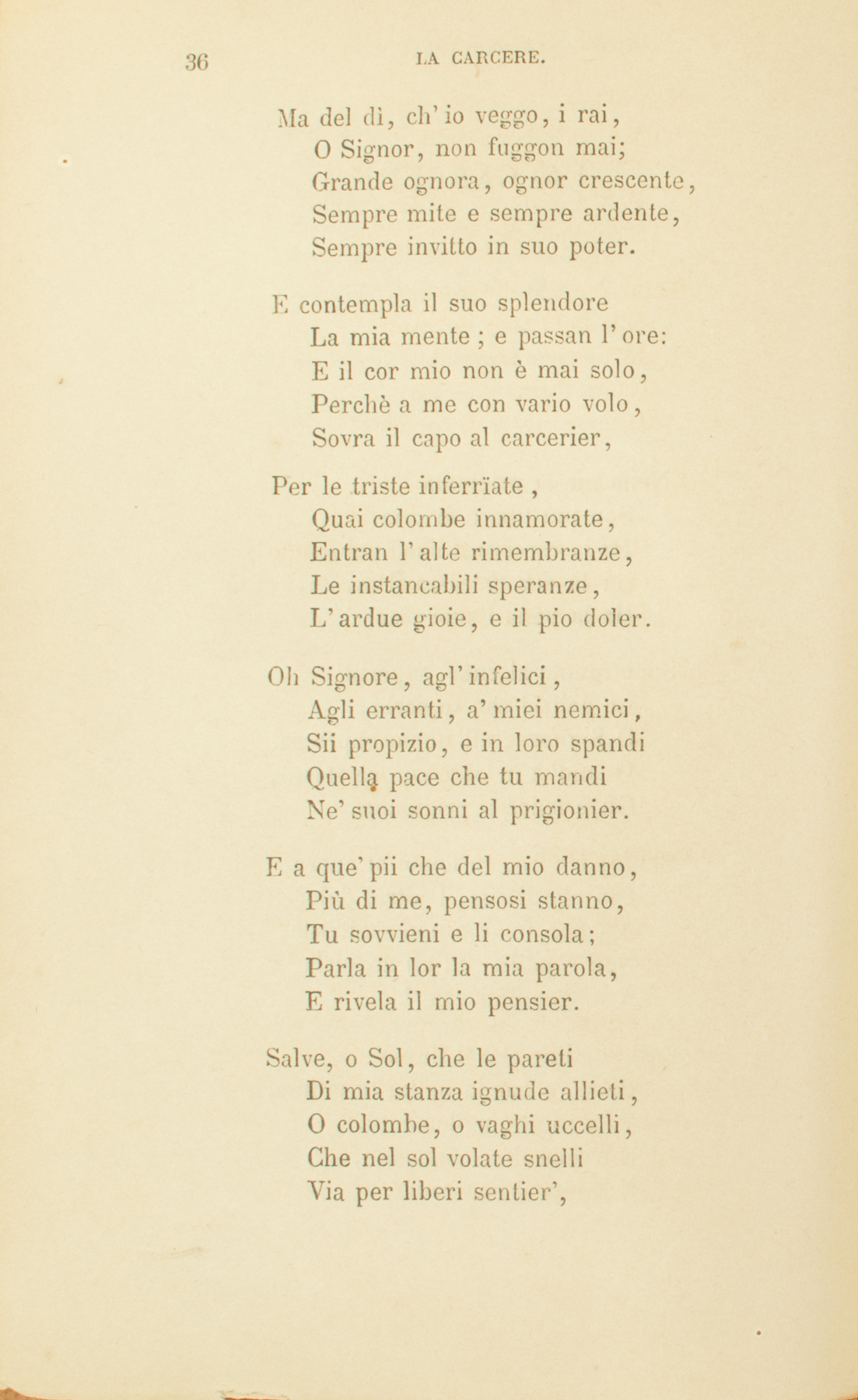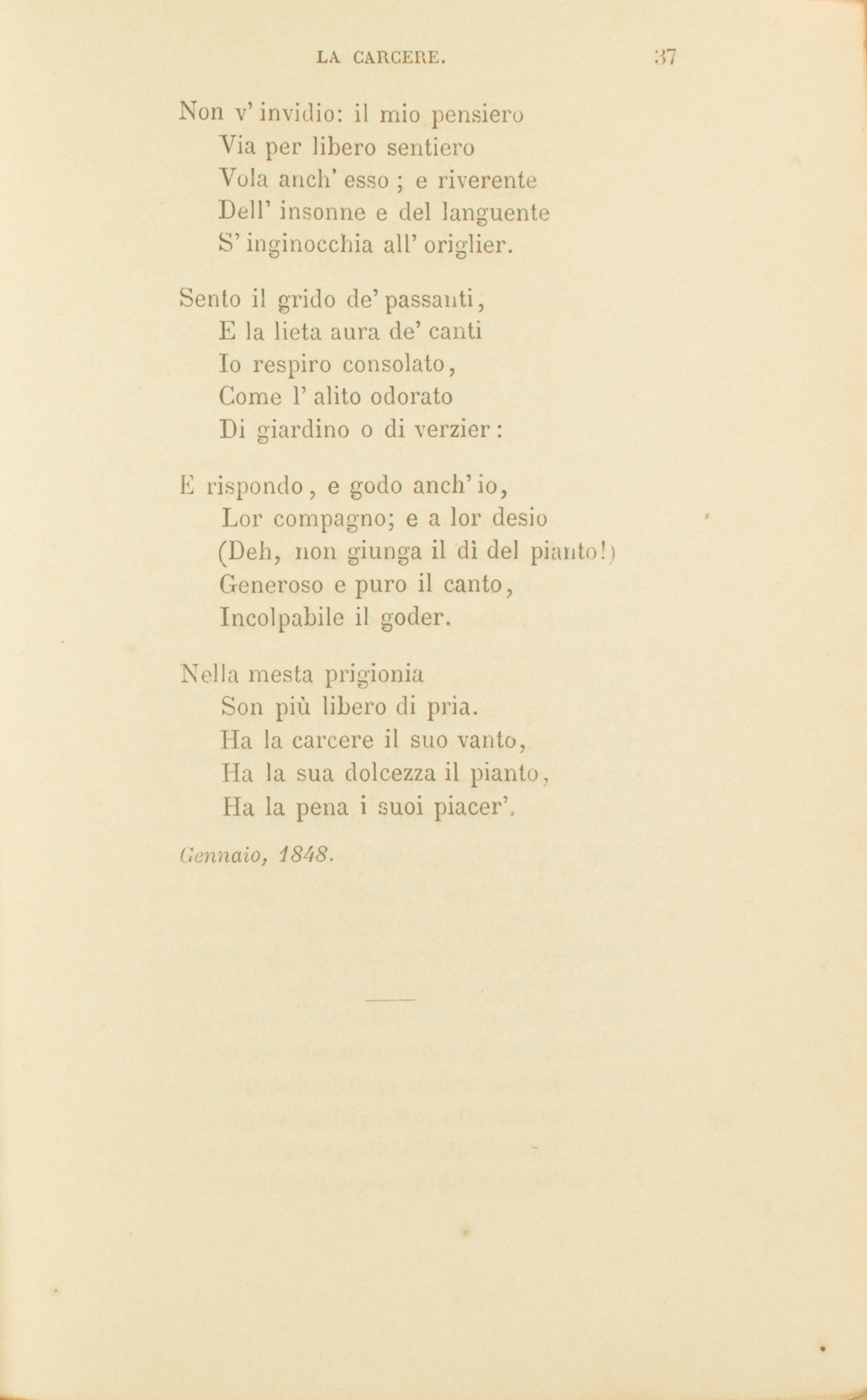 Nella mesta prigioniaSon più libero di pria.Ha la carcere il suo vanto,Ha la sua dolcezza il pianto,Ha la pena i suoi piacer’.Sono ignote ai cuor’ superbiLe delizie che tu serbi,O Signore, all’uomo oppresso.Quand’è in pace con sè stesso,Gli è felice il prigionier.Sente, è vero, in fondo al cuore,Più che il suo, l’altrui dolore;Ma non teme e non s’attrista,Non s’adira, ed ali acquistaA magnanimi voler’.Così rondine che il fiumeRade, e bagna in lui le piume,Vola in alto agilemente,E rivede il sol fuggente,E saluta il suo cader.Ma del dì, ch’io veggo, i rai,O Signor, non fuggon mai;Grande ognora, ognor crescente,Sempre mite e sempre ardente,Sempre invitto in suo poter.E contempla il suo splendoreLa mia mente; e passan l’ore:E il cor mio non è mai solo,Perchè a me con vario volo,Sovra il capo al carcerier,Per le triste inferrïate,Quai colombe innamorate,Entran l’alte rimembranze,Le instancabili speranze,L’ardue gioie, e il pio doler.Oh Signore, agl’infelici,Agli erranti, a’ miei nemici,Sii propizio, e in loro spandiQuella pace che tu mandiNe’ suoi sonni al prigionier.E a que’ pii che del mio danno,Più di me, pensosi stanno,Tu sovvieni e li consola;Parla in lor la mia parola,E rivela il mio pensier.Salve, o Sol, che le paretiDi mia stanza ignude allieti,O colombe, o vaghi uccelli,Che nel sol volate snelliVia per liberi sentier’,Non v’invidio: il mio pensieroVia per libero sentieroVola anch’esso; e riverenteDell’insonne e del languenteS’inginocchia all’origlier.Sento il grido de’ passanti,E la lieta aura de’ cantiIo respiro consolato,Come l’alito odoratoDi giardino o di verzier:E rispondo, e godo anch’io,Lor compagno; e a lor desio(Deh, non giunga il dì del pianto!)Generoso e puro il canto,Incolpabile il goder.Nella mesta prigioniaSon più libero di pria.Ha la carcere il suo vanto,Ha la sua dolcezza il pianto,Ha la pena i suoi piacer’.Gennaio, 1848.