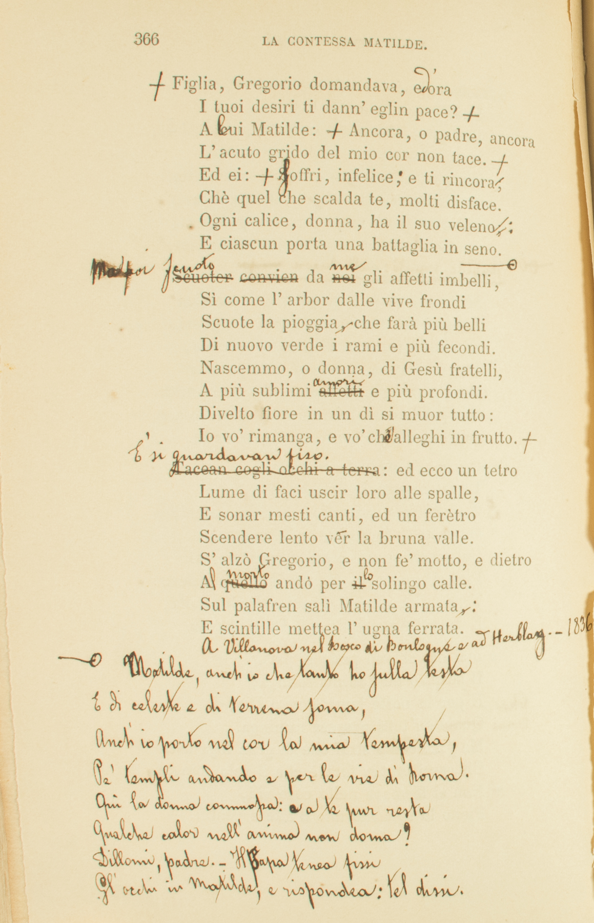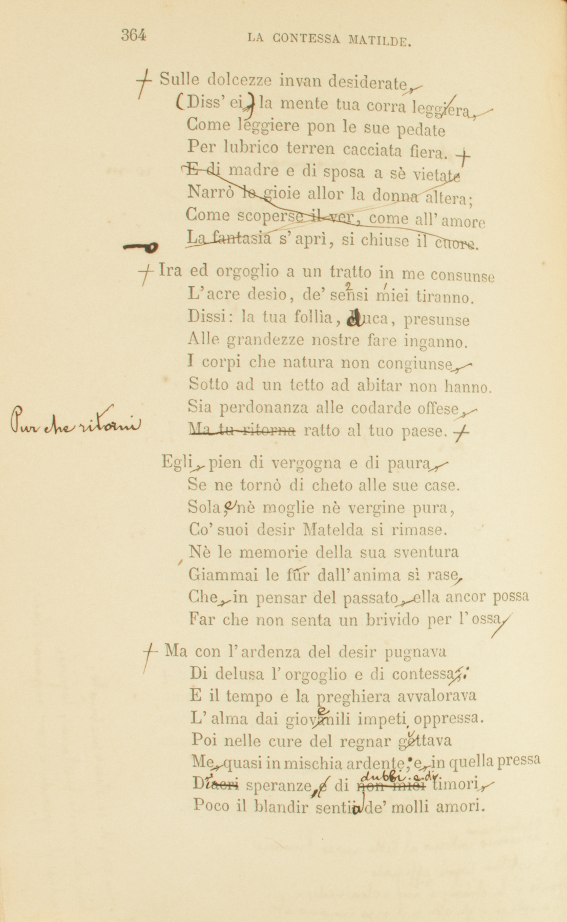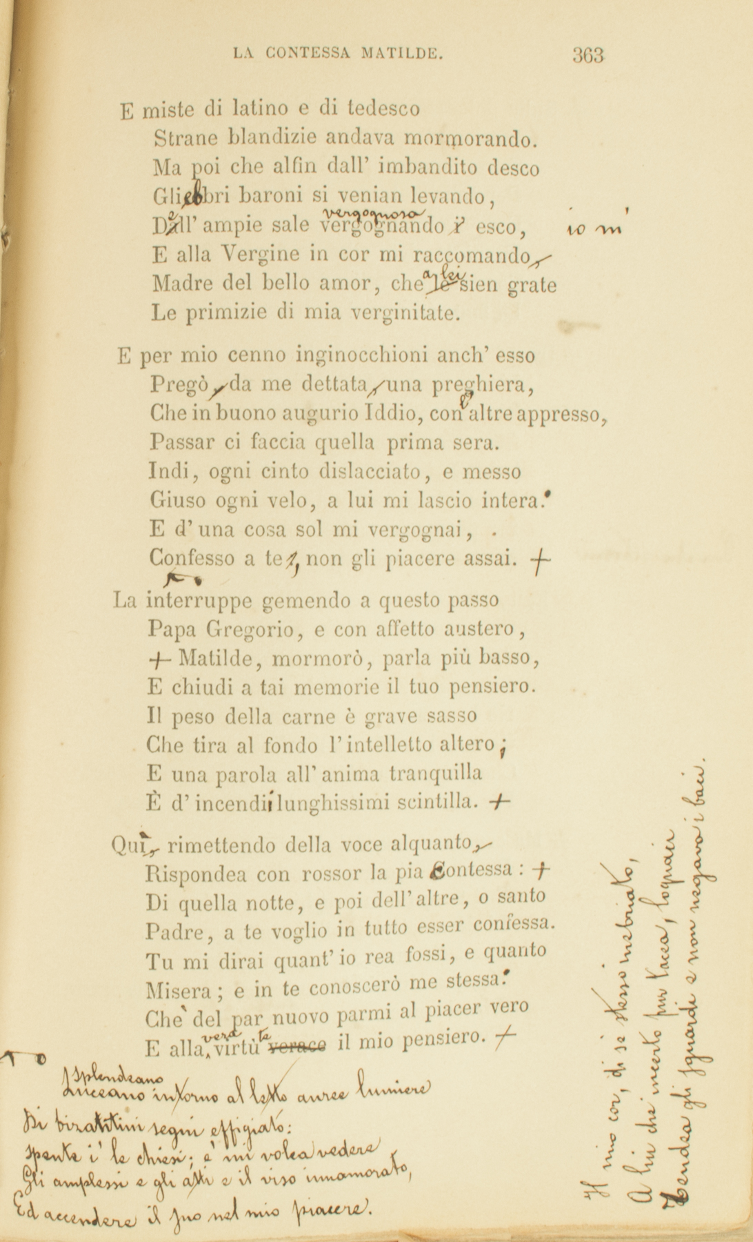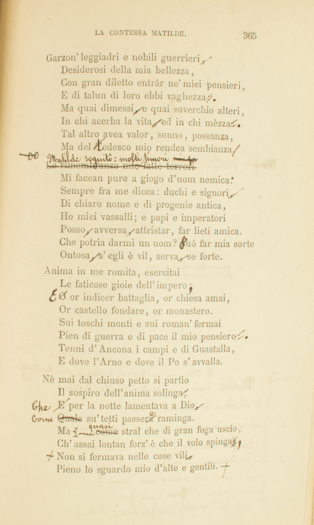Garzon’ leggiadri e nobili guerrieri,Desiderosi della mia bellezza,Con gran diletto entrâr ne’ miei pensieri,E di talun di loro ebbi vaghezza:Ma quai dimessi, e quai soverchio alteri,In chi acerba la vita, ed in chi mèzza:Tal altro avea valor, senno, possanza,Ma del Tedesco mio rendea sembianza.Le rimembranze mie fatte terroriMi facean pure a giogo d’uom nemica.Sempre fra me dicea: duchi e signori,Di chiaro nome e di progenie antica,Ho miei vassalli; e papi e imperatoriPosso, avversa, attristar, far lieti amica.Che potrìa darmi un uom? può far mia sorteOntosa, s’egli è vil, serva, se forte.Anima in me romita, esercitaiLe faticose gioie dell’impero:O or indicer battaglia, or chiesa amai,Or castello fondare, or monastero.Sui toschi monti e sui roman’ fermaiPien di guerra e di pace il mio pensiero:Tenni d’Ancona i campi e di Guastalla,E dove l’Arno e dove il Po s’avvalla.Nè mai dal chiuso petto si partìoIl sospiro dell’anima solinga;E per la notte lamentava a Dio,Quale su’ tetti passera raminga.Ma (....come stral che di gran foga uscìo,Ch’assai lontan forz’è che il volo spinga)Non si fermava nelle cose vili,Pieno lo sguardo mio d’alte e gentili. —— Figlia, Gregorio domandava, e oraI tuoi desiri ti dann’eglin pace? —A cui Matilde: — Ancora, o padre, ancoraL’acuto grido del mio cor non tace. —Ed ei: — Soffri, infelice, e ti rincora;Chè quel che scalda te, molti disface.Ogni calice, donna, ha il suo veleno;E ciascun porta una battaglia in seno.Scuoter convien da noi gli affetti imbelli,Sì come l’arbor dalle vive frondiScuote la pioggia, che farà più belliDi nuovo verde i rami e più fecondi.Nascemmo, o donna, di Gesù fratelli,A più sublimi affetti e più profondi.Divelto fiore in un dì si muor tutto:Io vo’ rimanga, e vo’ ch’alleghi in frutto. —Tacean cogli occhi a terra: ed ecco un tetroLume di faci uscir loro alle spalle,E sonar mesti canti, ed un ferètroScendere lento vêr la bruna valle.S’alzò Gregorio, e non fe’ motto, e dietroA quello andò per il solingo calle.Sul palafren salì Matilde armata,E scintille mettea l’ugna ferrata.