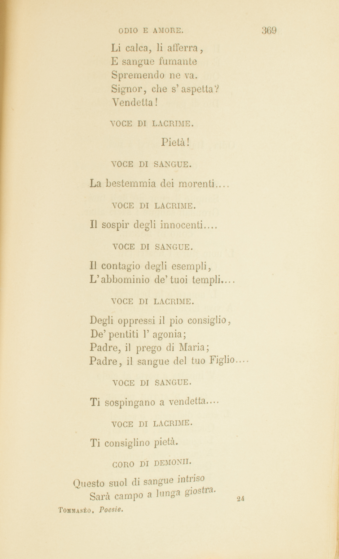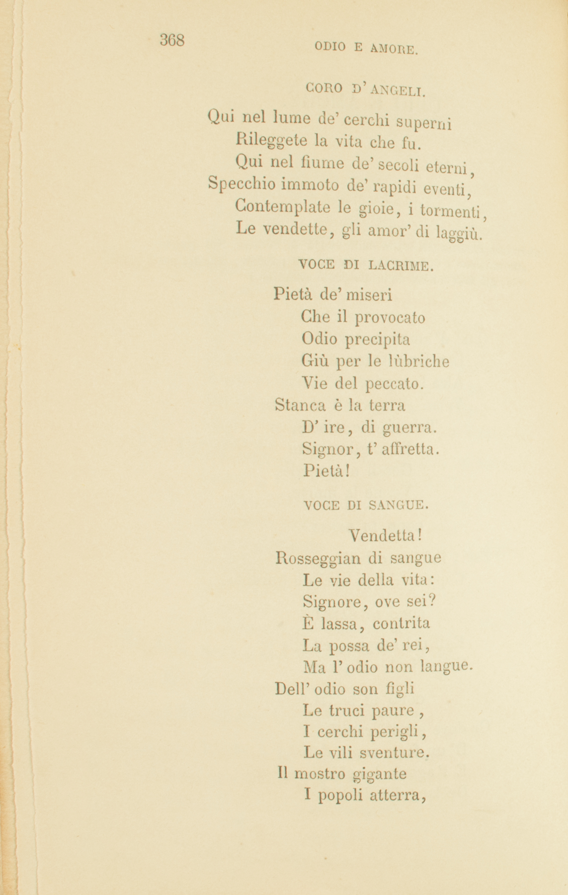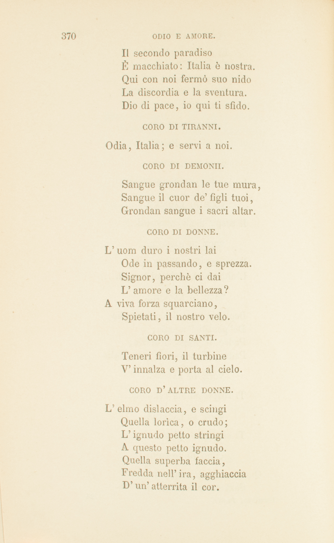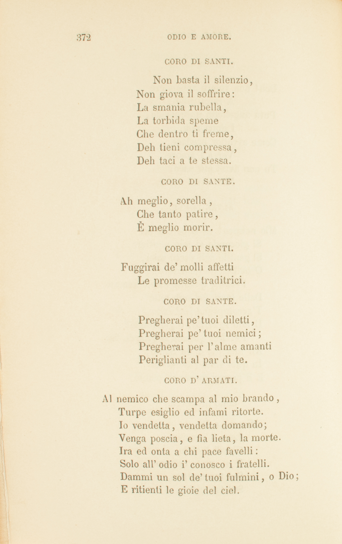 Qual d’amorosa vergineCon lieve mano il veloAlza la madre, e liberiVolan gli sguardi al cielo;Tale ai due miseri,Di miglior sorteGentil messaggio,Venne la morte.CORO DI SANTI.Esci, infelice e bellaCoppia: il tuo laccio è infranto.CORO DI SANTE.Egli nel sangue, ed ellaGià si lavò nel pianto.CORO DI SANTI.Or dove sono i rapidiD’un forte amor deliri,E l’agonia lunghissimaDe’ languidi desiri?CORO D’ANGELI.Qui nel lume de’ cerchi superniRileggete la vita che fu.Qui nel fiume de’ secoli eterni,Specchio immoto de’ rapidi eventi,Contemplate le gioie, i tormenti,Le vendette, gli amor’ di laggiù.VOCE DI LACRIME.Pietà de’ miseriChe il provocatoOdio precipitaGiù per le lùbricheVie del peccato.Stanca è la terraD’ire, di guerra.Signor, t’affretta.Pietà!VOCE DI SANGUE.Vendetta!Rosseggian di sangueLe vie della vita:Signore, ove sei?È lassa, contritaLa possa de’ rei,Ma l’odio non langue.Dell’odio son figliLe truci paure,I cerchi perigli,Le vili sventure.Il mostro giganteI popoli atterra,Li calca, li afferra,E sangue fumanteSpremendo ne va.Signor, che s’aspetta?Vendetta!VOCE DI LACRIME.Pietà!VOCE DI SANGUE.La bestemmia dei morenti....VOCE DI LACRIME.Il sospir degli innocenti....VOCE DI SANGUE.Il contagio degli esempli,L’abbominio de’ tuoi templi....VOCE DI LACRIME.Degli oppressi il pio consiglio,De’ pentiti l’agonia;Padre, il prego di Maria;Padre, il sangue del tuo Figlio....VOCE DI SANGUE.Ti sospingano a vendetta....VOCE DI LACRIME.Ti consiglino pietà.CORO DI DEMONII.Questo suol di sangue intrisoSarà campo a lunga giostra.Il secondo paradisoÈ macchiato: Italia è nostra.Qui con noi fermò suo nidoLa discordia e la sventura.Dio di pace, io qui ti sfido.CORO DI TIRANNI.Odia, Italia; e servi a noi.CORO DI DEMONII.Sangue grondan le tue mura,Sangue il cuor de’ figli tuoi,Grondan sangue i sacri altar.CORO DI DONNE.L’uom duro i nostri laiOde in passando, e sprezza.Signor, perchè ci daiL’amore e la bellezza?A viva forza squarciano,Spietati, il nostro velo.CORO DI SANTI.Teneri fiori, il turbineV’innalza e porta al cielo.CORO D’ALTRE DONNE.L’elmo dislaccia, e scingiQuella lorìca, o crudo;L’ignudo petto stringiA questo petto ignudo.Quella superba faccia,Fredda nell’ira, agghiacciaD’un’atterrita il cor.CORO DI SANTE.Deh! non volere appendereA rami infidi,Pura augelletta improvvida,I dolci nidi.Come avvoltor predace,Verrà l’amore:Tu non avrai più pace,Non avrai cuore.ALTRE DONNE.Mio nemico! — E perchè seiSì giocondo al mio pensiero,Sì gentile agli occhi miei,O bellissimo guerriero?Perchè, quando incedi armato,Dalle torri del mio tettoT’accompagna inebrïatoIl mio sguardo, o giovinetto?Perchè, quando io guardo fisoAll’imagine d’un Santo,In quel volto i’ ti ravviso,E il pregar finisce in pianto?CORO DI SANTE.Misera, a DioLeva il pensiero:Chiedi l’oblio,E un santo imperoSul tuo martìre,Sul tuo gioir.CORO DI SANTI.Non basta il silenzio,Non giova il soffrire:La smania rubella,La torbida spemeChe dentro ti freme,Deh tieni compressa,Deh taci a te stessa.CORO DI SANTE.Ah meglio, sorella,Che tanto patire,È meglio morir.CORO DI SANTI.Fuggirai de’ molli affettiLe promesse traditrici.CORO DI SANTE.Pregherai pe’ tuoi diletti,Pregherai pe’ tuoi nemici;Pregherai per l’alme amantiPeriglianti al par di te.CORO D’ ARMATI.Al nemico che scampa al mio brando,Turpe esiglio ed infami ritorte.Io vendetta, vendetta domando;Venga poscia, e fia lieta, la morte.Ira ed onta a chi pace favelli:Solo all’odio i’ conosco i fratelli.Dammi un sol de’ tuoi fulmini, o Dio;E ritienti le gioie del ciel.CORO D’ ANGELI.Dio de’ forti, chi son gl’insensatiCh’al tuo soglio s’avventano armati?Sostener questa luce sinceraNon potrà chi non cinge visieraD’umiltate, e lorìca d’amor.CORO DI SANTI ITALIANI.E agli empi in fronte scrittoVeggo pur di tua Fè l’alto suggello.Sanguinante e scalfitto,Il nome di Cristiano ancora è bello.Padre che tutto puoi,Lor fè coi raggi dell’amor corona.Tutti siam figli tuoiLà dove il nome di Gesù risuona.Una lagrima piaD’anime molte il debito cancella:D’un prego l’armoniaCopre i tuoni e ’l fragor della procella.Questa, in suo mal feconda,Terra, che a larghi solchi aperse l’ira,Un germe, o Dio, nascondaDi quell’amor che a libertà cospira.Inebria di sventuraL’alme di sangue e d’odio sitibonde;E i cuor’ ch’orgoglio indura,Stempra del buon dolore alle schiette onde.Que’ che durar non ponnoDel secol fiero la lunga tempesta,Chiama, o Padre, al tuo sonno,E in miglior patria a miglior dì li desta.1832.