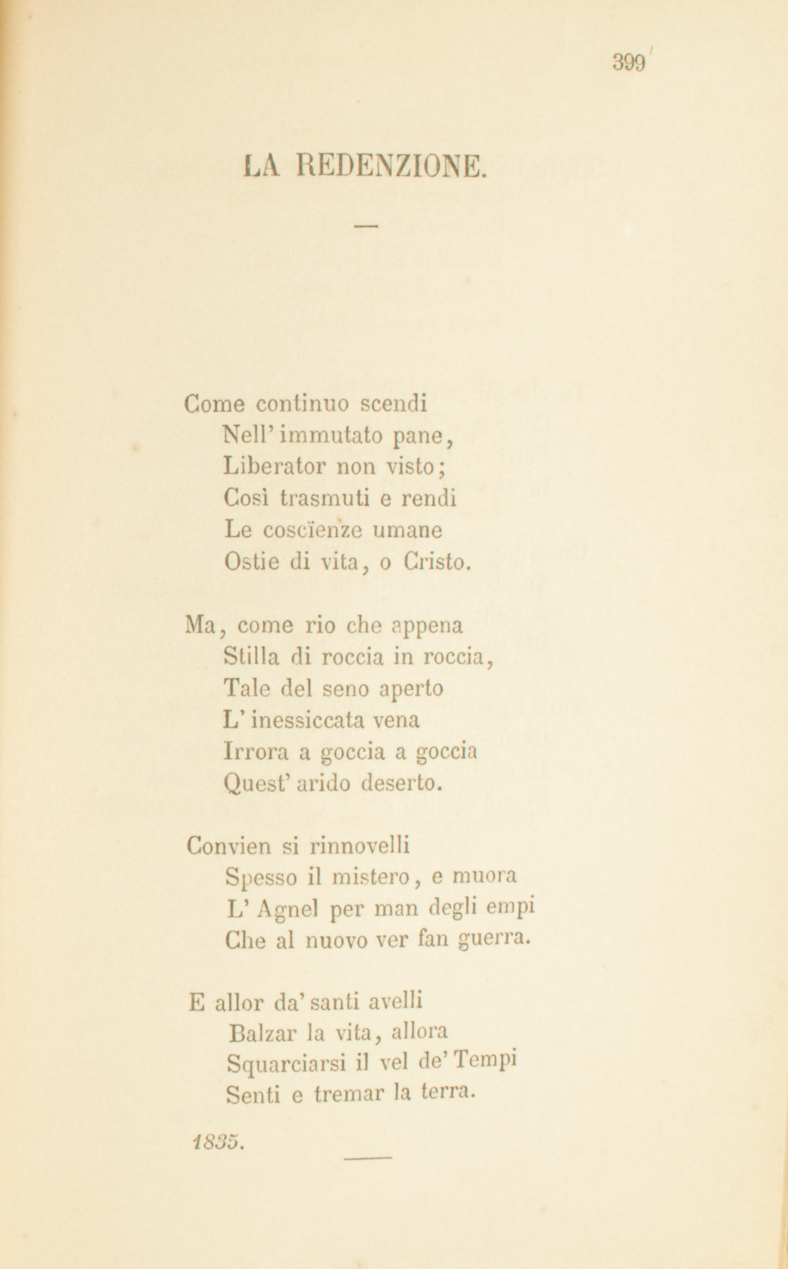Come continuo scendiNell’immutato pane,Liberator non visto;Così trasmuti e rendiLe coscïenze umaneOstie di vita, o Cristo.Ma, come rio che appenaStilla di roccia in roccia,Tale del seno apertoL’inessiccata venaIrrora a goccia a gocciaQuest’arido deserto.Convien si rinnovelliSpesso il mistero, e muoraL’Agnel per man degli empiChe al nuovo ver fan guerra.E allor da’ santi avelliBalzar la vita, alloraSquarciarsi il vel de’ TempiSenti e tremar la terra.1835.