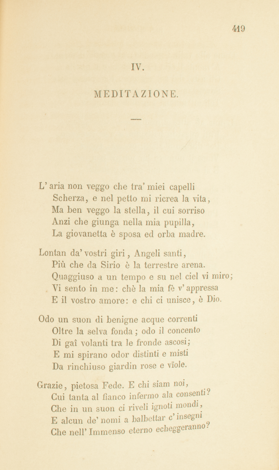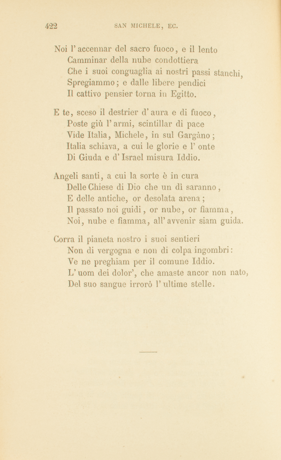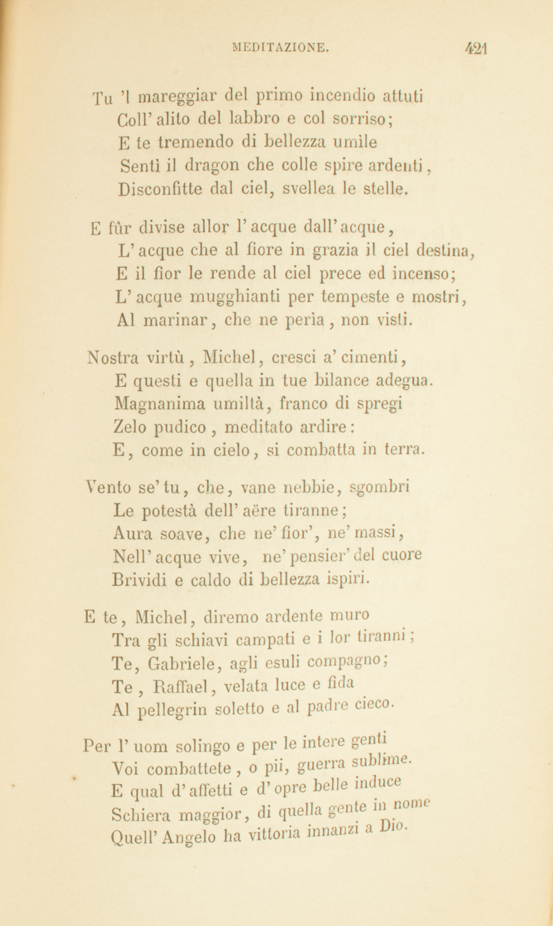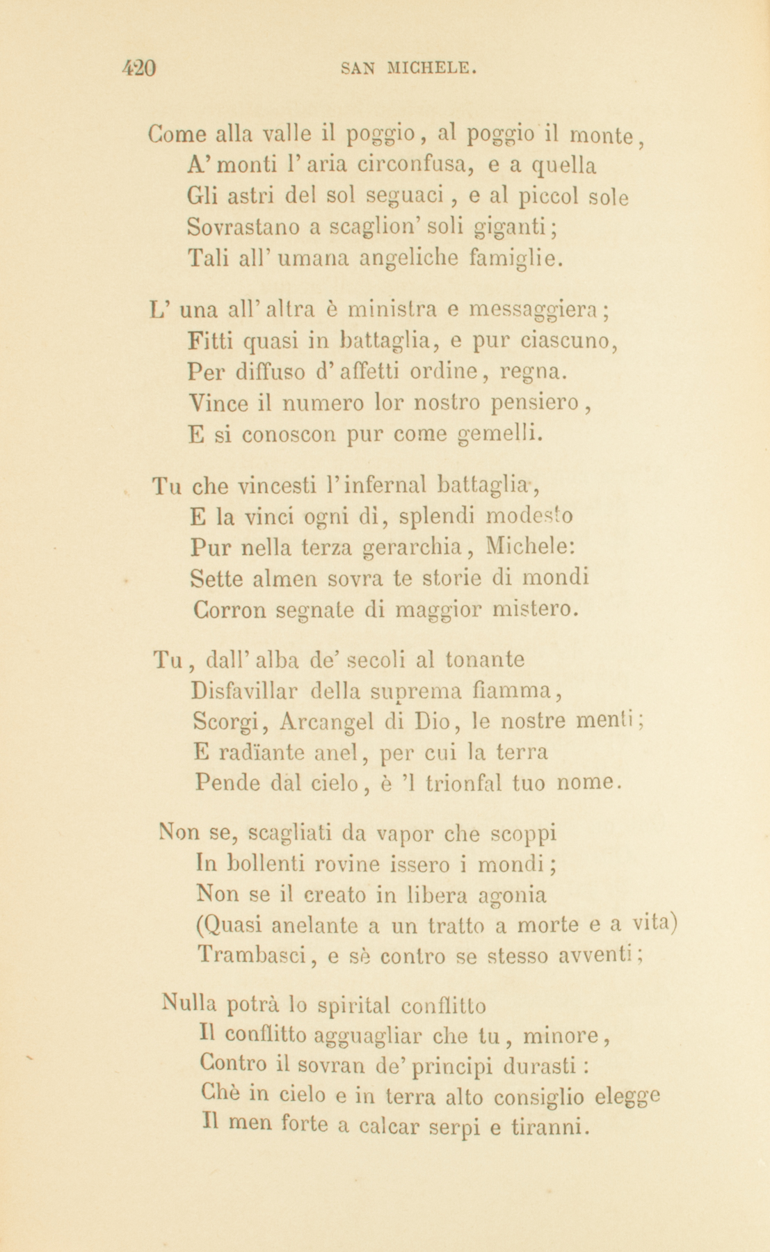 S. Michele. IV. MeditazioneL’aria non veggo che tra’ miei capelliScherza, e nel petto mi ricrea la vita,Ma ben veggo la stella, il cui sorrisoAnzi che giunga nella mia pupilla,La giovanetta è sposa ed orba madre.Lontan da’ vostri giri, Angeli santi,Più che da Sirio è la terrestre arena.Quaggiuso a un tempo e su nel ciel vi miro;Vi sento in me: chè la mia fè v’appressaE il vostro amore: e chi ci unisce, è Dio.Odo un suon di benigne acque correntiOltre la selva fonda; odo il concentoDi gaî volanti tra le fronde ascosi;E mi spirano odor distinti e mistiDa rinchiuso giardin rose e vïole.Grazie, pietosa Fede. E chi siam noi,Cui tanta al fianco infermo ala consenti?Che in un suon ci riveli ignoti mondi,E alcun de’ nomi a balbettar c’insegniChe nell’Immenso eterno echeggeranno?Come alla valle il poggio, al poggio il monte,A’ monti l’aria circonfusa, e a quellaGli astri del sol seguaci, e al piccol soleSovrastano a scaglion’ soli giganti;Tali all’umana angeliche famiglie.L’ una all’altra è ministra e messaggiera;Fitti quasi in battaglia, e pur ciascuno,Per diffuso d’affetti ordine, regna.Vince il numero lor nostro pensiero,E si conoscon pur come gemelli.Tu che vincesti l’infernal battaglia,E la vinci ogni dì, splendi modestoPur nella terza gerarchia, Michele:Sette almen sovra te storie di mondiCorron segnate di maggior mistero.Tu, dall’alba de’ secoli al tonanteDisfavillar della suprema fiamma,Scorgi, Arcangel di Dio, le nostre menti;E radïante anel, per cui la terraPende dal cielo, è ’l trionfal tuo nome.Non se, scagliati da vapor che scoppiIn bollenti rovine issero i mondi;Non se il creato in libera agonia(Quasi anelante a un tratto a morte e a vita)Trambasci, e sè contro se stesso avventi;Nulla potrà lo spirital conflittoIl conflitto agguagliar che tu, minore,Contro il sovran de’ principi durasti:Chè in cielo e in terra alto consiglio eleggeIl men forte a calcar serpi e tiranni.Tu ’l mareggiar del primo incendio attutiColl’alito del labbro e col sorriso;E te tremendo di bellezza umìleSentì il dragon che colle spire ardenti,Disconfitte dal ciel, svellea le stelle.E fûr divise allor l’acque dall’acque,L’acque che al fiore in grazia il ciel destina,E il fior le rende al ciel prece ed incenso;L’acque mugghianti per tempeste e mostri,Al marinar, che ne perìa, non visti.Nostra virtù, Michel, cresci a’ cimenti,E questi e quella in tue bilance adegua.Magnanima umiltà, franco di spregiZelo pudico, meditato ardire:E, come in cielo, si combatta in terra.Vento se’ tu, che, vane nebbie, sgombriLe potestà dell’aëre tiranne;Aura soave, che ne’ fior’, ne’ massi,Nell’acque vive, ne’ pensier’ del cuoreBrividi e caldo di bellezza ispiri.E te, Michel, diremo ardente muroTra gli schiavi campati e i lor tiranni;Te, Gabriele, agli esuli compagno;Te, Raffael, velata luce e fidaAl pellegrin soletto e al padre cieco.Per l’uom solingo e per le intere gentiVoi combattete, o pii, guerra sublime.E qual d’affetti e d’opre belle induceSchiera maggior, di quella gente in nomeQuell’Angelo ha vittoria innanzi a Dio.Noi l’accennar del sacro fuoco, e il lentoCamminar della nube condottieraChe i suoi conguaglia ai nostri passi stanchi,Spregiammo; e dalle libere pendiciIl cattivo pensier torna in Egitto.E te, sceso il destrier d’aura e di fuoco,Poste giù l’armi, scintillar di paceVide Italia, Michele, in sul Gargàno;Italia schiava, a cui le glorie e l’onteDi Giuda e d’Israel misura Iddio.Angeli santi, a cui la sorte è in curaDelle Chiese di Dio che un dì saranno,E delle antiche, or desolata arena;Il passato noi guidi, or nube, or fiamma,Noi, nube e fiamma, all’avvenir siam guida.Corra il pianeta nostro i suoi sentieriNon di vergogna e non di colpa ingombri:Ve ne preghiam per il comune Iddio.L’uom dei dolor’, che amaste ancor non nato,Del suo sangue irrorò l’ultime stelle.