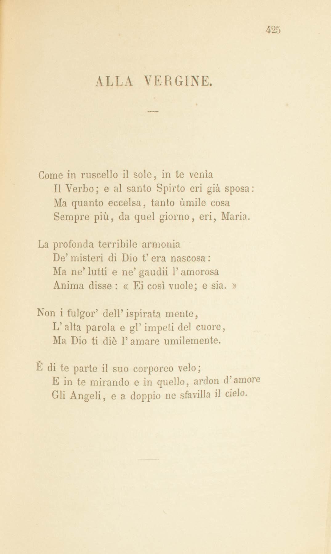 Come in ruscello il sole, in te venìaIl Verbo; e al santo Spirto eri già sposa:Ma quanto eccelsa, tanto ùmile cosaSempre più, da quel giorno, eri, Maria.La profonda terribile armoniaDe’ misteri di Dio t’era nascosa:Ma ne’ lutti e ne’ gaudii l’amorosaAnima disse: «Ei così vuole; e sia.»Non i fulgor’ dell’ispirata mente,L’alta parola e gl’impeti del cuore,Ma Dio ti diè l’amare umilemente.È di te parte il suo corporeo velo;E in te mirando e in quello, ardon d’amoreGli Angeli, e a doppio ne sfavilla il cielo.