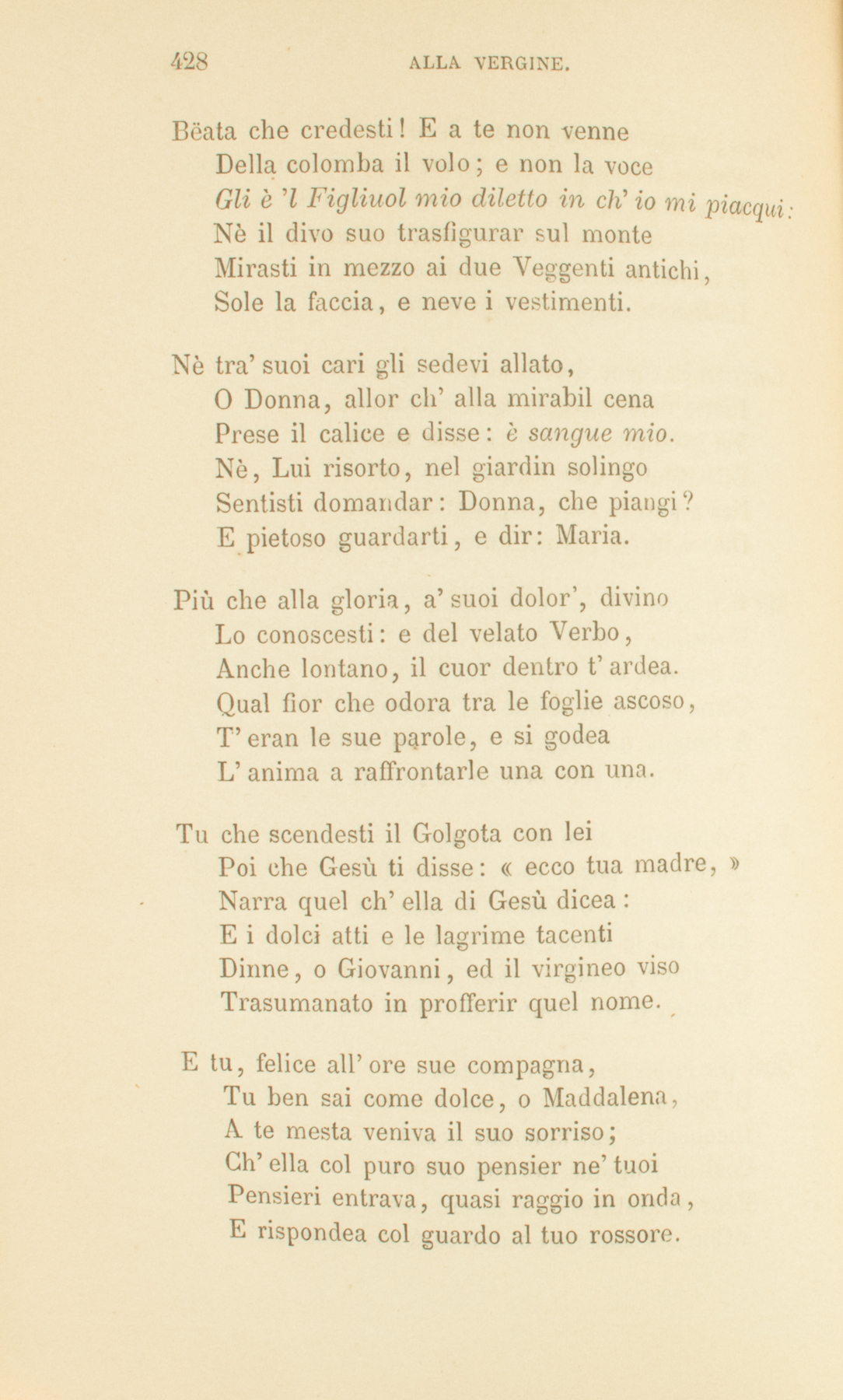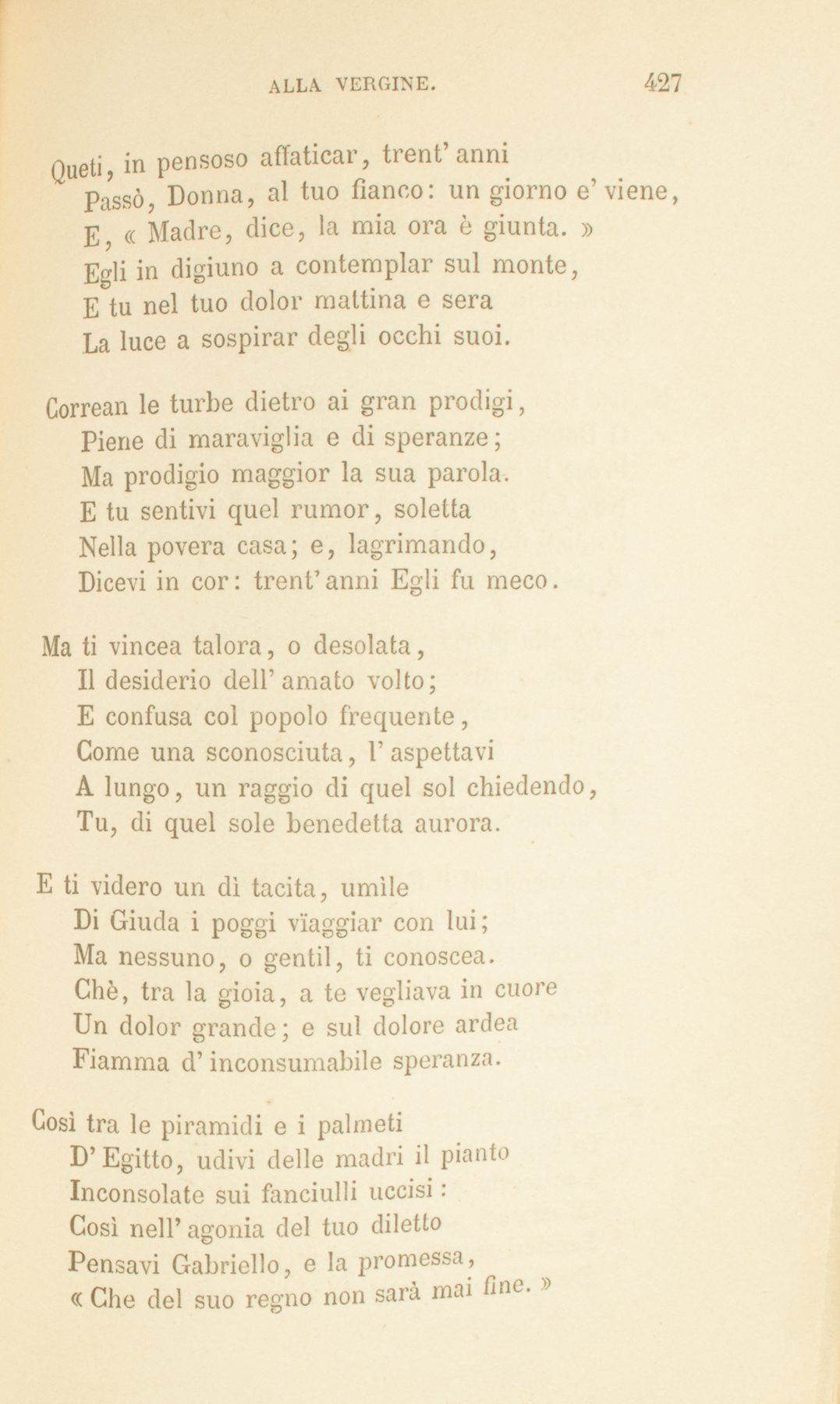 Offrian commossi al tuo Figliuol, Maria,Gl’ignoti vïandanti incenso ed oro:E intanto gli occhi tuoi sommessamenteContemplavan la stella pellegrinaCh’era venuta ad adorar con loro,Che sul presepe povero lucea.Quando, Maria, vedevi il tuo dilettoEsercitar nel ruvido lavoroLe benedette mani allato al padre;Entro al pensier ti risonava il canto,Quel dolce canto: «A Dio gloria ne’ cieli;E agli uomini quaggiù pace d’affetto.»Quand’aprivi, Maria, le labbra pureAl comando, e dicevi: «Figliuol mio,»Con gioia riverente il cuor tremava.Gli occhi ora al cielo, or nel beato aspettoFisi tenevi; e, nell’ orar con lui,S’ispirava di lui la tua preghiera.Queti, in pensoso affaticar, trent’anniPassò, Donna, al tuo fianco: un giorno e’ viene,E, «Madre, dice, la mia ora è giunta.»Egli in digiuno a contemplar sul monte,E tu nel tuo dolor mattina e seraLa luce a sospirar degli occhi suoi.Correan le turbe dietro ai gran prodigi,Piene di maraviglia e di speranze;Ma prodigio maggior la sua parola.E tu sentivi quel rumor, solettaNella povera casa; e, lagrimando,Dicevi in cor: trent’anni Egli fu meco.Ma ti vincea talora, o desolata,Il desiderio dell’amato volto;E confusa col popolo frequente,Come una sconosciuta, l’aspettaviA lungo, un raggio di quel sol chiedendo,Tu, di quel sole benedetta aurora.E ti videro un dì tacita, umìleDi Giuda i poggi vïaggiar con lui;Ma nessuno, o gentil, ti conoscea.Chè, tra la gioia, a te vegliava in cuoreUn dolor grande; e sul dolore ardeaFiamma d’inconsumabile speranza.Così tra le piramidi e i palmetiD’Egitto, udivi delle madri il piantoInconsolate sui fanciulli uccisi:Così nell’agonia del tuo dilettoPensavi Gabriello, e la promessa,«Che del suo regno non sarà mai fine.»Bëata che credesti! E a te non venneDella colomba il volo; e non la voceGli è ’l Figliuol mio diletto in ch’io mi piacqui:Nè il divo suo trasfigurar sul monteMirasti in mezzo ai due Veggenti antichi,Sole la faccia, e neve i vestimenti.Nè tra’ suoi cari gli sedevi allato,O Donna, allor ch’alla mirabil cenaPrese il calice e disse: è sangue mio.Nè, Lui risorto, nel giardin solingoSentisti domandar: Donna, che piangi?E pietoso guardarti, e dir: Maria.Più che alla gloria, a’ suoi dolor’, divinoLo conoscesti: e del velato Verbo,Anche lontano, il cuor dentro t’ardea.Qual fior che odora tra le foglie ascoso,T’eran le sue parole, e si godeaL’anima a raffrontarle una con una.Tu che scendesti il Golgota con leiPoi che Gesù ti disse: «ecco tua madre,»Narra quel ch’ella di Gesù dicea:E i dolci atti e le lagrime tacentiDinne, o Giovanni, ed il virgineo visoTrasumanato in profferir quel nome.E tu, felice all’ore sue compagna,Tu ben sai come dolce, o Maddalena,A te mesta veniva il suo sorriso;Ch’ella col puro suo pensier ne’ tuoiPensieri entrava, quasi raggio in onda,E rispondea col guardo al tuo rossore.Tutti i dolor’ conosce, i falli tuttiVela del mite suo candor Maria.Donna, gli spazii e i secoli lontaniIl guardo tuo misura; e tutta abbracci,Come fa madre il suo unico figlio,E benedici la famiglia umana.Ave, Maria. Noi ti preghiam gementiDell’altrui colpa, e della nostra stanchi.Per gl’infelici a cui la roba manca,Di’, vòlta al tuo Figliuol: «non hanno pane.»Per gl’infelici a cui par poco Iddio,Di’, vòlta al tuo diletto: «amor non hanno. »1843.