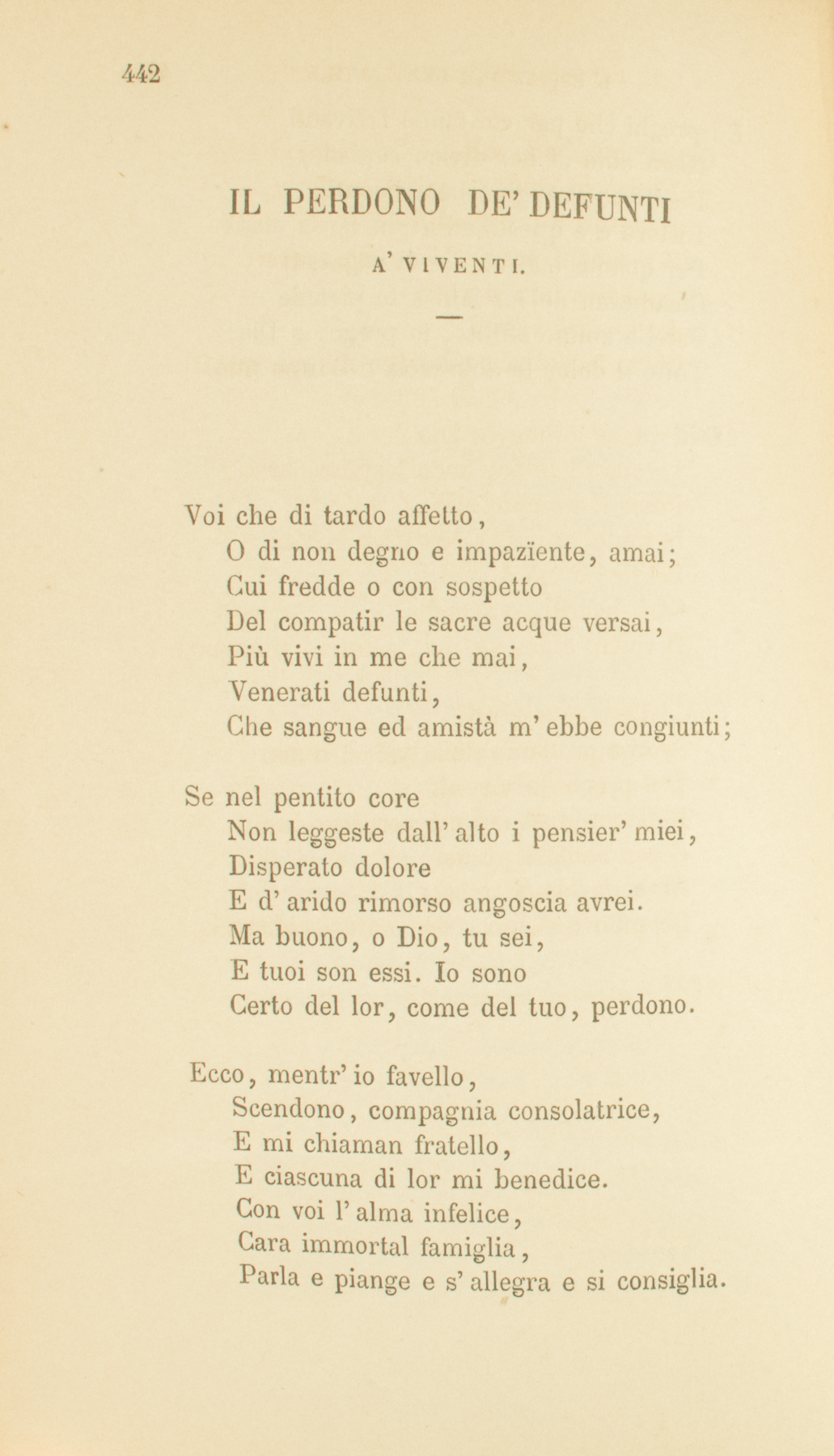 Voi che di tardo affetto,O di non degno e impazïente, amai;Cui fredde o con sospettoDel compatir le sacre acque versai,Più vivi in me che mai,Venerati defunti,Che sangue ed amistà m’ebbe congiunti;Se nel pentito coreNon leggeste dall’alto i pensier’ miei,Disperato doloreE d’arido rimorso angoscia avrei.Ma buono, o Dio, tu sei,E tuoi son essi. Io sonoCerto del lor, come del tuo, perdono.Ecco, mentr’io favello,Scendono, compagnia consolatrice,E mi chiaman fratello,E ciascuna di lor mi benedice.Con voi l’alma infelice,Cara immortal famiglia,Parla e piange e s’allegra e si consiglia.Quanti dolor’ non vili,Fermo in voler di carità, soffersi,A quanti alti e gentiliE presaghi pensier’ l’anima apersi;Ogni ben mio si versiAd espiare i tortiCh’io feci a’ cari miei che mi son morti.E in quant’anime, o Dio,Lasciai di colpa, anco leggier, ferita;Possa l’esempio mioIn tante, e più, salda rifar la vita.Pregovi a ciò d’aìta,Cari defunti, e scendaIl vostro amor su noi, comune ammenda.Chè dalle morte gentiSgorga profondo della vita il fiume,E il prego de’ viventiRende alle spente età perpetuo lume;E con stellate piumeAmor la lunga tracciaDe’ mondi andati e de’ venturi abbraccia.1853.
