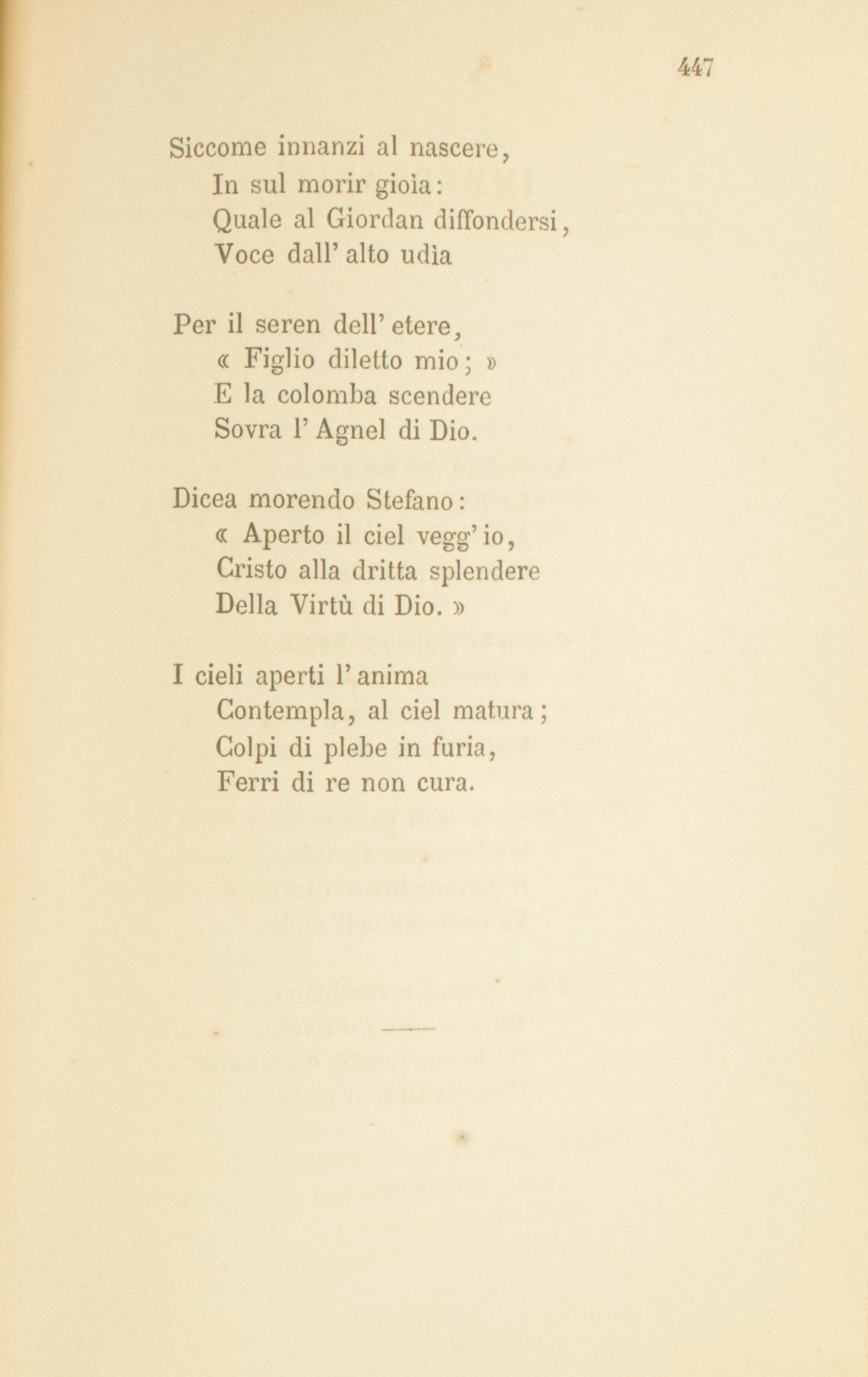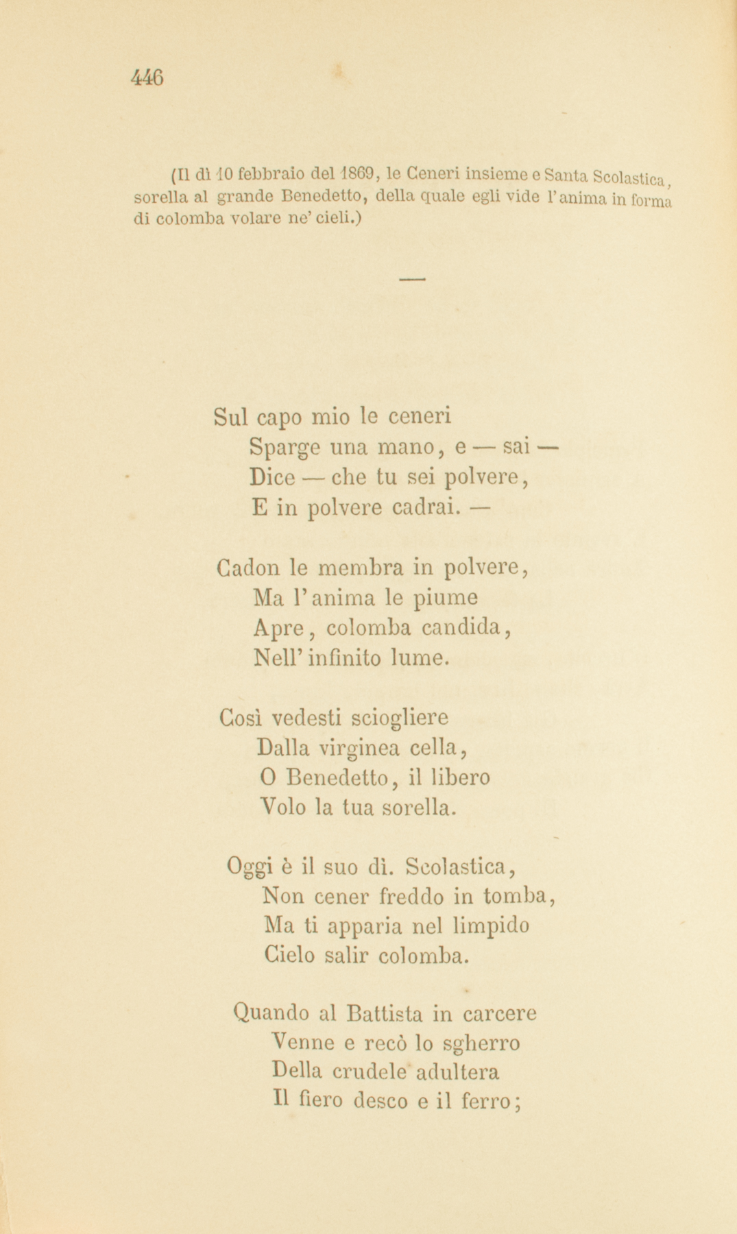 (Il dì 10 febbraio del 1869, le Ceneri insieme e Santa Scolastica,sorella al grande Benedetto, della quale egli vide l’anima in formadi colomba volare ne’ cieli.)Sul capo mio le ceneriSparge una mano, e — sai —Dice — che tu sei polvere,E in polvere cadrai. —Cadon le membra in polvere,Ma l’anima le piumeApre, colomba candida,Nell’infinito lume.Così vedesti sciogliereDalla virginea cella,O Benedetto, il liberoVolo la tua sorella.Oggi è il suo dì. Scolastica,Non cener freddo in tomba,Ma ti apparia nel limpidoCielo salir colomba.Quando al Battista in carcereVenne e recò lo sgherroDella crudele adulteraIl fiero desco e il ferro;Siccome innanzi al nascere,In sul morir gioìa:Quale al Giordan diffondersi,Voce dall’alto udìaPer il seren dell’etere,«Figlio diletto mio;»E la colomba scendereSovra l’Agnel di Dio.Dicea morendo Stefano:«Aperto il ciel vegg’io,Cristo alla dritta splendereDella Virtù di Dio.»I cieli aperti l’animaContempla, al ciel matura;Colpi di plebe in furia,Ferri di re non cura.