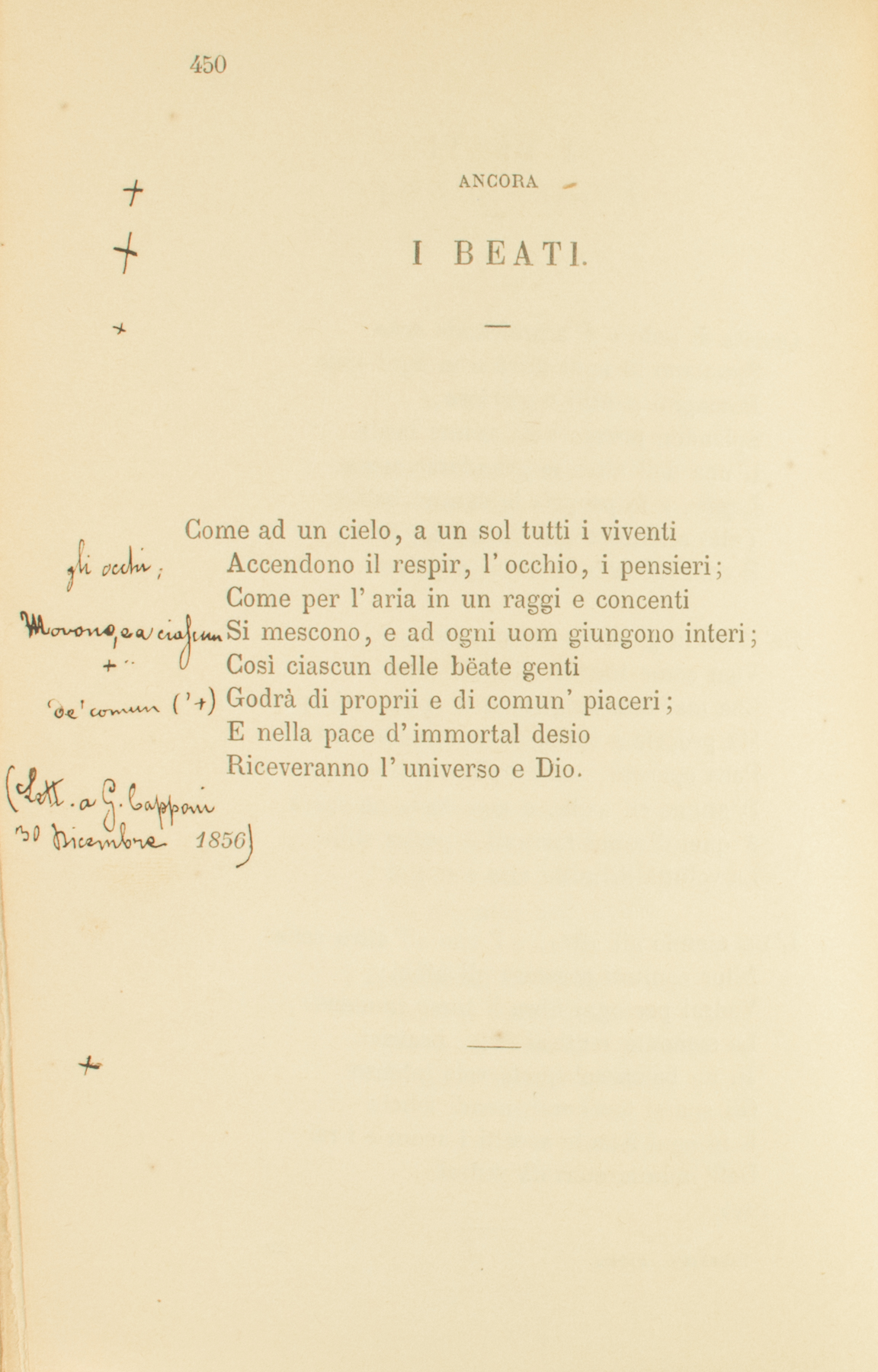 Come ad un cielo, a un sol tutti i viventiAccendono il respir, l’occhio, i pensieri;Come per l’aria in un raggi e concentiSi mescono, e ad ogni uom giungono interi;Così ciascun delle bëate gentiGodrà di proprii e di comun’ piaceri;E nella pace d’immortal desioRiceveranno l’universo e Dio.1856.
