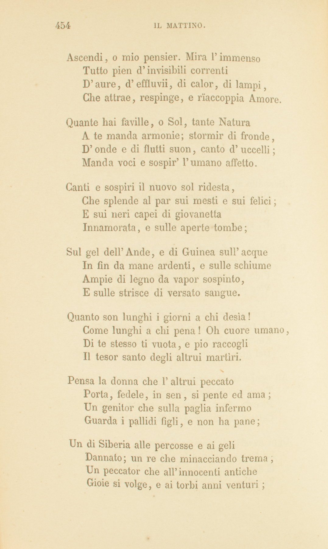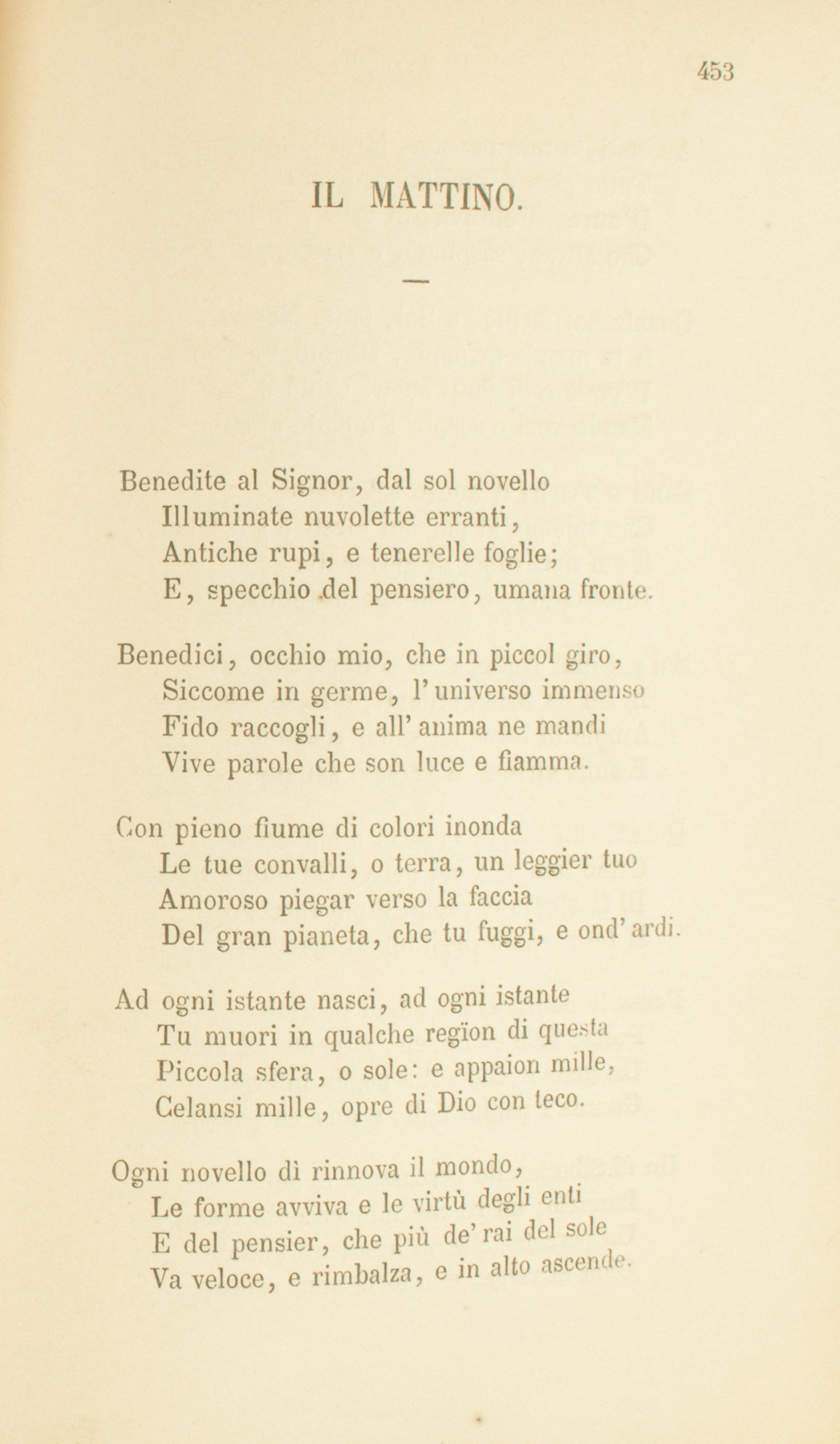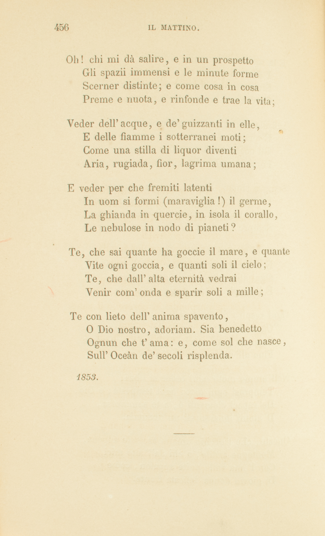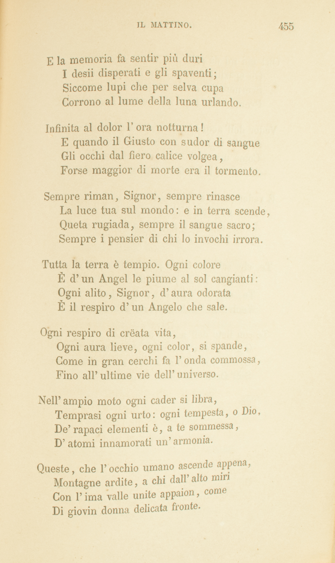 Benedite al Signor, dal sol novelloIlluminate nuvolette erranti,Antiche rupi, e tenerelle foglie;E, specchio del pensiero, umana fronte.Benedici, occhio mio, che in piccol giro,Siccome in germe, l’universo immensoFido raccogli, e all’anima ne mandiVive parole che son luce e fiamma.Con pieno fiume di colori inondaLe tue convalli, o terra, un leggier tuoAmoroso piegar verso la facciaDel gran pianeta, che tu fuggi, e ond’ardi.Ad ogni istante nasci, ad ogni istanteTu muori in qualche regïon di questaPiccola sfera, o sole: e appaion mille,Celansi mille, opre di corpi Dio con teco.Ogni novello dì rinnova il mondo,Le forme avviva e le virtù degli entiE del pensier, che più de’ rai del soleVa veloce, e rimbalza, e in alto ascende.Ascendi, o mio pensier. Mira l’immensoTutto pien d’invisibili correntiD’aure, d’effluvii, di calor, di lampi,Che attrae, respinge, e rïaccoppia Amore.Quante hai faville, o Sol, tante NaturaA te manda armonie; stormir di fronde,D’onde e di flutti suon, canto d’uccelli;Manda voci e sospir’ l’umano affetto.Canti e sospiri il nuovo sol ridesta,Che splende al par sui mesti e sui felici;E sui neri capei di giovanettaInnamorata, e sulle aperte tombe;Sul gel dell’Ande, e di Guinea sull’acqueIn fin da mane ardenti, e sulle schiumeAmpie di legno da vapor sospinto,E sulle strisce di versato sangue.Quanto son lunghi i giorni a chi desia!Come lunghi a chi pena! Oh cuore umano,Di te stesso ti vuota, e pio raccogliIl tesor santo degli altrui martìri.Pensa la donna che l’altrui peccatoPorta, fedele, in sen, si pente ed ama;Un genitor che sulla paglia infermoGuarda i pallidi figli, e non ha pane;Un di Siberia alle percosse e ai geliDannato; un re che minacciando trema;Un peccator che all’innocenti anticheGioie si volge, ai torbi anni venturi;E la memoria fa sentir più duriI desii disperati e gli spaventi;Siccome lupi che per selva cupaCorrono al lume della luna urlando.Infinita al dolor l’ora notturna!E quando il Giusto con sudor di sangueGli occhi dal fiero calice volgea,Forse maggior di morte era il tormento.Sempre riman, Signor, sempre rinasceLa luce tua sul mondo: e in terra scende,Queta rugiada, sempre il sangue sacro;Sempre i pensier di chi lo invochi irrora.Tutta la terra è tempio. Ogni coloreÈ d’un Angel le piume al sol cangianti:Ogni alito, Signor, d’aura odorataÈ il respiro d’un Angelo che sale.Ogni respiro di crëata vita,Ogni aura lieve, ogni color, si spande,Come in gran cerchi fa l’onda commossa,Fino all’ultime vie dell’universo.Nell’ampio moto ogni cader si libra,Temprasi ogni urto: ogni tempesta, o Dio,De’ rapaci elementi è, a te sommessa,D’atomi innamorati un’armonia.Queste, che l’occhio umano ascende appena,Montagne ardite, a chi dall’alto miriCon l’ima valle unite appaion, comeDi giovin donna delicata fronte.Oh! chi mi dà salire, e in un prospettoGli spazii immensi e le minute formeScerner distinte; e come cosa in cosaPreme e nuota, e rinfonde e trae la vita;Veder dell’acque, e de’ guizzanti in elle,E delle fiamme i sotterranei moti;Come una stilla di liquor diventiAria, rugiada, fior, lagrima umana;E veder per che fremiti latentiIn uom si formi (maraviglia!) il germe,La ghianda in quercie, in isola il corallo,Le nebulose in nodo di pianeti?Te, che sai quante ha goccie il mare, e quanteVite ogni goccia, e quanti soli il cielo;Te, che dall’alta eternità vedraiVenir com’onda e sparir soli a mille;Te con lieto dell’anima spavento,O Dio nostro, adoriam. Sia benedettoOgnun che t’ama: e, come sol che nasce,Sull’Oceàn de’ secoli risplenda.1853.