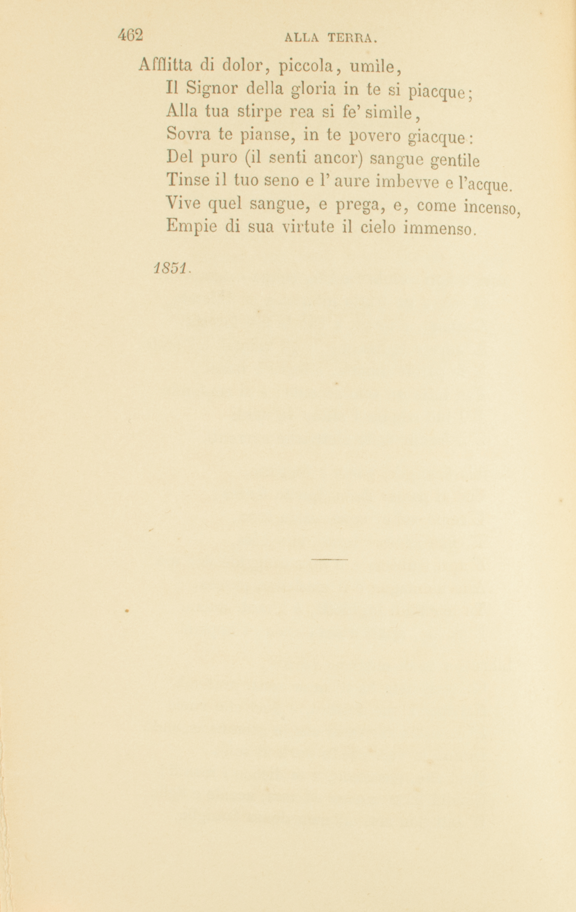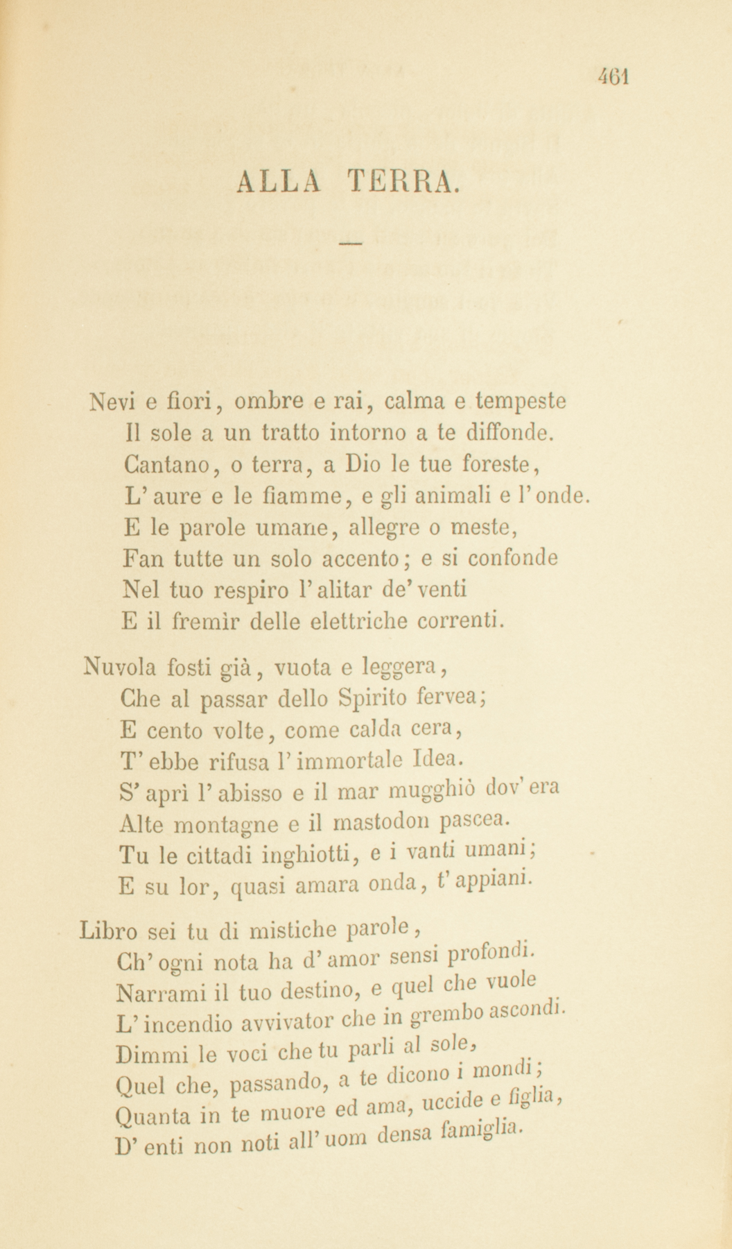 Nevi e fiori, ombre e rai, calma e tempesteIl sole a un tratto intorno a te diffonde.Cantano, o terra, a Dio le tue foreste,L’aure e le fiamme, e gli animali e l’onde.E le parole umane, allegre o meste,Fan tutte un solo accento; e si confondeNel tuo respiro l’alitar de’ ventiE il fremìr delle elettriche correnti.Nuvola fosti già, vuota e leggera,Che al passar dello Spirito fervea;E cento volte, come calda cera,T’ebbe rifusa l’immortale Idea.S’aprì l’abisso e il mar mugghiò dov’eraAlte montagne e il mastodon pascea.Tu le cittadi inghiotti, e i vanti umani;E su lor, quasi amara onda, t’appiani.Libro sei tu di mistiche parole,Ch’ogni nota ha d’amor sensi profondi.Narrami il tuo destino, e quel che vuoleL’incendio avvivator che in grembo ascondi.Dimmi le voci che tu parli al sole,Quel che, passando, a te dicono i mondi;Quanta in te muore ed ama, uccide e figlia,D’enti non noti all’uom densa famiglia.Afflitta di dolor, piccola, umile,Il Signor della gloria in te si piacque;Alla tua stirpe rea si fe’ simile,Sovra te pianse, in te povero giacque:Del puro (il senti ancor) sangue gentileTinse il tuo seno e l’aure imbevve e l’acque.Vive quel sangue, e prega, e, come incenso,Empie di sua virtute il cielo immenso.1851.
