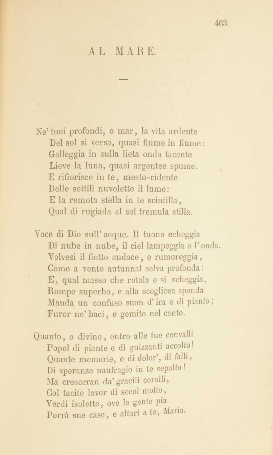 Ne’ tuoi profondi, o mar, la vita ardenteDel sol si versa, quasi fiume in fiume:Galleggia in sulla lieta onda tacenteLieve la luna, quasi argentee spume.E rifiorisce in te, mesto-ridenteDelle sottili nuvolette il lume:E la remota stella in te scintilla,Qual di rugiada al sol tremula stilla.Voce di Dio sull’acque. Il tuono echeggiaDi nube in nube, il ciel lampeggia e l’onda.Volvesi il fiotto audace, e rumoreggia,Come a vento autunnal selva profonda:E, qual masso che rotola e si scheggia,Rompe superbo, e alla scogliosa spondaManda un confuso suon d’ira e di pianto;Furor ne’ baci, e gemito nel canto.Quanto, o divino, entro alle tue convalliPopol di piante e di guizzanti accolto!Quante memorie, e di dolor’, di falli,Di speranze naufragio in te sepolto!Ma cresceran da’ gracili coralli,Col tacito lavor di secol molto,Verdi isolette, ove la gente piaPorrà sue case, e altari a te, Maria.Mille miglia lontano al monte apricoI suoi vapori invia, messaggi fidi:L’acque del monte al generoso amicoCorron, cercando i desïati lidi.Tu, pacier prepotente, e pio nemico,Stringi le umane genti e le dividi.La bella Libertà, che sul mar nacque,Esule quindi e nuda erra per l’acque.1851.