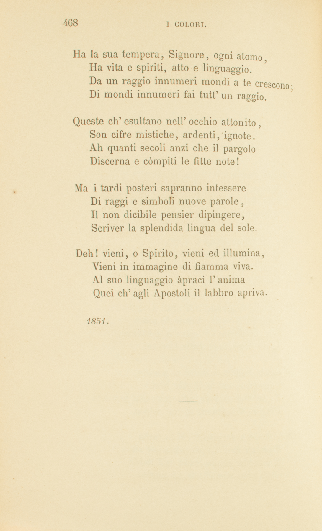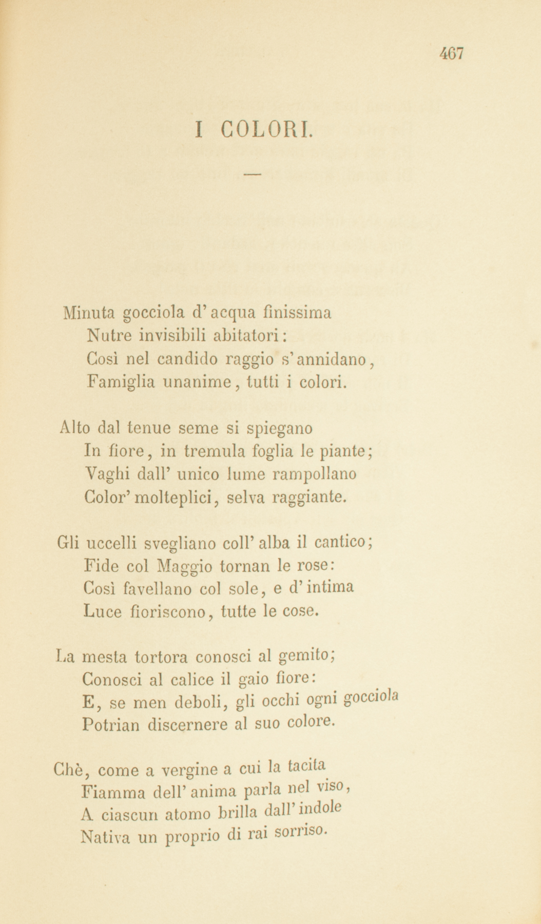 Minuta gocciola d’acqua finissimaNutre invisibili abitatori:Così nel candido raggio s’annidano,Famiglia unanime, tutti i colori.Alto dal tenue seme si spieganoIn fiore, in tremula foglia le piante;Vaghi dall’unico lume rampollanoColor’ molteplici, selva raggiante.Gli uccelli svegliano coll’alba il cantico;Fide col Maggio tornan le rose:Così favellano col sole, e d’intimaLuce fioriscono, tutte le cose.La mesta tortora conosci al gemito;Conosci al calice il gaio fiore:E, se men deboli, gli occhi ogni gocciolaPotrian discernere al suo colore.Chè, come a vergine a cui la tacitaFiamma dell’anima parla nel viso,A ciascun atomo brilla dall’indoleNativa un proprio di rai sorriso.Ha la sua tempera, Signore, ogni atomo,Ha vita e spiriti, atto e linguaggio.Da un raggio innumeri mondi a te crescono;Di mondi innumeri fai tutt’un raggio.Queste ch’esultano nell’occhio attonito,Son cifre mistiche, ardenti, ignote.Ah quanti secoli anzi che il pargoloDiscerna e còmpiti le fitte note!Ma i tardi posteri sapranno intessereDi raggi e simboli nuove parole,Il non dicibile pensier dipingere,Scriver la splendida lingua del sole.Deh! vieni, o Spirito, vieni ed illumina,Vieni in immagine di fiamma viva.Al suo linguaggio àpraci l’animaQuei ch’agli Apostoli il labbro apriva.1851.