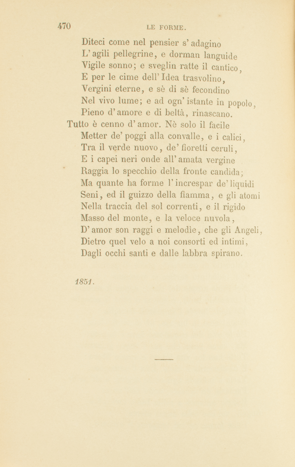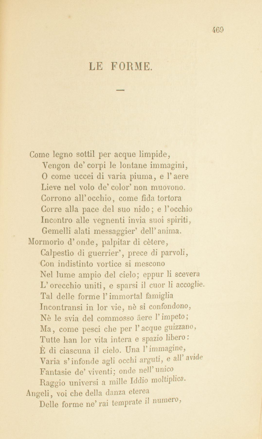 Come legno sottil per acque limpide,Vengon de’ corpi le lontane immagini,O come uccei di varia piuma, e l’aereLieve nel volo de’ color’ non muovono.Corrono all’occhio, come fida tortoraCorre alla pace del suo nido; e l’occhioIncontro alle vegnenti invia suoi spiriti,Gemelli alati messaggier’ dell’anima.Mormorio d’onde, palpitar di cètere,Calpestìo di guerrier’, prece di parvoli,Con indistinto vortice si mesconoNel lume ampio del cielo; eppur li sceveraL’orecchio uniti, e sparsi il cuor li accoglie.Tal delle forme l’immortal famigliaIncontransi in lor vie, nè si confondono,Nè le svia del commosso äere l’impeto;Ma, come pesci che per l’acque guizzano,Tutte han lor vita intera e spazio libero:È di ciascuna il cielo. Una l’immagine,Varia s’infonde agli occhi arguti, e all’avideFantasie de’ viventi; onde nell’unicoRaggio universi a mille Iddio moltiplica.Angeli, voi che della danza etereaDelle forme ne’ rai temprate il numero,LE FORME.Come legno sottil per acque limpide,Vengon de’ corpi le lontane immagini,O come uccei di varia piuma, e l’aereLieve nel volo de’ color’ non muovono.Corrono all’occhio, come fida tortoraCorre alla pace del suo nido; e l’occhioIncontro alle vegnenti invia suoi spiriti,Gemelli alati messaggier’ dell’anima.Mormorio d’onde, palpitar di cètere,Calpestìo di guerrier’, prece di parvoli,Con indistinto vortice si mesconoNel lume ampio del cielo; eppur li sceveraL’orecchio uniti, e sparsi il cuor li accoglie.Tal delle forme l’immortal famigliaIncontransi in lor vie, nè si confondono,Nè le svia del commosso äere l’impeto;Ma, come pesci che per l’acque guizzano,Tutte han lor vita intera e spazio libero:È di ciascuna il cielo. Una l’immagine,Varia s’infonde agli occhi arguti, e all’avideFantasie de’ viventi; onde nell’unicoRaggio universi a mille Iddio moltiplica.Angeli, voi che della danza etereaDelle forme ne’ rai temprate il numero,1851.