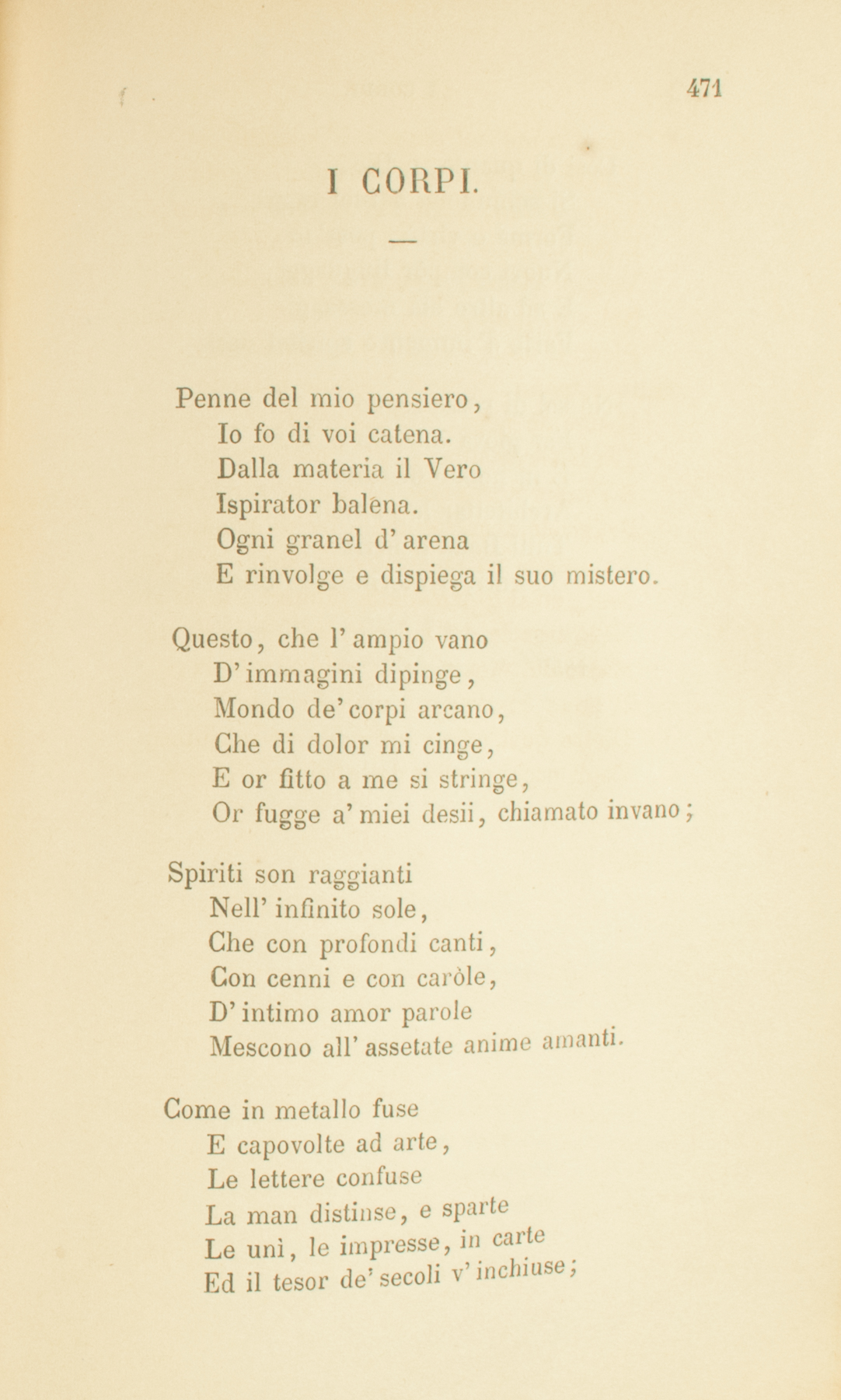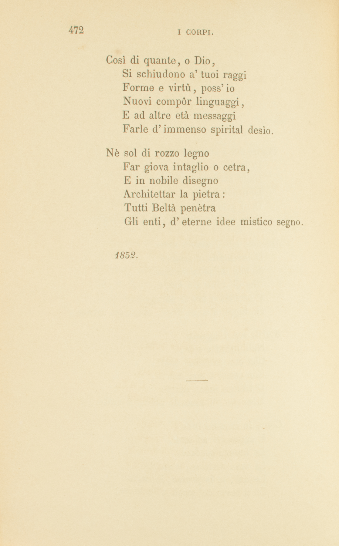 Penne del mio pensiero,Io fo di voi catena.Dalla materia il VeroIspirator balena.Ogni granel d’arenaE rinvolge e dispiega il suo mistero.Questo, che l’ampio vanoD’immagini dipinge,Mondo de’ corpi arcano,Che di dolor mi cinge,E or fitto a me si stringe,Or fugge a’ miei desii, chiamato invano;Spiriti son raggiantiNell’infinito sole,Che con profondi canti,Con cenni e con caròle,D’intimo amor paroleMescono all’assetate anime amanti.Come in metallo fuseE capovolte ad arte,Le lettere confuseLa man distinse, e sparteLe unì, le impresse, in carteEd il tesor de’ secoli v’inchiuse;Così di quante, o Dio,Si schiudono a’ tuoi raggiForme e virtù, poss’ioNuovi compôr linguaggi,E ad altre età messaggiFarle d’immenso spirital desìo.Nè sol di rozzo legnoFar giova intaglio o cetra,E in nobile disegnoArchitettar la pietra:Tutti Beltà penètraGli enti, d’eterne idee mistico segno.1852.