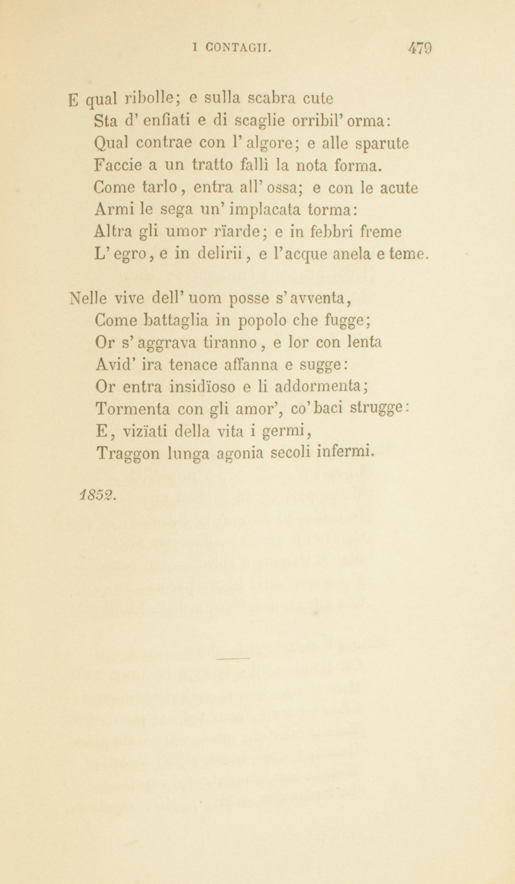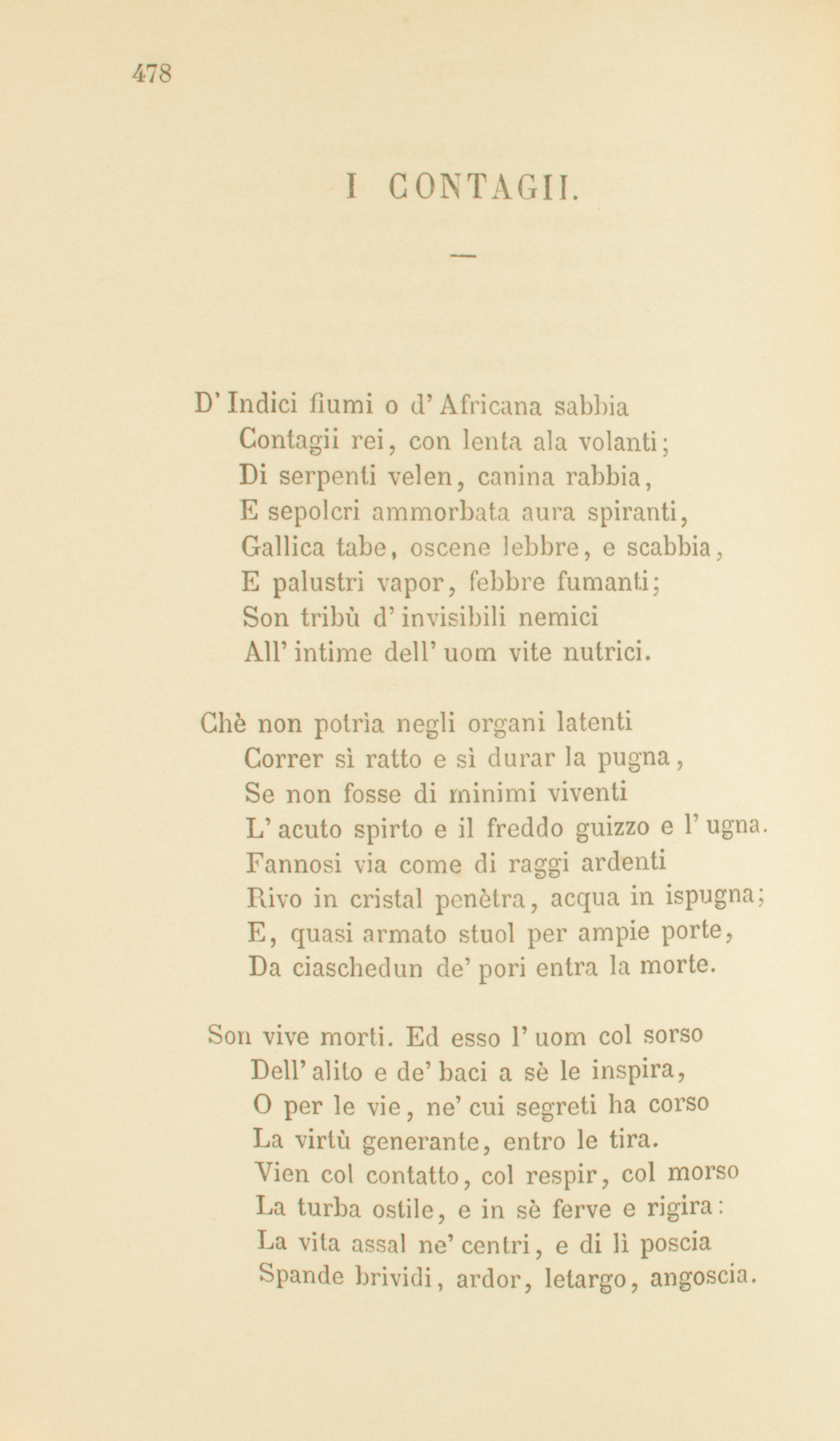 D’Indici fiumi o d’Africana sabbiaContagii rei, con lenta ala volanti;Di serpenti velen, canina rabbia,E sepolcri ammorbata aura spiranti,Gallica tabe, oscene lebbre, e scabbia,E palustri vapor, febbre fumanti;Son tribù d’invisibili nemiciAll’intime dell’uom vite nutrici.Chè non potrìa negli organi latentiCorrer sì ratto e sì durar la pugna,Se non fosse di minimi viventiL’acuto spirto e il freddo guizzo e l’ugna.Fannosi via come di raggi ardentiRivo in cristal penètra, acqua in ispugna;E, quasi armato stuol per ampie porte,Da ciaschedun de’ pori entra la morte.Son vive morti. Ed esso l’uom col sorsoDell’alito e de’ baci a sè le inspira,O per le vie, ne’ cui segreti ha corsoLa virtù generante, entro le tira.Vien col contatto, col respir, col morsoLa turba ostile, e in sè ferve e rigira:La vita assai ne’ centri, e di lì posciaSpande brividi, ardor, letargo, angoscia.E qual ribolle; e sulla scabra cuteSta d’enfiati e di scaglie orribil’orma:Qual contrae con l’algore; e alle sparuteFaccie a un tratto fallì la nota forma.Come tarlo, entra all’ossa; e con le acuteArmi le sega un’implacata torma:Altra gli umor rïarde; e in febbri fremeL’egro, e in delirii, e l’acque anela e teme.Nelle vive dell’uom posse s’avventa,Come battaglia in popolo che fugge;Or s’aggrava tiranno, e lor con lentaAvid’ira tenace affanna e sugge:Or entra insidïoso e li addormenta;Tormenta con gli amor’, co’ baci strugge:E, vizïati della vita i germi,Traggon lunga agonia secoli infermi.1852.