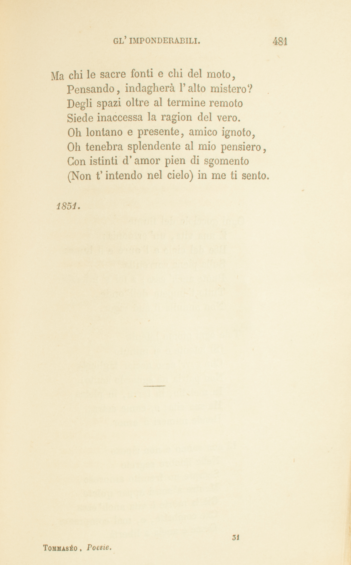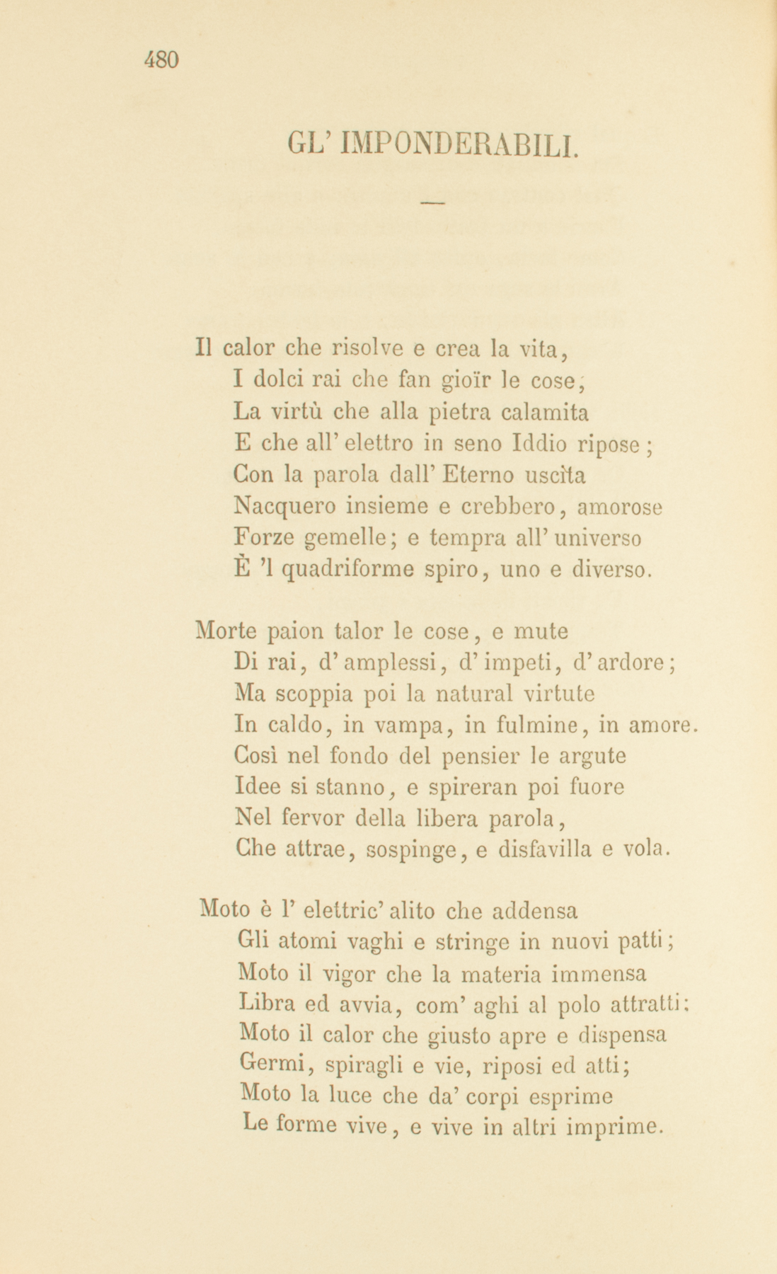 Il calor che risolve e crea la vita,I dolci rai che fan gioir le cose,La virtù che alla pietra calamitaE che all’elettro in seno Iddio ripose;Con la parola dall’Eterno uscitaNacquero insieme e crebbero, amoroseForze gemelle; e tempra all’ universoÈ ’l quadriforme spiro, uno e diverso.Morte paion talor le cose, e muteDi rai, d’amplessi, d’impeti, d’ardore;Ma scoppia poi la natural virtuteIn caldo, in vampa, in fulmine, in amore.Così nel fondo del pensier le arguteIdee si stanno, e spireran poi fuoreNel fervor della libera parola,Che attrae, sospinge, e disfavilla e vola.Moto è l’elettric’alito che addensaGli atomi vaghi e stringe in nuovi patti;Moto il vigor che la materia immensaLibra ed avvia, com’aghi al polo attratti;Moto il calor che giusto apre e dispensaGermi, spiragli e vie, riposi ed atti;Moto la luce che da’ corpi esprimeLe forme vive, e vive in altri imprime.Ma chi le sacre fonti e chi del moto,Pensando, indagherà l’alto mistero?Degli spazi oltre al termine remotoSiede inaccessa la ragion del vero.Oh lontano e presente, amico ignoto,Oh tenebra splendente al mio pensiero,Con istinti d’amor pien di sgomento(Non t’intendo nel cielo) in me ti sento.1851.