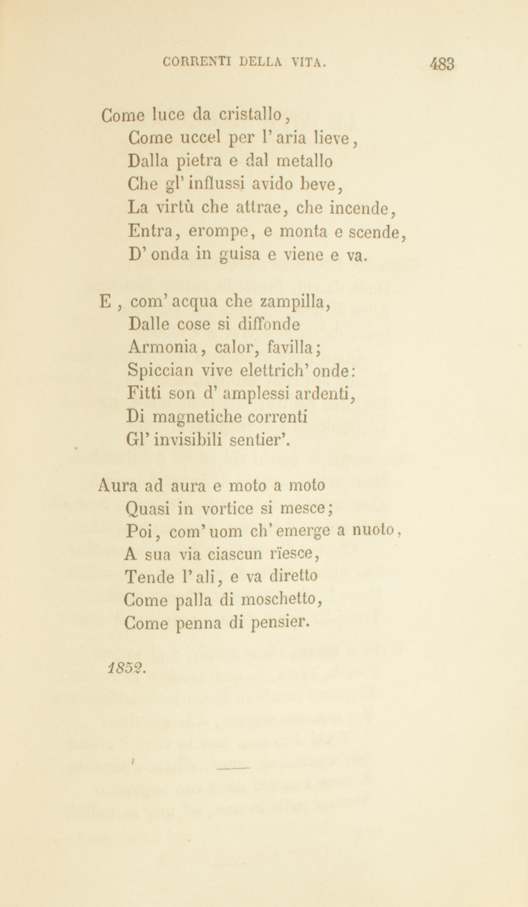 Ogni gocciola del fiumeÈ una vita, un’armonia;Bee del cielo e l’aure e il lume:Sulla piena correntìaPuote anch’essa; a lei s’infondeTutto l’impeto dell’onde,Non annulla il suo vigor.Tale ogni atomo latente(Sì latente e sì minutoChe sovr’esso acciar taglienteNon potrìa nè sguardo acuto),In metallo, in terra, in pietra,Ha sua vita; e, come cetra,Rende numeri d’amor.Lì non sonno e non riposo;Nelle làtebre segreteSempre un fremito amoroso,Mentre a’ sensi appar quïete.Già la morte è vita anch’essaChe combatte, e, mal compressa,Geme e anela a libertà.Come luce da cristallo,Come uccel per l’aria lieve,Dalla pietra e dal metalloChe gl’influssi avido beve,La virtù che attrae, che incende,Entra, erompe, e monta e scende,D’onda in guisa e viene e va.E, com’acqua che zampilla,Dalle cose si diffondeArmonia, calor, favilla;Spiccian vive elettrich’onde:Fitti son d’amplessi ardenti,Di magnetiche correntiGl’invisibili sentier’.Aura ad aura e moto a motoQuasi in vortice si mesce;Poi, com’uom ch’emerge a nuoto,A sua via ciascun rïesce,Tende l’ali, e va direttoCome palla di moschetto,Come penna di pensier.1852.