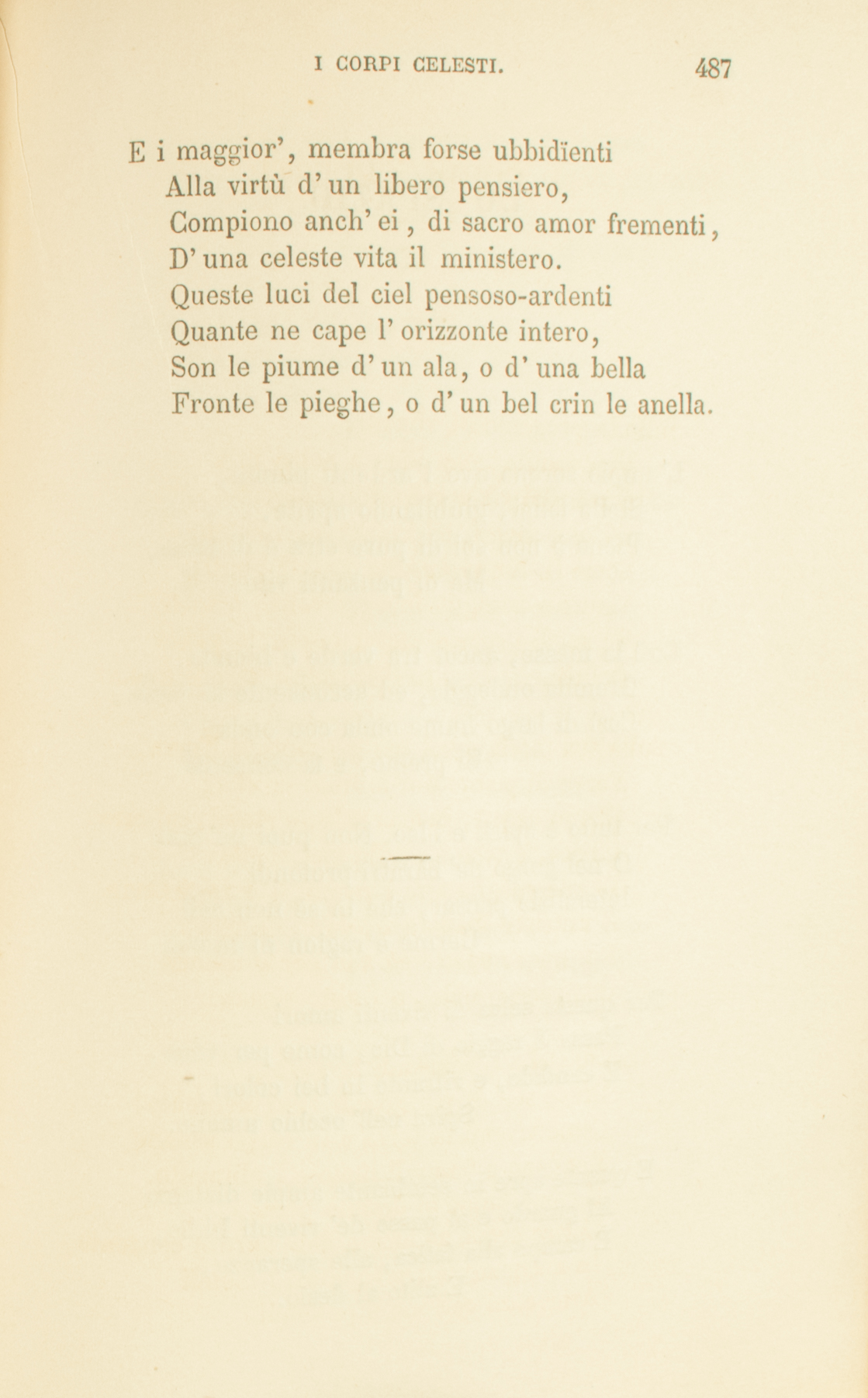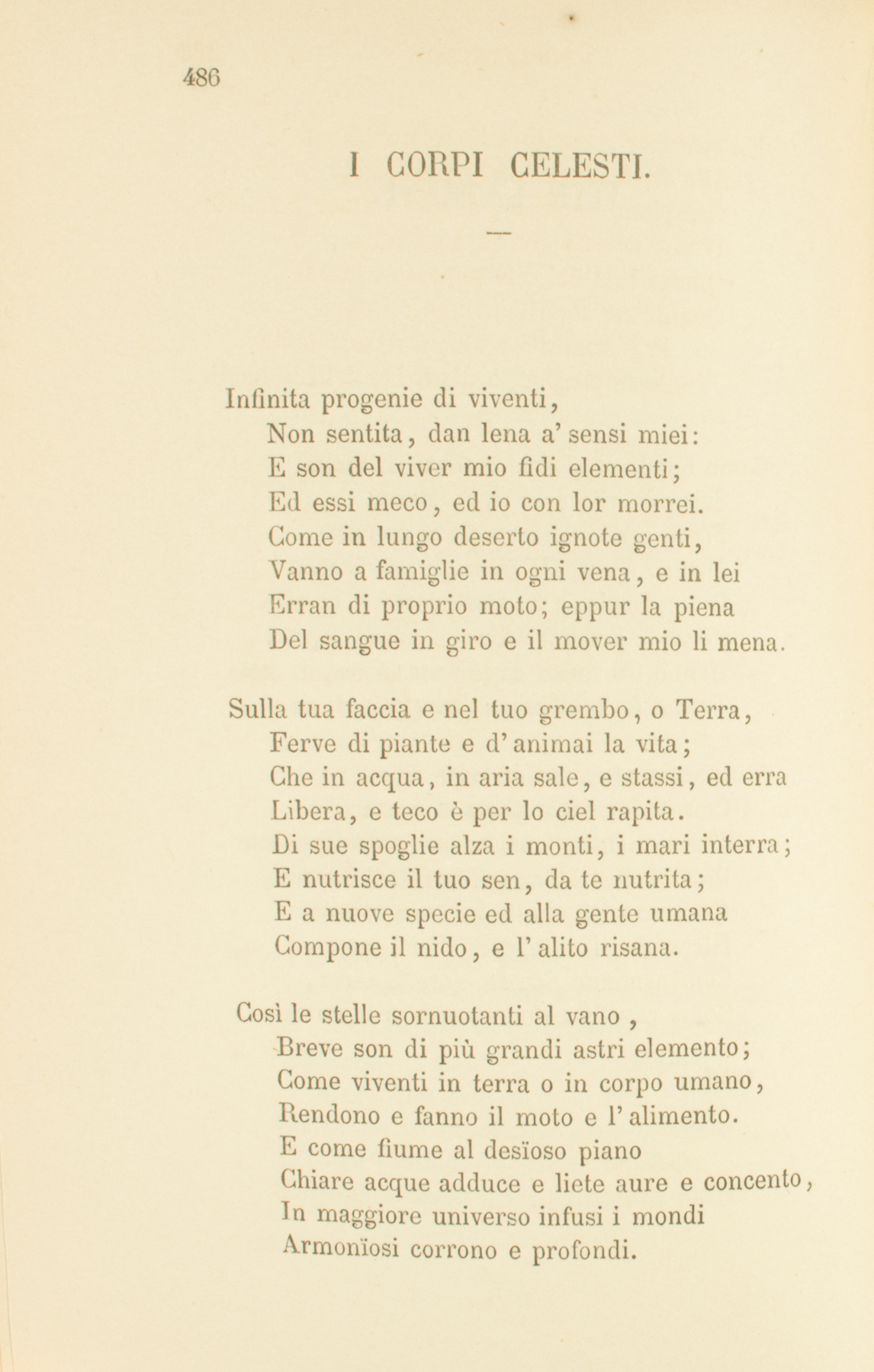 Infinita progenie di viventi,Non sentita, dan lena a’ sensi miei:E son del viver mio fidi elementi;Ed essi meco, ed io con lor morrei.Come in lungo deserto ignote genti,Vanno a famiglie in ogni vena, e in leiErran di proprio moto; eppur la pienaDel sangue in giro e il mover mio li mena.Sulla tua faccia e nel tuo grembo, o Terra,Ferve di piante e d’animai la vita;Che in acqua, in aria sale, e stassi, ed erraLibera, e teco è per lo ciel rapita.Di sue spoglie alza i monti, i mari interra;E nutrisce il tuo sen, da te nutrita;E a nuove specie ed alla gente umanaCompone il nido, e l’alito risana.Così le stelle sornuotanti al vano,Breve son di più grandi astri elemento;Come viventi in terra o in corpo umano,Rendono e fanno il moto e l’alimento.E come fiume al desïoso pianoChiare acque adduce e liete aure e concento,In maggiore universo infusi i mondiArmonïosi corrono e profondi.E i maggior’, membra forse ubbidïentiAlla virtù d’un libero pensiero,Compiono anch’ei, di sacro amor frementi,D’una celeste vita il ministero.Queste luci del ciel pensoso-ardentiQuante ne cape l’orizzonte intero,Son le piume d’un ala, o d’una bellaFronte le pieghe, o d’un bel crin le anella.