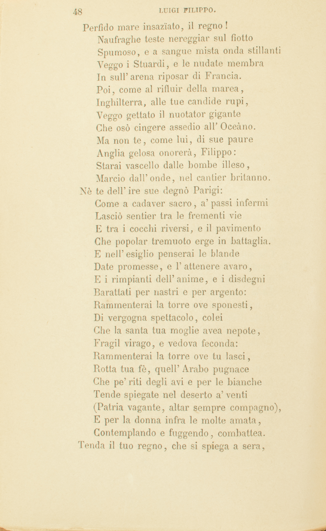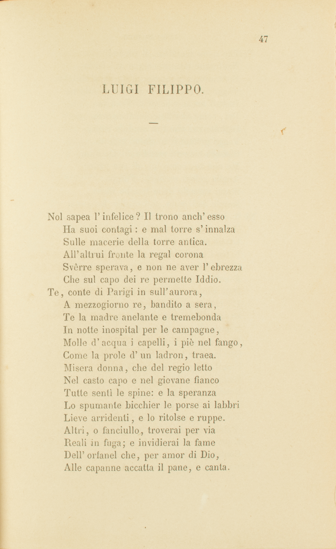 Nol sapea l’infelice? Il trono anch’essoHa suoi contagi: e mal torre s’innalzaSulle macerie della torre antica.All’altrui fronte la regal coronaSvêrre sperava, e non ne aver l’ebrezzaChe sul capo dei re permette Iddio.Te, conte di Parigi in sull’aurora,A mezzogiorno re, bandito a sera,Te la madre anelante e tremebondaIn notte inospital per le campagne,Molle d’acqua i capelli, i piè nel fango,Come la prole d’un ladron, traea.Misera donna, che del regio lettoNel casto capo e nel giovane fiancoTutte sentì le spine: e la speranzaLo spumante bicchier le porse ai labbriLieve arridenti, e lo ritolse e ruppe.Altri, o fanciullo, troverai per viaReali in fuga; e invidierai la fameDell’orfanel che, per amor di Dio,Alle capanne accatta il pane, e canta.Perfido mare insazïato, il regno!Naufraghe teste nereggiar sul fiottoSpumoso, e a sangue mista onda stillantiVeggo i Stuardi, e le nudate membraIn sull’arena riposar di Francia.Poi, come al rifluir della marea,Inghilterra, alle tue candide rupi,Veggo gettato il nuotator giganteChe osò cingere assedio all’Oceàno.Ma non te, come lui, di sue paureAnglia gelosa onorerà, Filippo:Starai vascello dalle bombe illeso,Marcio dall’onde, nel cantier britanno.Nè te dell’ire sue degnò Parigi:Come a cadaver sacro, a’ passi infermiLasciò sentier tra le frementi vieE tra i cocchi riversi, e il pavimentoChe popolar tremuoto erge in battaglia.E nell’esiglio penserai le blandeDate promesse, e l’attenere avaro,E i rimpianti dell’anime, e i disdegniBarattati per nastri e per argento:Rammenterai la torre ove sponesti,Di vergogna spettacolo, coleiChe la santa tua moglie avea nepote,Fragil virago, e vedova feconda:Rammenterai la torre ove tu lasci,Rotta tua fè, quell’Arabo pugnaceChe pe’ riti degli avi e per le biancheTende spiegate nel deserto a’ venti(Patria vagante, altar sempre compagno),E per la donna infra le molte amata,Contemplando e fuggendo, combattea.Tenda il tuo regno, che si spiega a sera,E si ripiega il dì. Come di carroStrepito breve e polverìo, passasti.Passò la gloria tua, come l’odoreDe’ tuoi banchetti, e delle danze il giro:Ed or che la perdesti, il peso or sentiDella corona. Oh misero briacoPer diciott’anni, e di te stesso in bando,Al senno alfin ritorni. In Dio t’affisa.Il tuo prigion tel dice: è grande Iddio.In carcere, 15 marzo 1848.