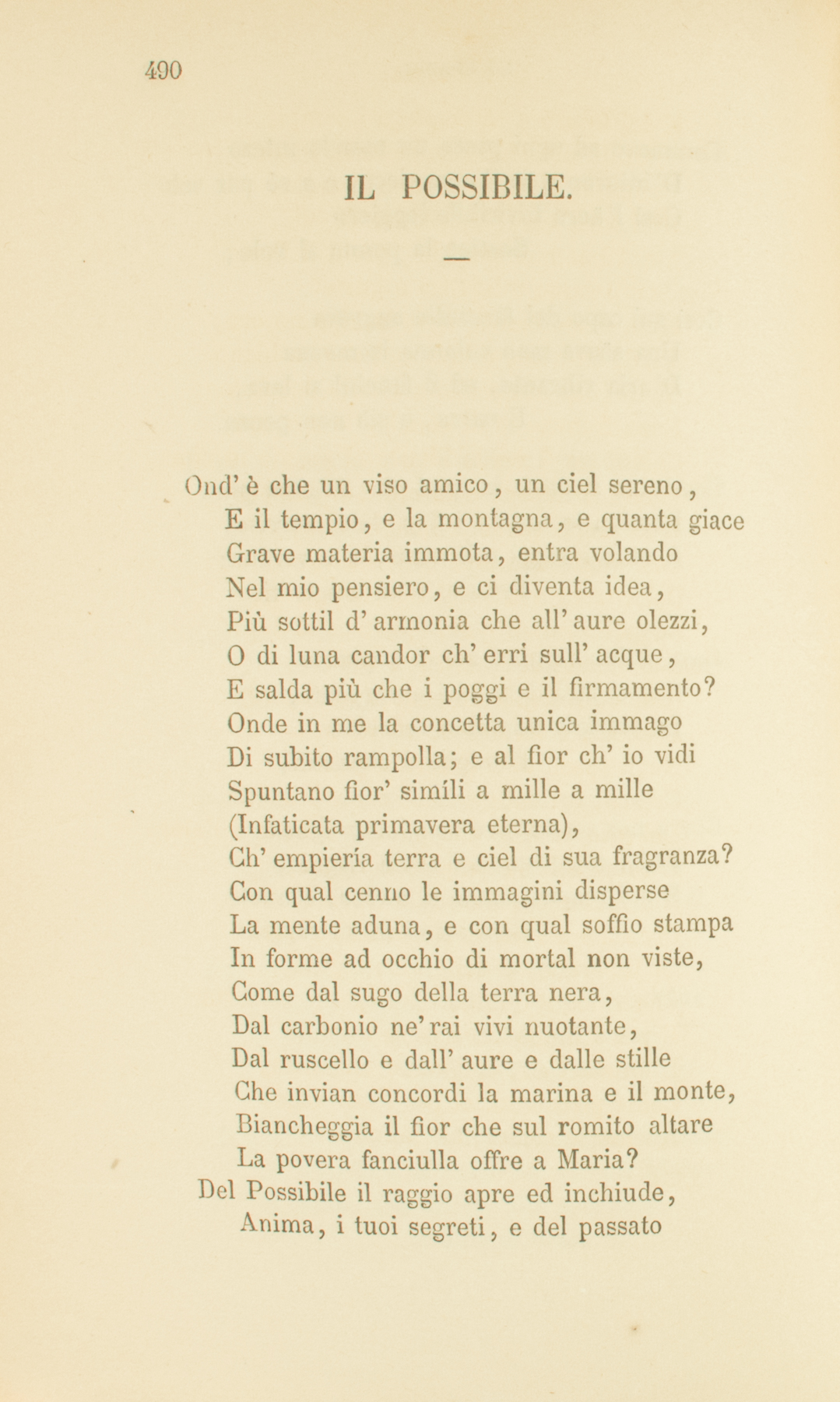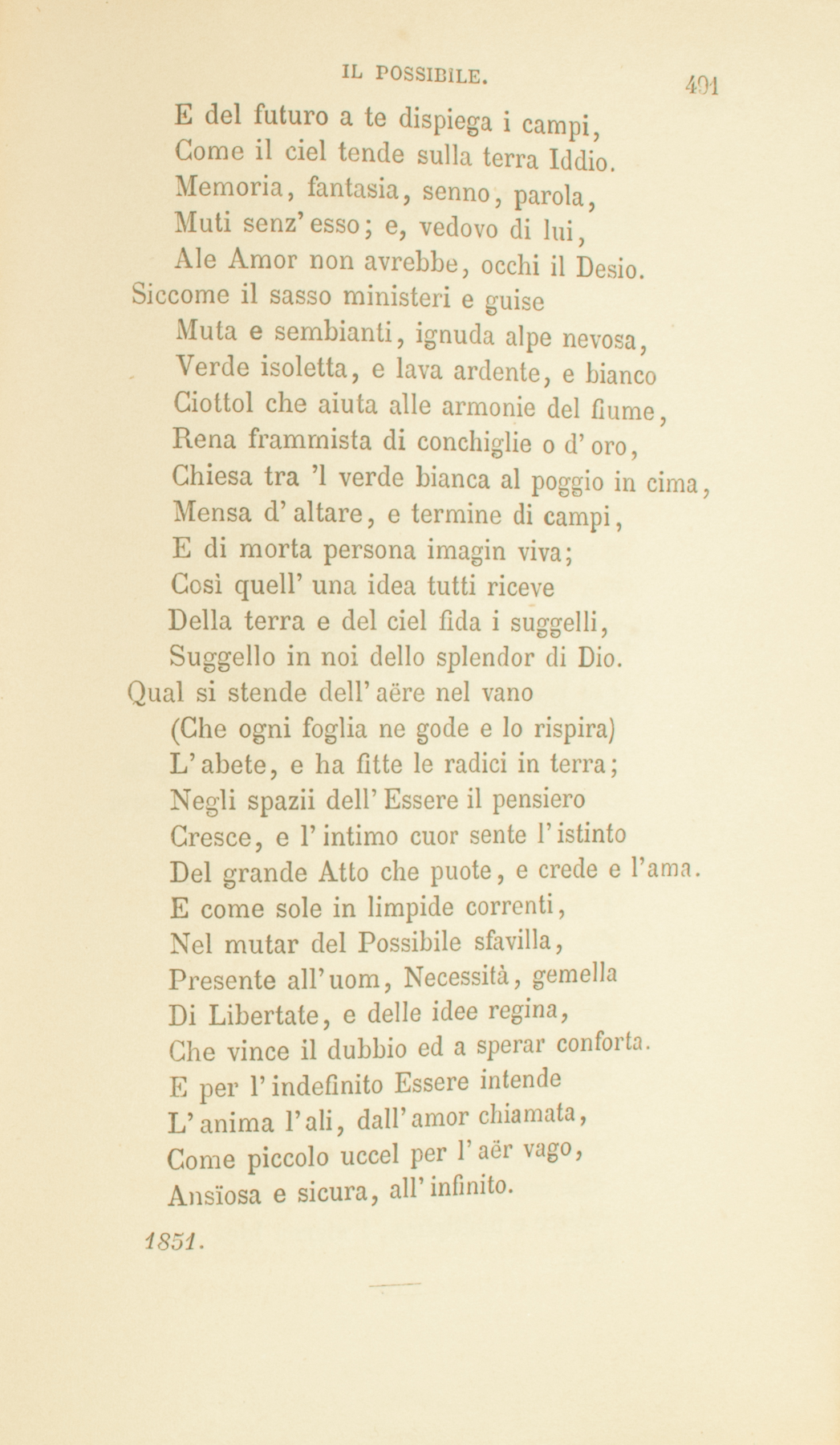 Ond’è che un viso amico, un ciel sereno,E il tempio, e la montagna, e quanta giaceGrave materia immota, entra volandoNel mio pensiero, e ci diventa idea,Più sottil d’armonia che all’aure olezzi,O di luna candor ch’erri sull’acque,E salda più che i poggi e il firmamento?Onde in me la concetta unica immagoDi subito rampolla; e al fior ch’io vidiSpuntano fior’ simíli a mille a mille(Infaticata primavera eterna),Ch’empiería terra e ciel di sua fragranza?Con qual cenno le immagini disperseLa mente aduna, e con qual soffio stampaIn forme ad occhio di mortal non viste,Come dal sugo della terra nera,Dal carbonio ne’ rai vivi nuotante,Dal ruscello e dall’aure e dalle stilleChe invian concordi la marina e il monte,Biancheggia il fior che sul romito altareLa povera fanciulla offre a Maria?Del Possibile il raggio apre ed inchiude,Anima, i tuoi segreti, e del passatoE del futuro a te dispiega i campi,Come il ciel tende sulla terra Iddio.Memoria, fantasia, senno, parola,Muti senz’esso; e, vedovo di lui,Ale Amor non avrebbe, occhi il Desio.Siccome il sasso ministeri e guiseMuta e sembianti, ignuda alpe nevosa,Verde isoletta, e lava ardente, e biancoCiottol che aiuta alle armonie del fiume,Rena frammista di conchiglie o d’oro,Chiesa tra ’l verde bianca al poggio in cima,Mensa d’altare, e termine di campi,E di morta persona imagin viva;Così quell’una idea tutti riceveDella terra e del ciel fida i suggelli,Suggello in noi dello splendor di Dio.Qual si stende dell’aëre nel vano(Che ogni foglia ne gode e lo rispira)L’abete, e ha fitte le radici in terra;Negli spazii dell’Essere il pensieroCresce, e l’intimo cuor sente l’istintoDel grande Atto che puote, e crede e l’ama.E come sole in limpide correnti,Nel mutar del Possibile sfavilla,Presente all’uom, Necessità, gemellaDi Libertate, e delle idee regina,Che vince il dubbio ed a sperar conforta.E per l’indefinito Essere intendeL’anima l’ali, dall’amor chiamata,Come piccolo uccel per l’aër vago,Ansïosa e sicura, all’infinito.1851.