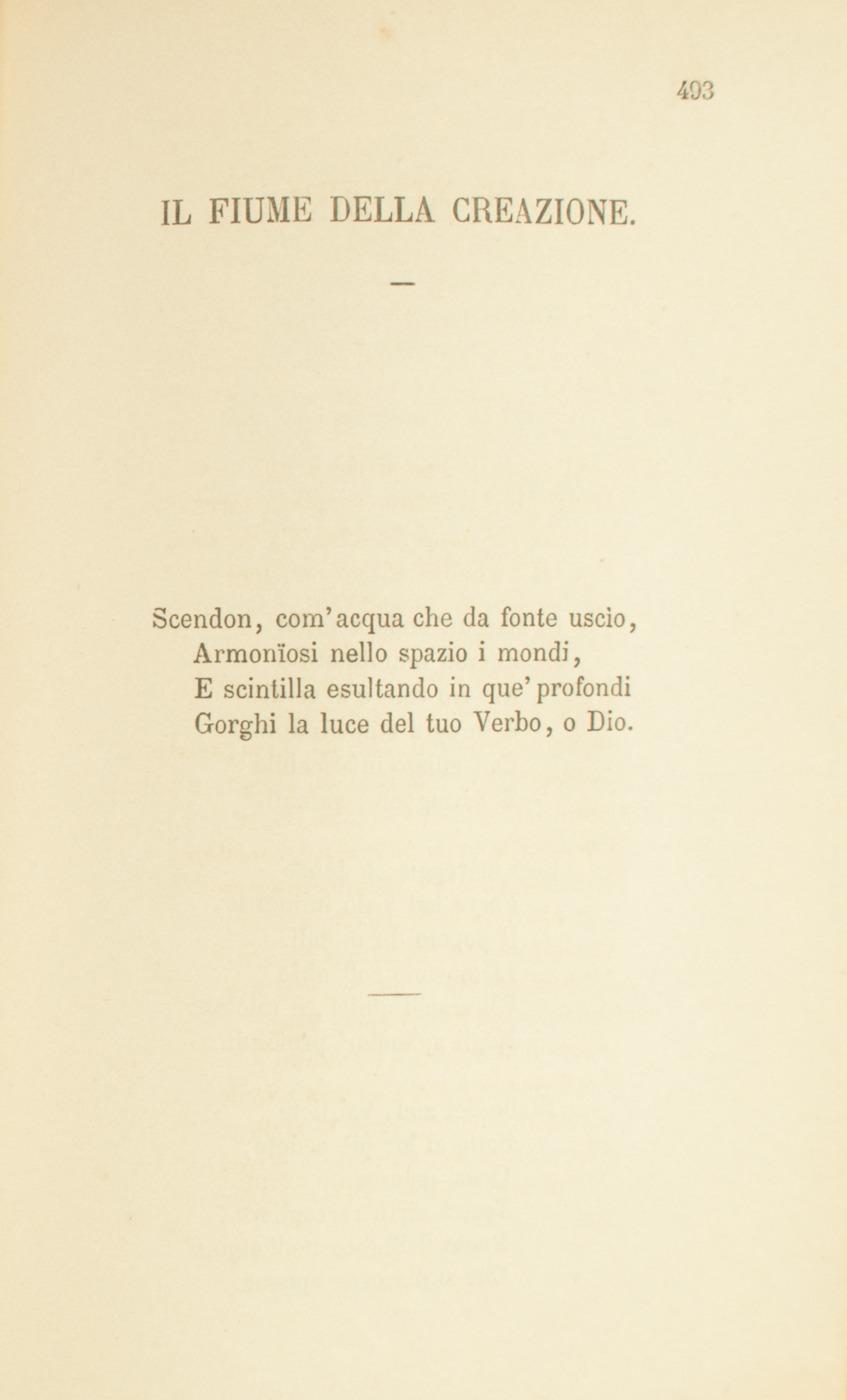 Scendon, com’acqua che da fonte uscio,Armonïosi nello spazio i mondi,E scintilla esultando in que’ profondiGorghi la luce del tuo Verbo, o Dio.